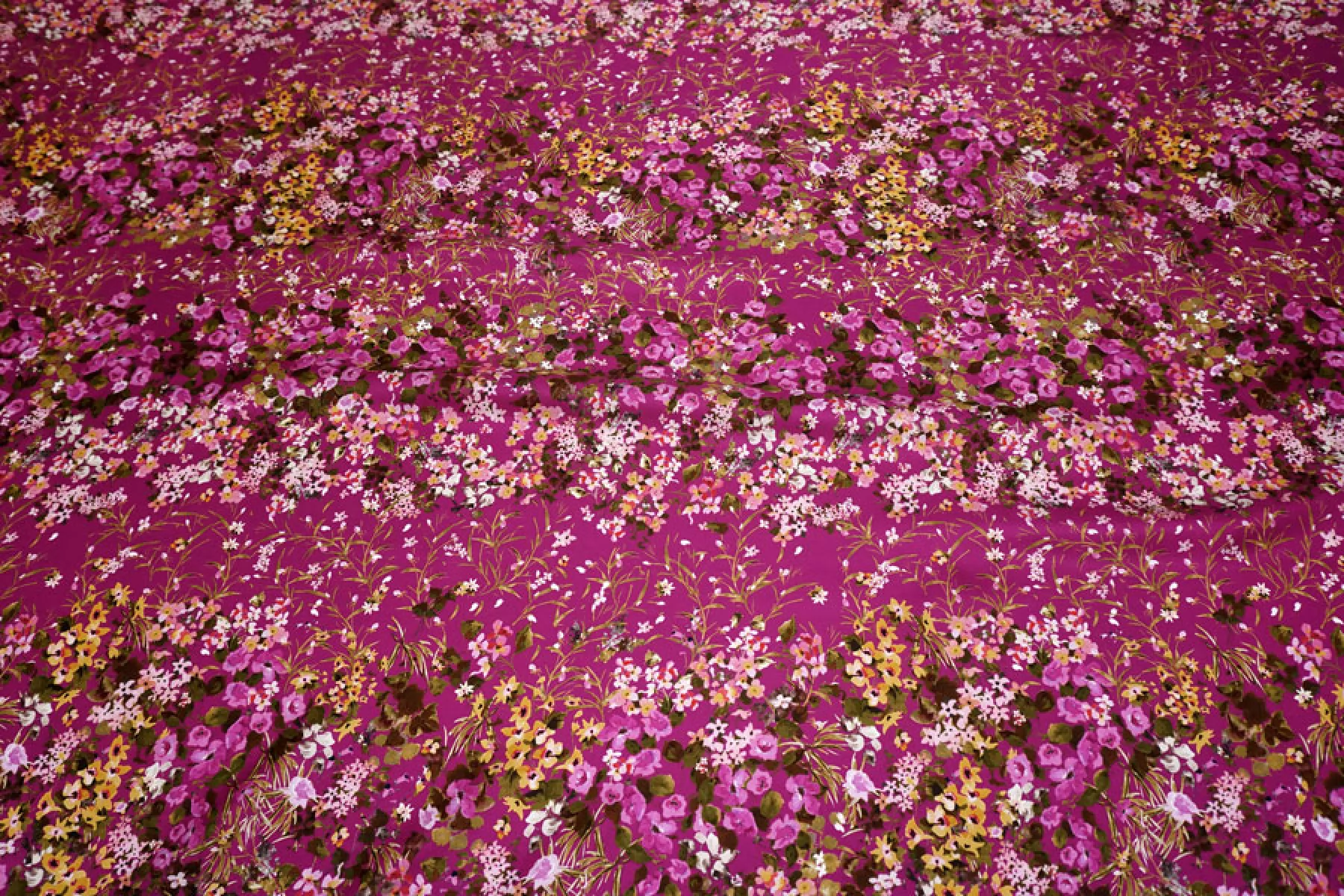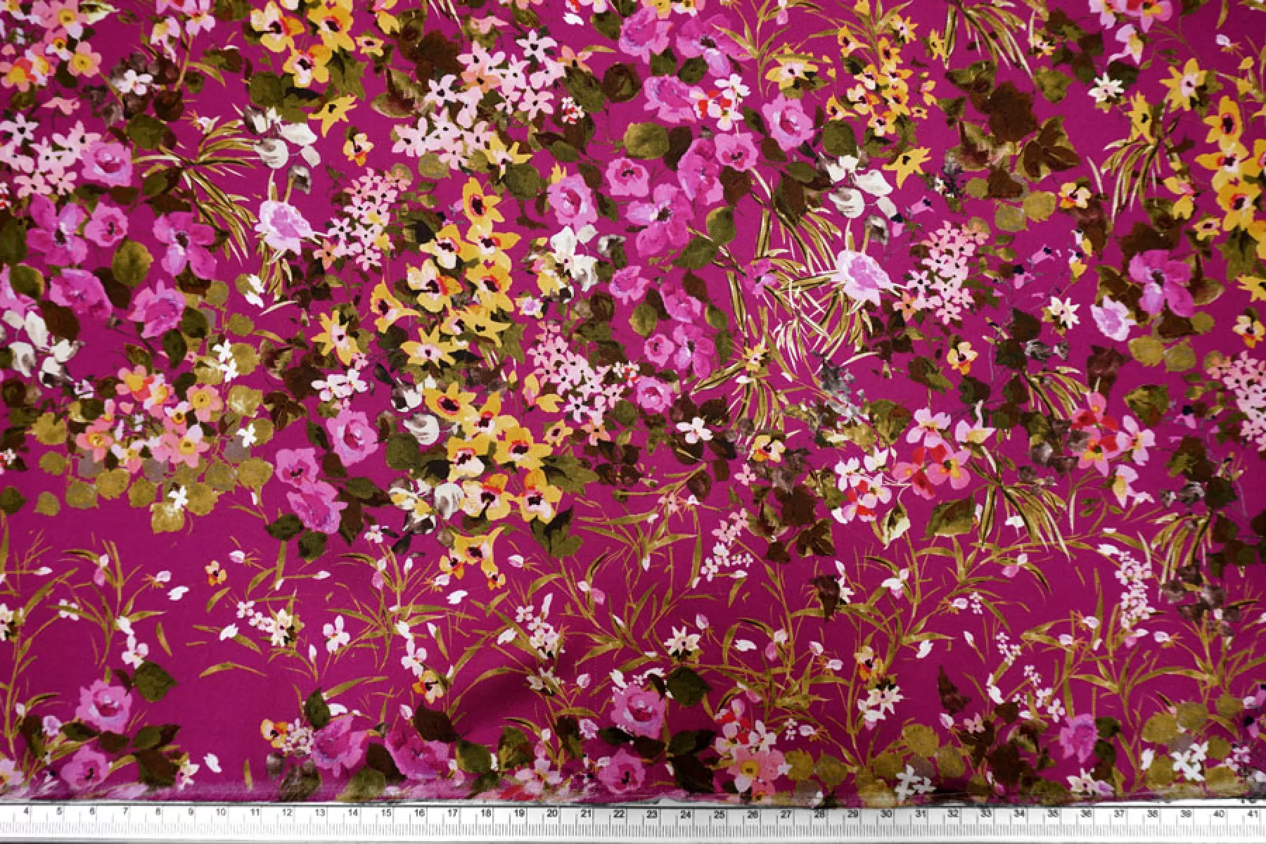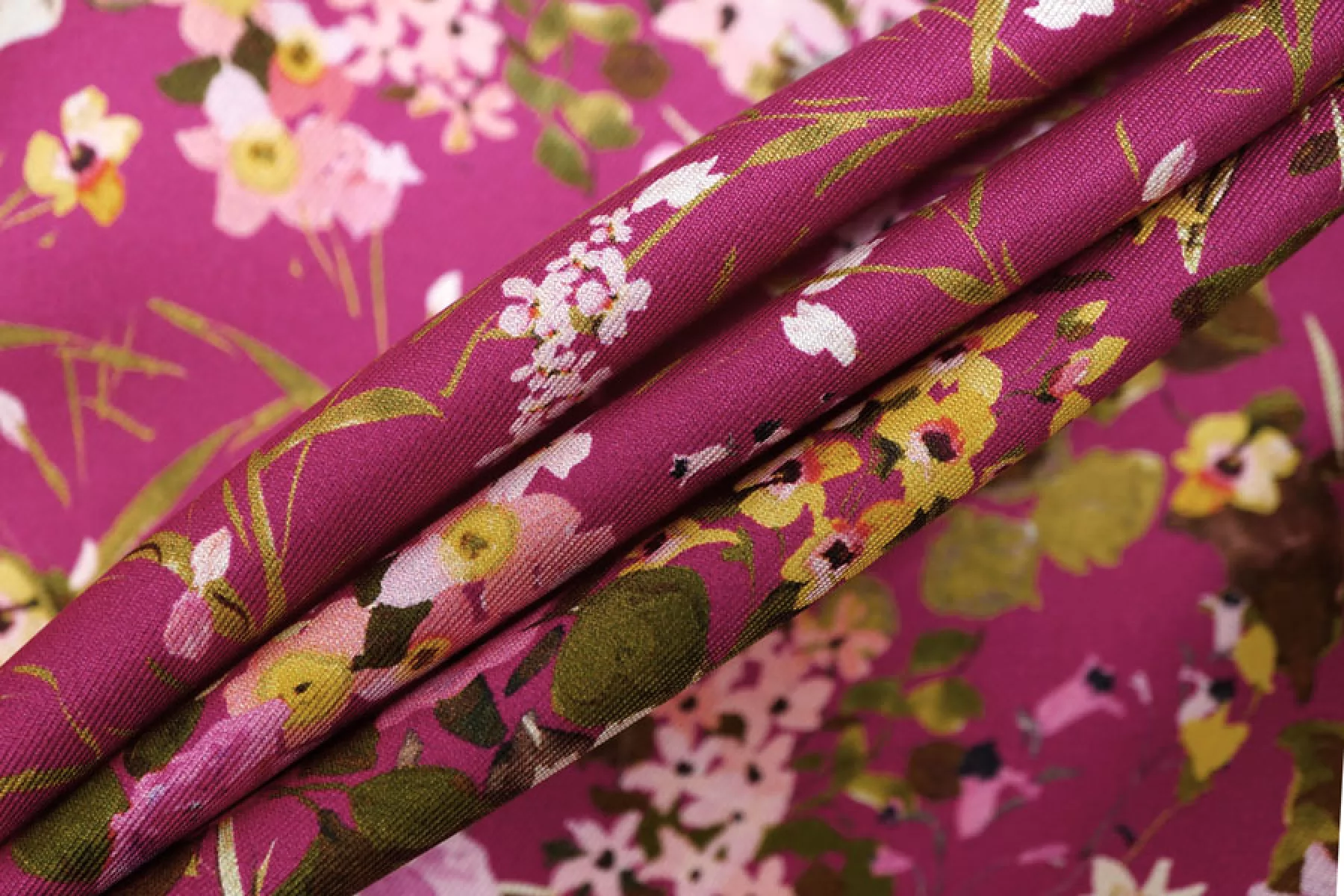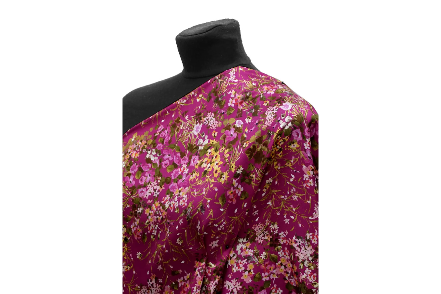 Твиловый шёлк от Max Mara с красивым цветочным принтом на ярком фоне цвета фуксии. Очень приятный и мягкий, гладкий. Достаточно плотный, пластичный, струящийся, легкий. Обладает красивым шелковым лоском. Не тянется. Не просвечивает. Мнется слабо. Форму не держит, но красиво смотрится в драпировке. Прекрасный легкий вариант на блузки, платья и юбки. Уход за шёлком деликатный.
