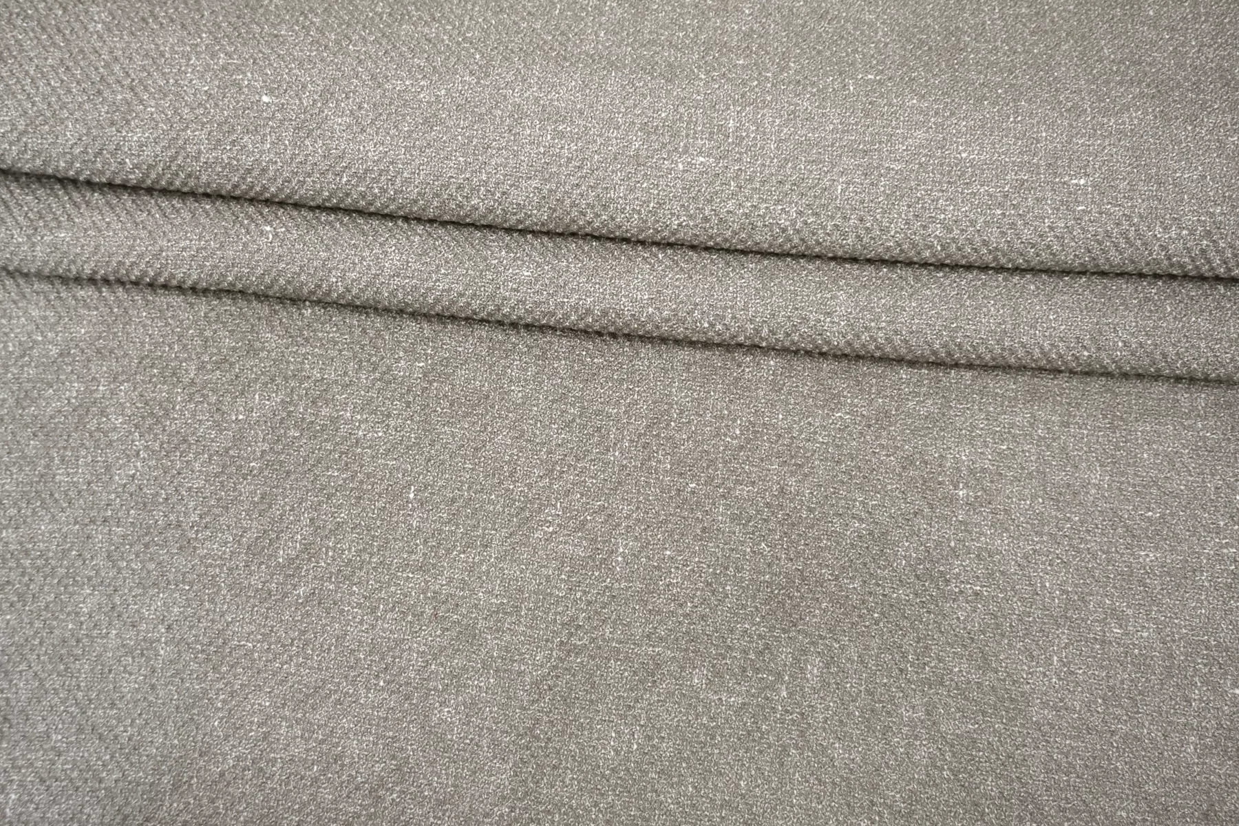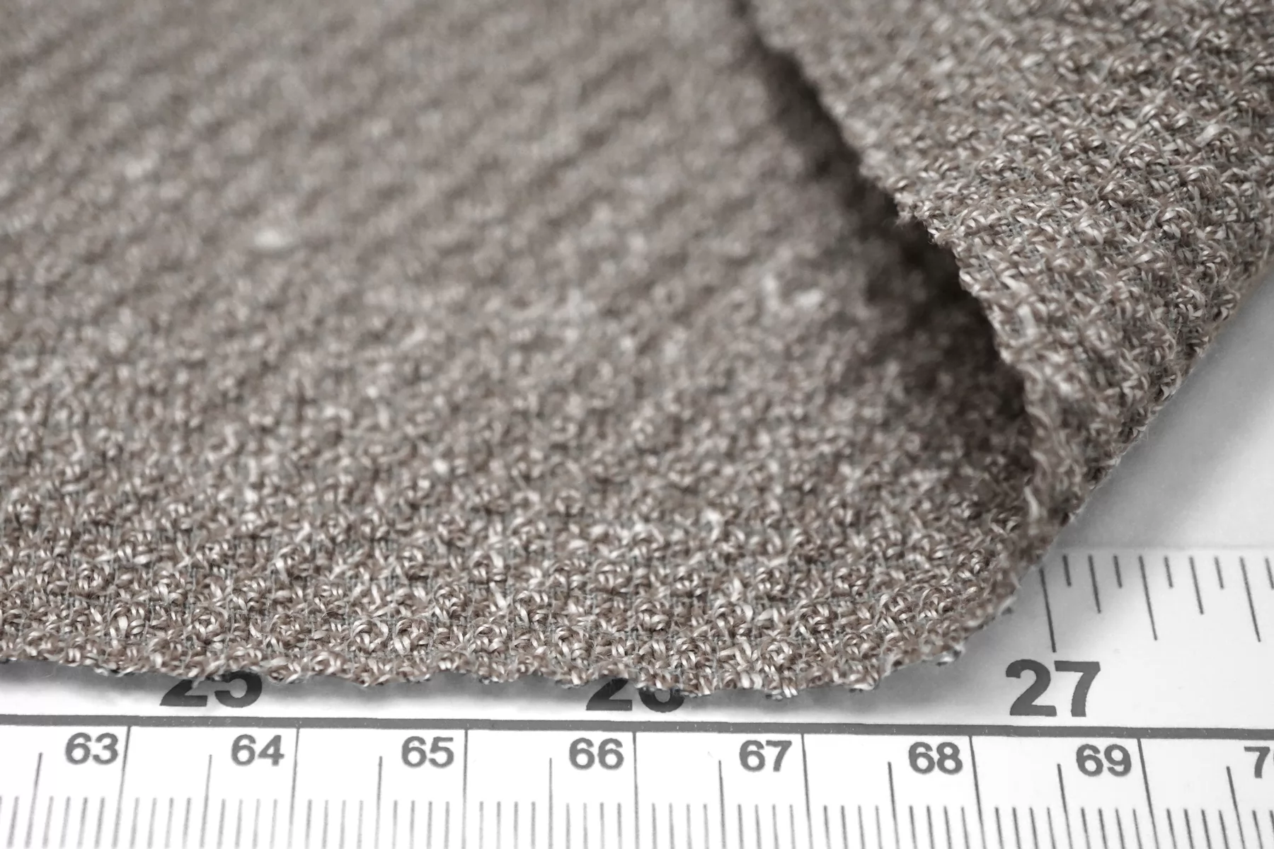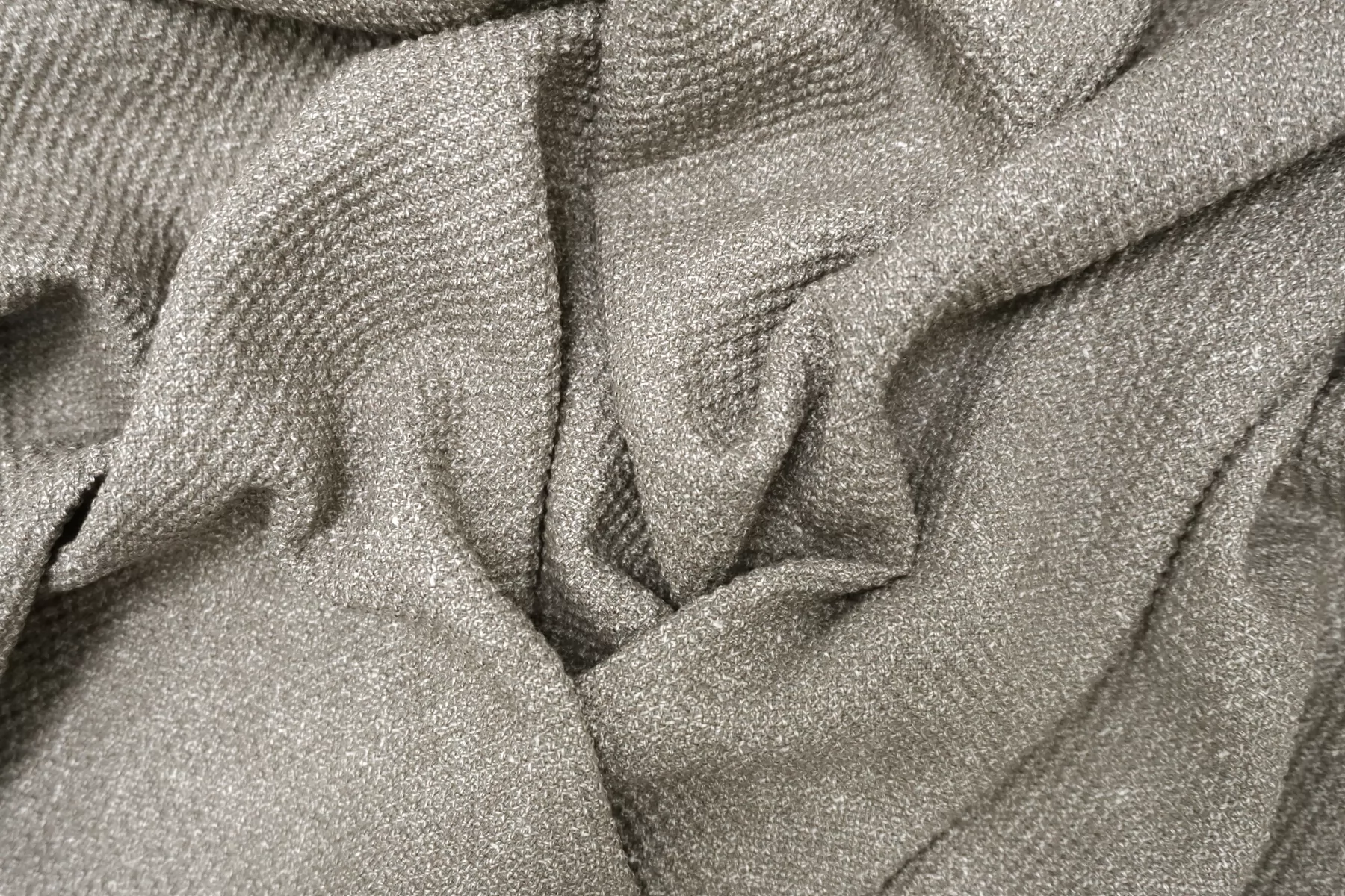 Сирсакер из вискозы со льном, нити бежевого, серого и белого цвета. Фактурный, немного шероховатый тактильно. Немного просвечивает в дырочки плетения, но в изделии заметно не будет. Плетение немного тянется. Пластичный, форму держит умеренно. Подойдет для пошива платья, летнего костюма расслабленного кроя, юбки. Учитывайте усадку материала.
