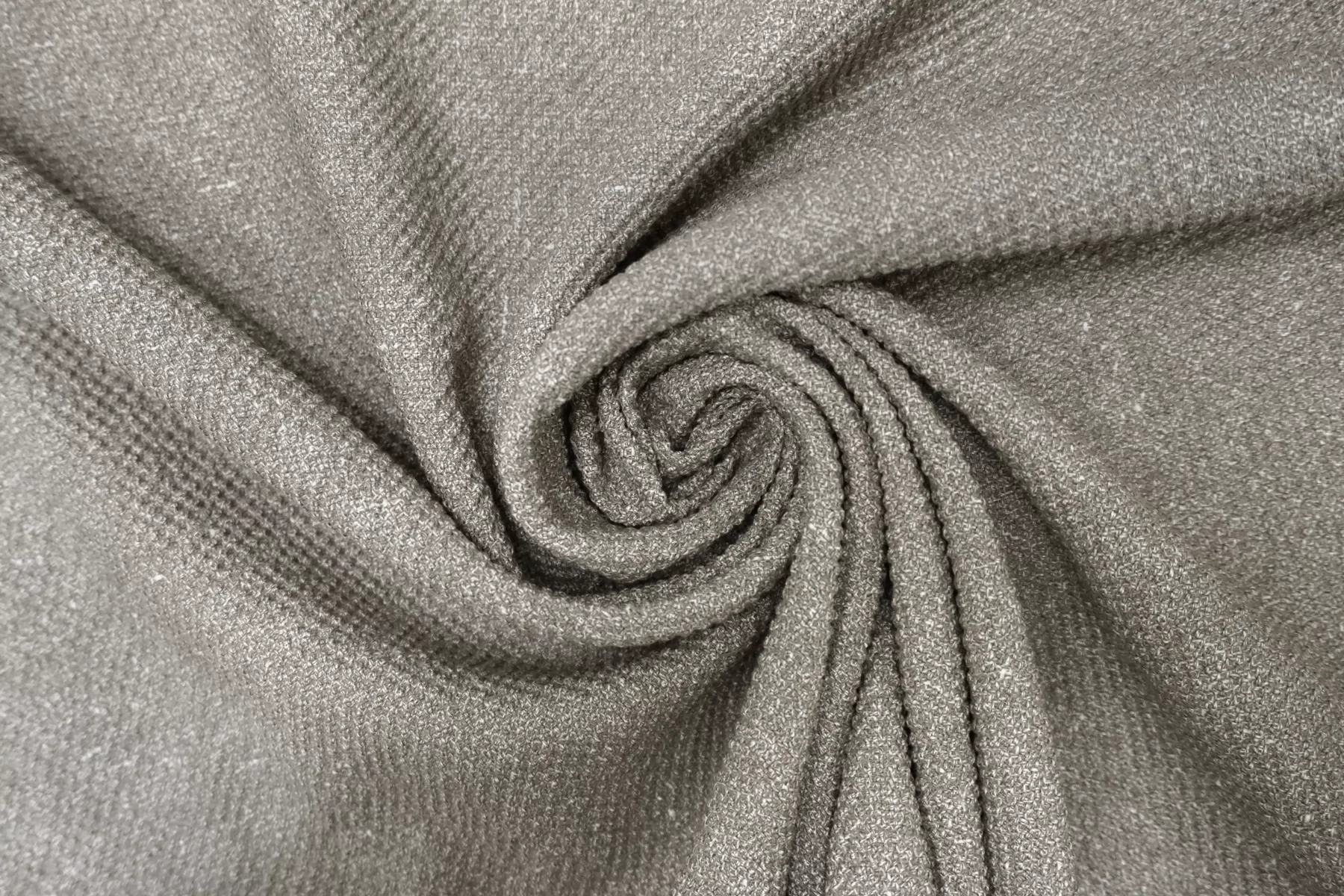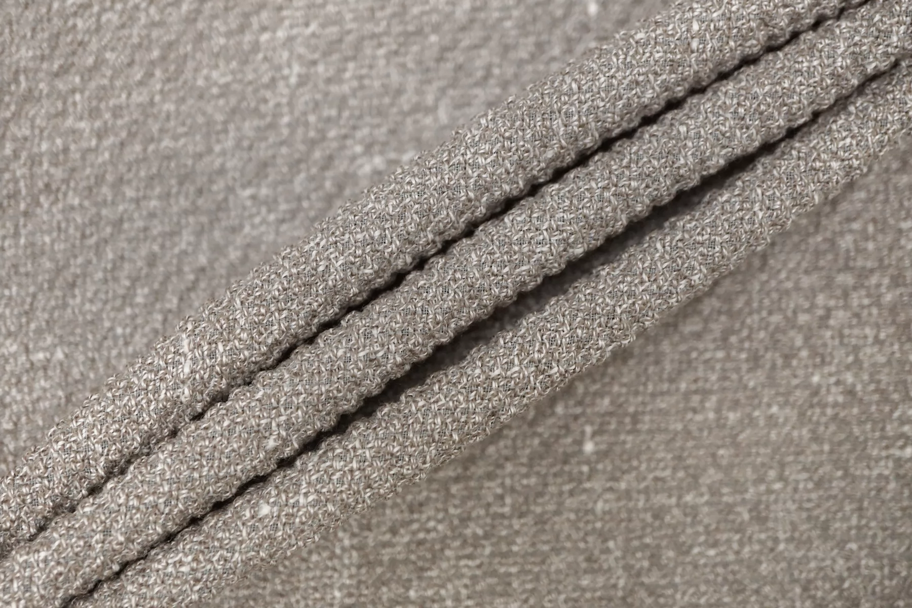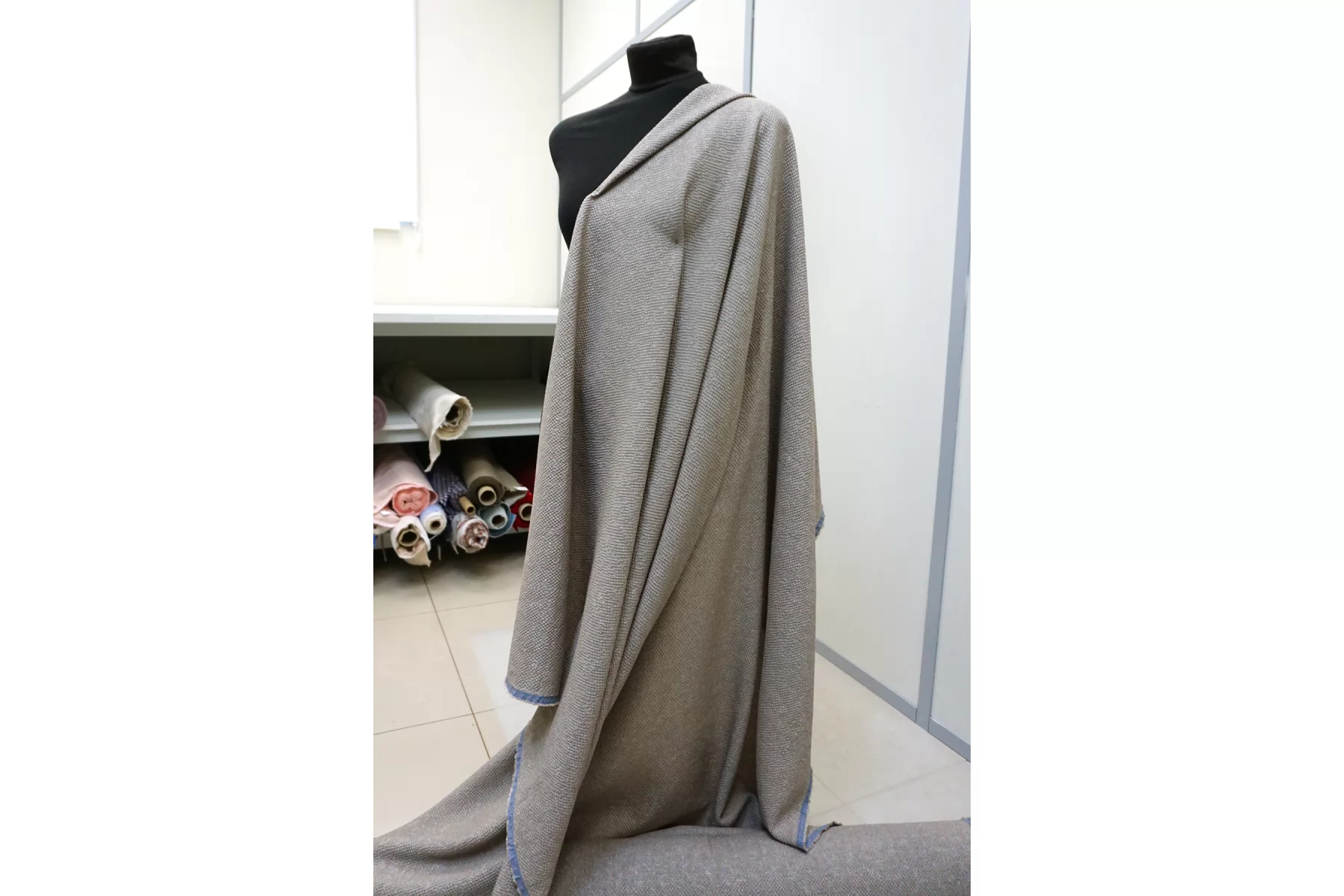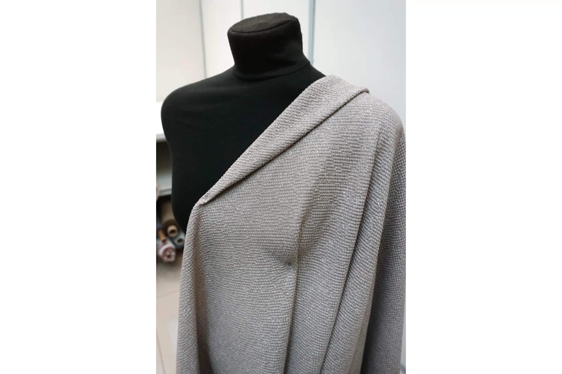 Сирсакер из вискозы со льном, нити бежевого, серого и белого цвета. Фактурный, немного шероховатый тактильно. Немного просвечивает в дырочки плетения, но в изделии заметно не будет. Плетение немного тянется. Пластичный, форму держит умеренно. Подойдет для пошива платья, летнего костюма расслабленного кроя, юбки. Учитывайте усадку материала.