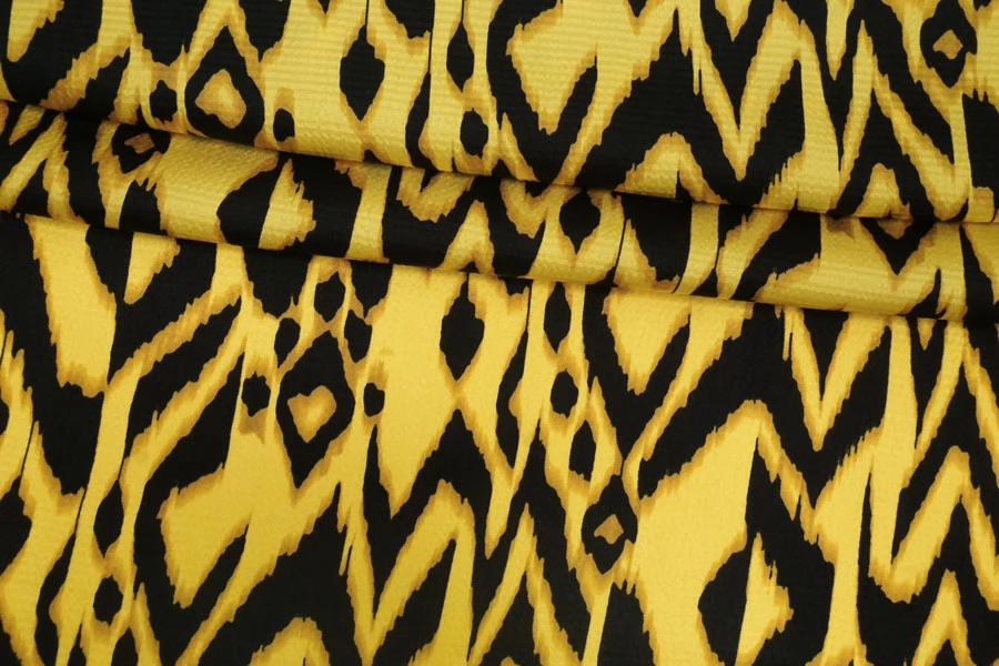Сирсакер из вискозы, с крупным абстрактным принтом: чёрный, жёлтый и охристый цвет. Присутствует атласный блеск, плотность плательно-блузочная. Гладкий, мягкий, приятный тактильно. Пластичная ткань, скользящая. Немного просвечивает силуэт. Не тянется. Немного мнется. Красива в движении. Форму не держит. Прекрасно подойдет на платья, блузки, юбки. При необходимости используйте подкладочный материал. Обязательно учитывайте усадку порядка 5-10%.