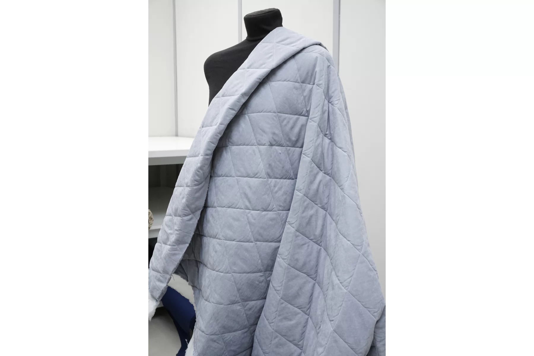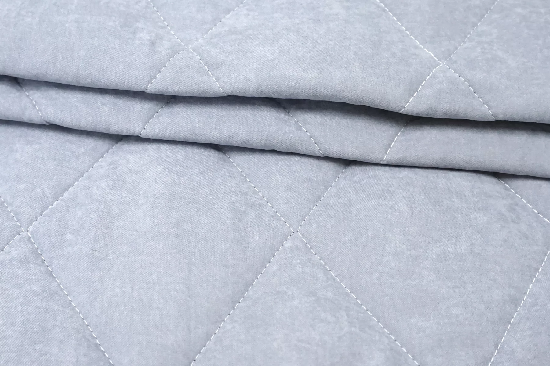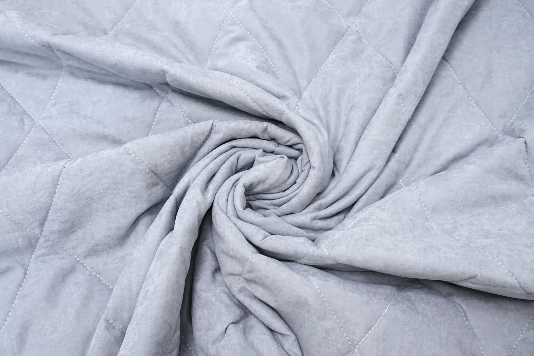 Прекрасная стежка светло-серого цвета. Двусторонняя, обе стороны с peach-эффектом, бархатистые тактильно. Воду не отталкивает. Простегана со слоем утеплителя. Неплохо держит форму, умеренной пластичности. Не тянется и немного сминается. Отличный вариант для куртки, комбинезона, жилета или пуховика.