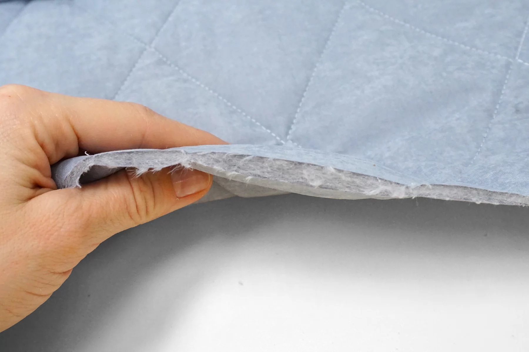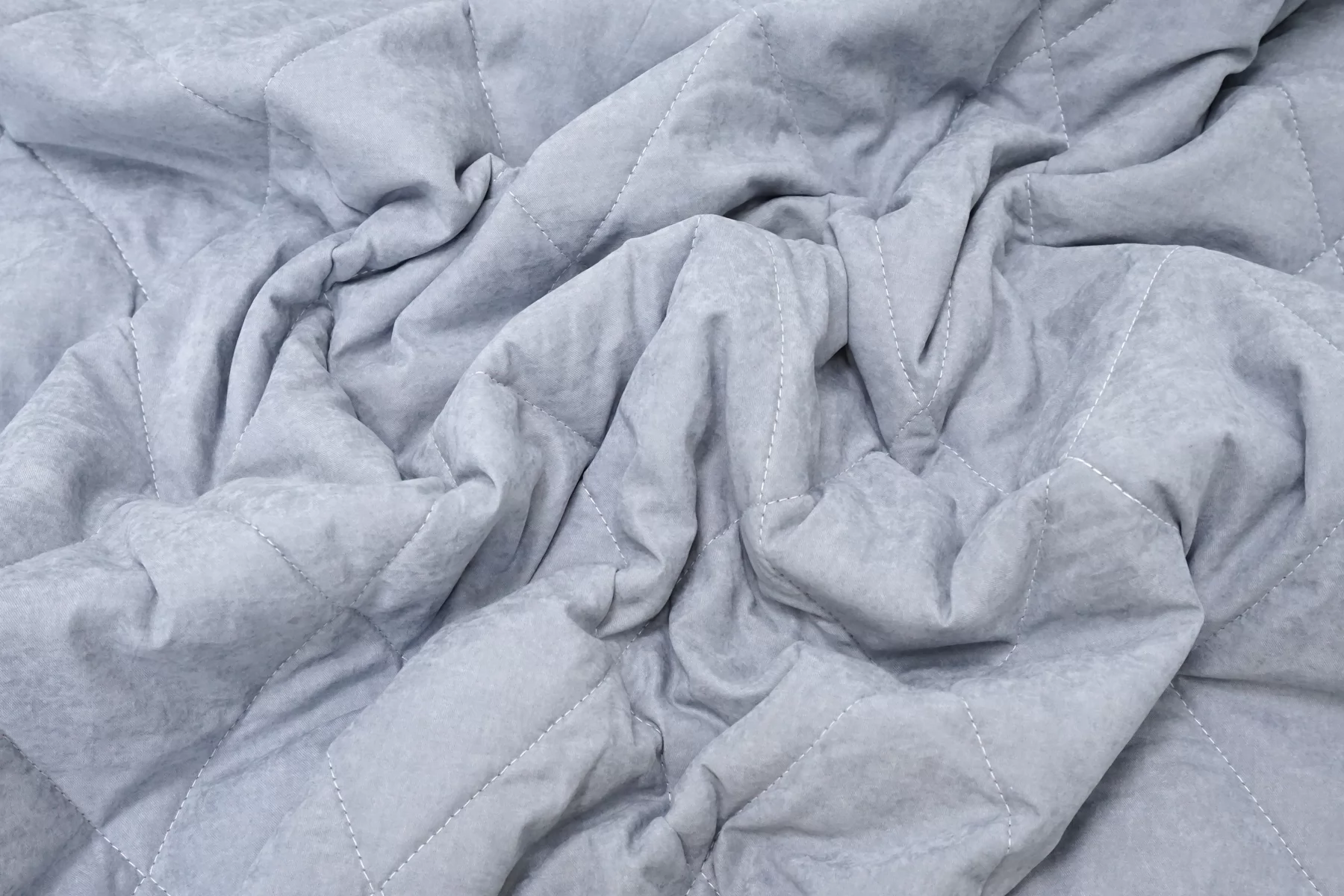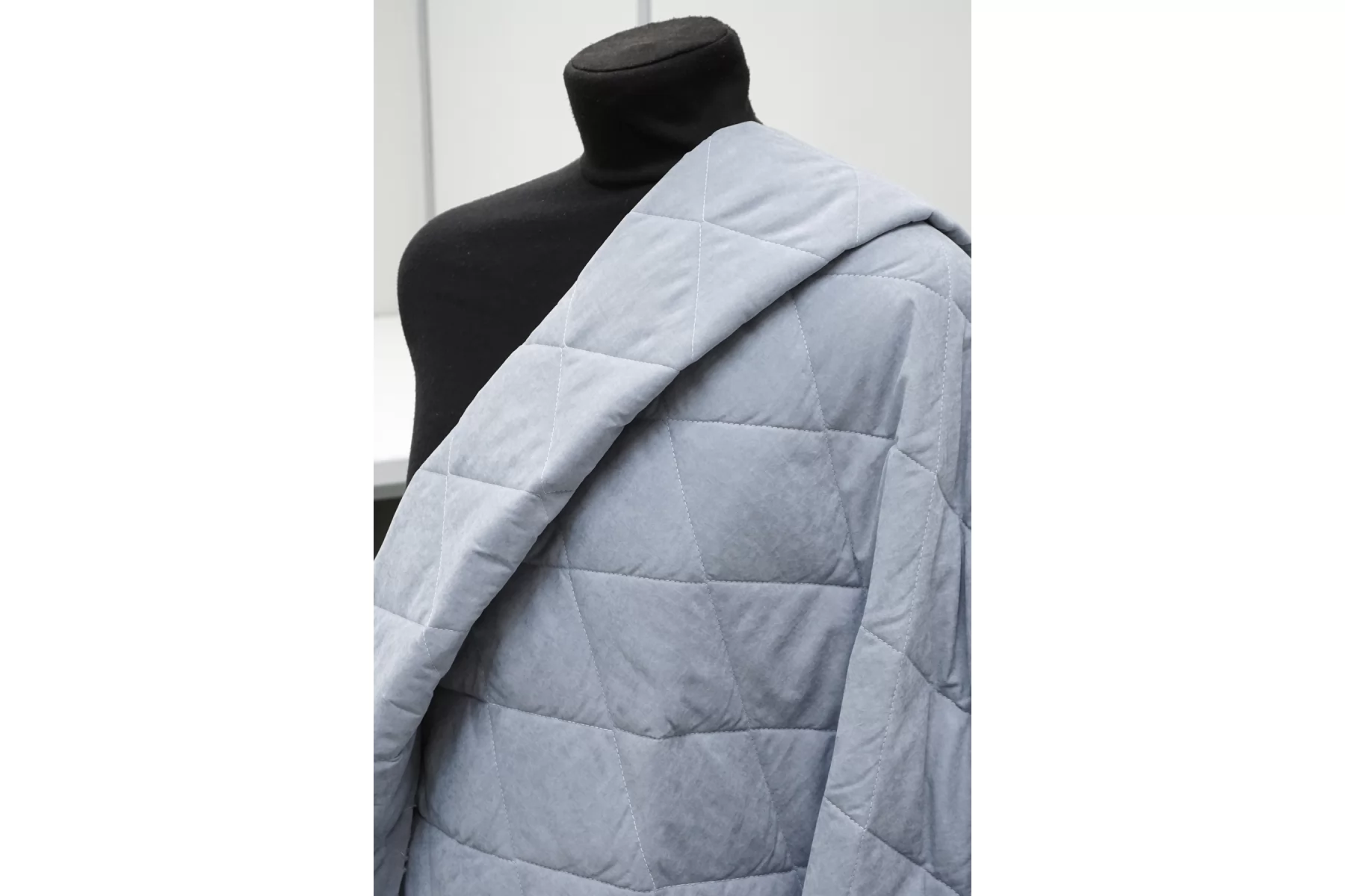 Прекрасная стежка светло-серого цвета. Двусторонняя, обе стороны с peach-эффектом, бархатистые тактильно. Воду не отталкивает. Простегана со слоем утеплителя. Неплохо держит форму, умеренной пластичности. Не тянется и немного сминается. Отличный вариант для куртки, комбинезона, жилета или пуховика.