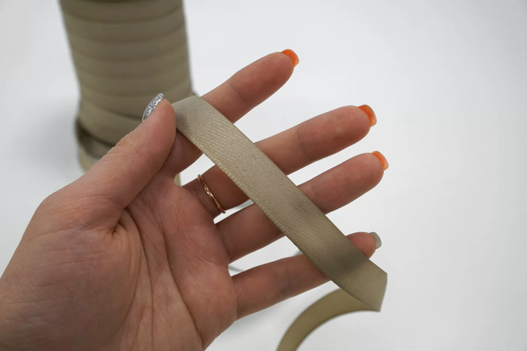 Тесьма брючная Kufner для подшива низа изделия, плотная, с усиленным краем. Цвет серо-бежевый с желтинкой, ширина 1,5 см. Цена за метр.
