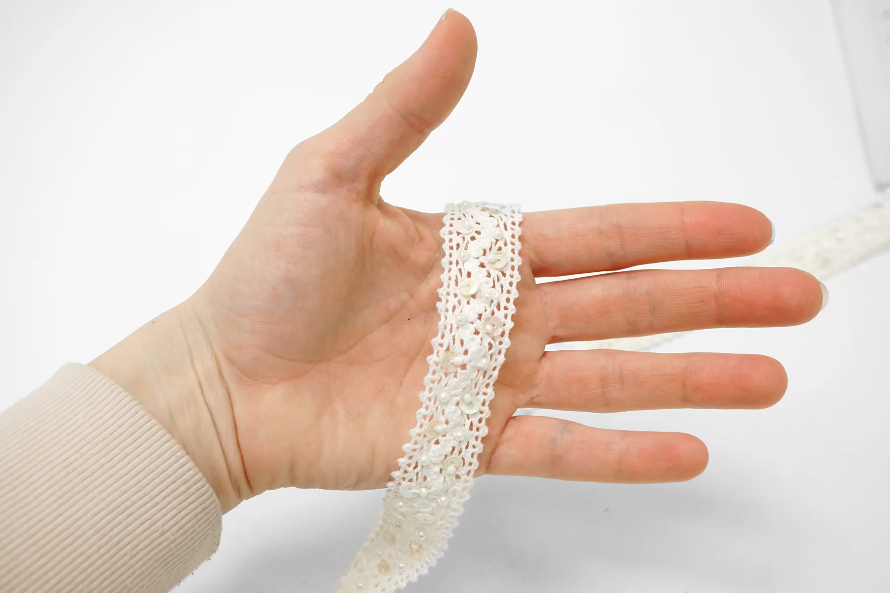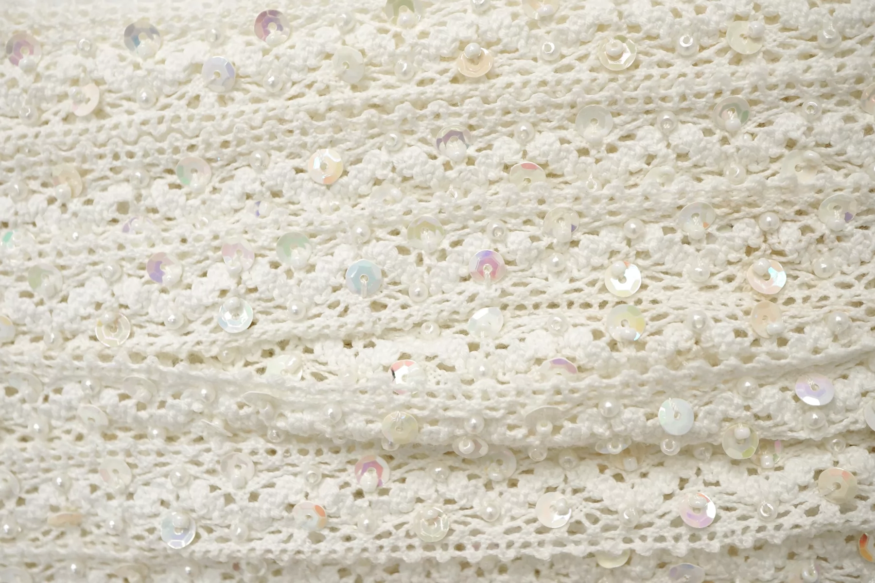 Итальянская декоративная тесьма бело-молочного цвета из хлопка с нашитыми белыми бусинами и перламутровыми пайетками. Мягкая, пластичная. Не тянется. Отлично подойдет для отделки одежды и аксессуаров.