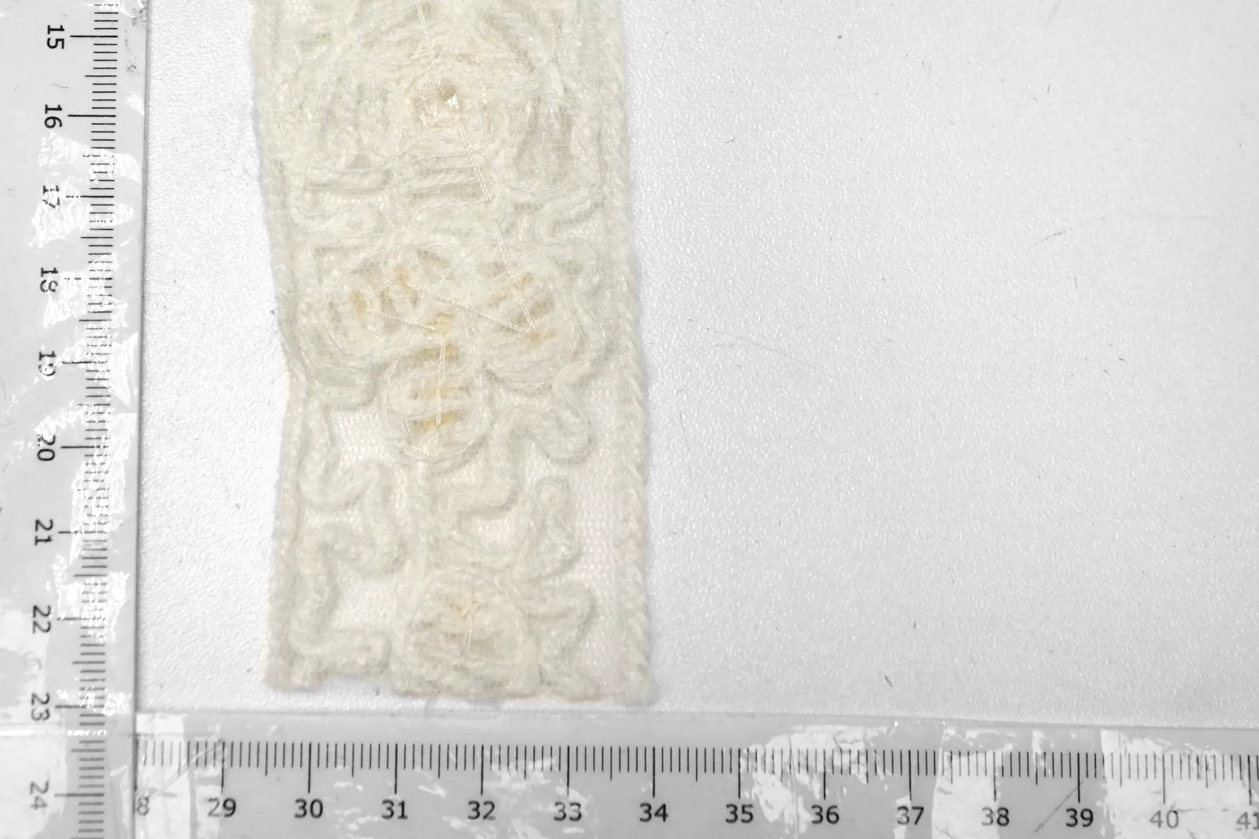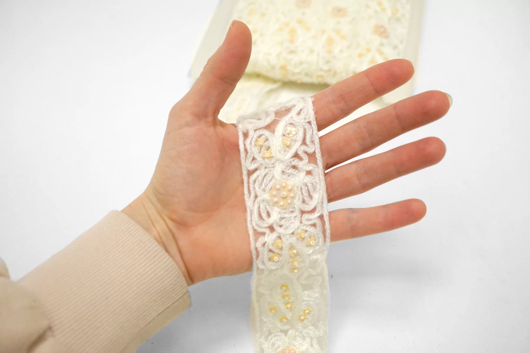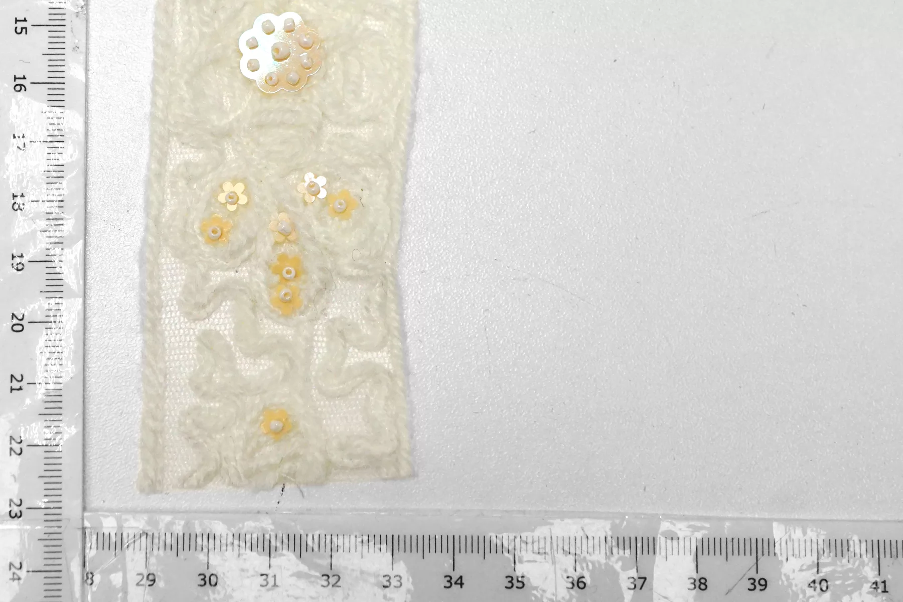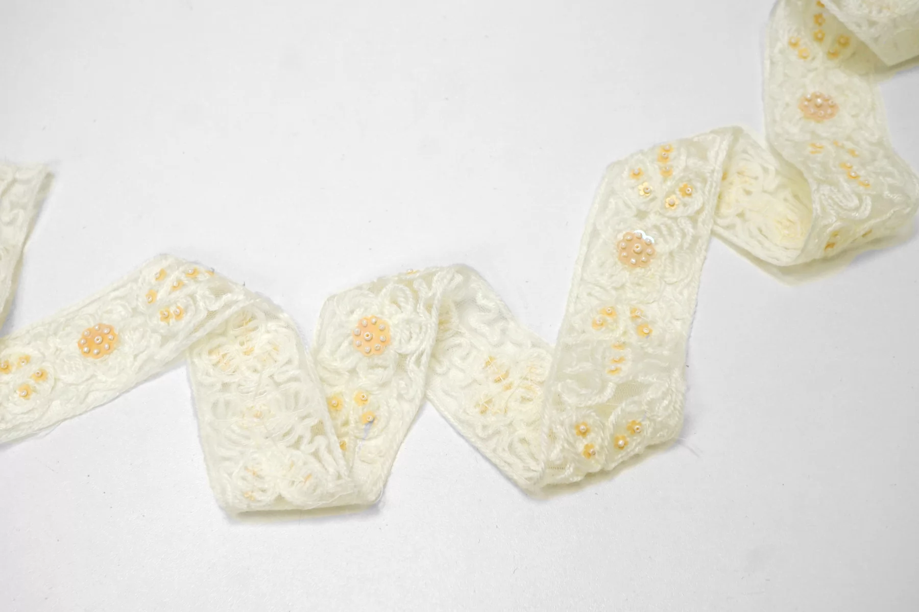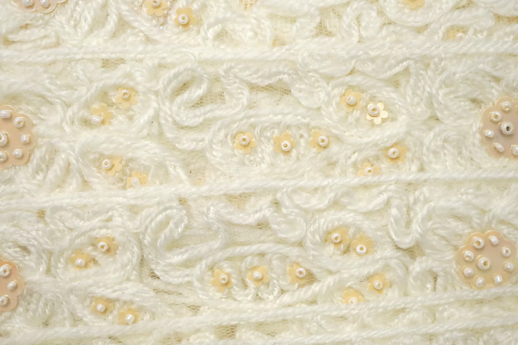 Итальянская декоративная тесьма молочно-белого цвета на сетке, нить пушистая напоминает шерсть расшита бежевыми пайетками-цветочками и белым бисером. Мягкая, пластичная. Не тянется. Отлично подойдет для отделки одежды и аксессуаров.