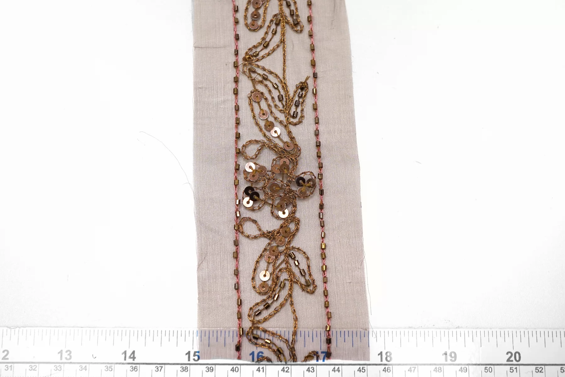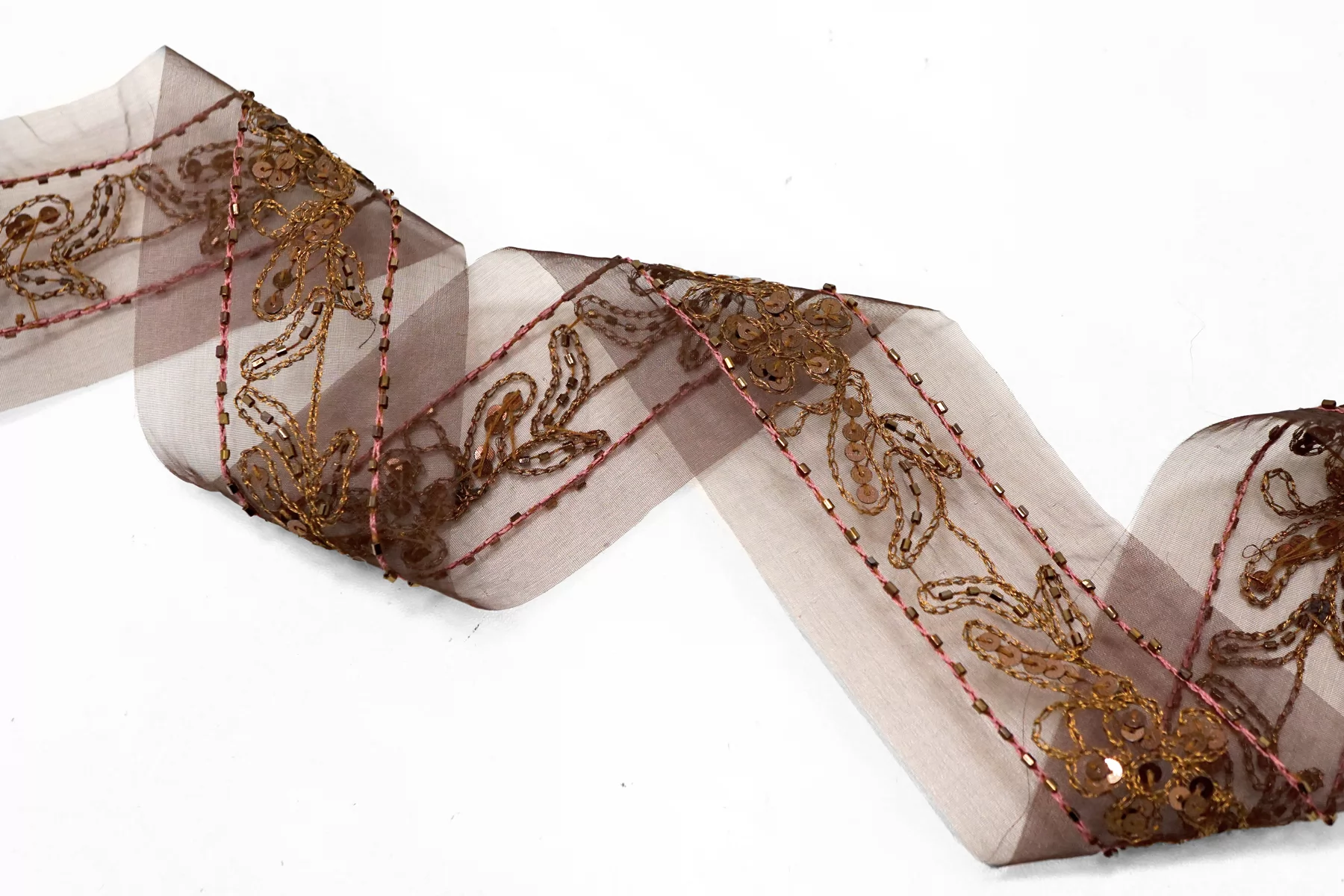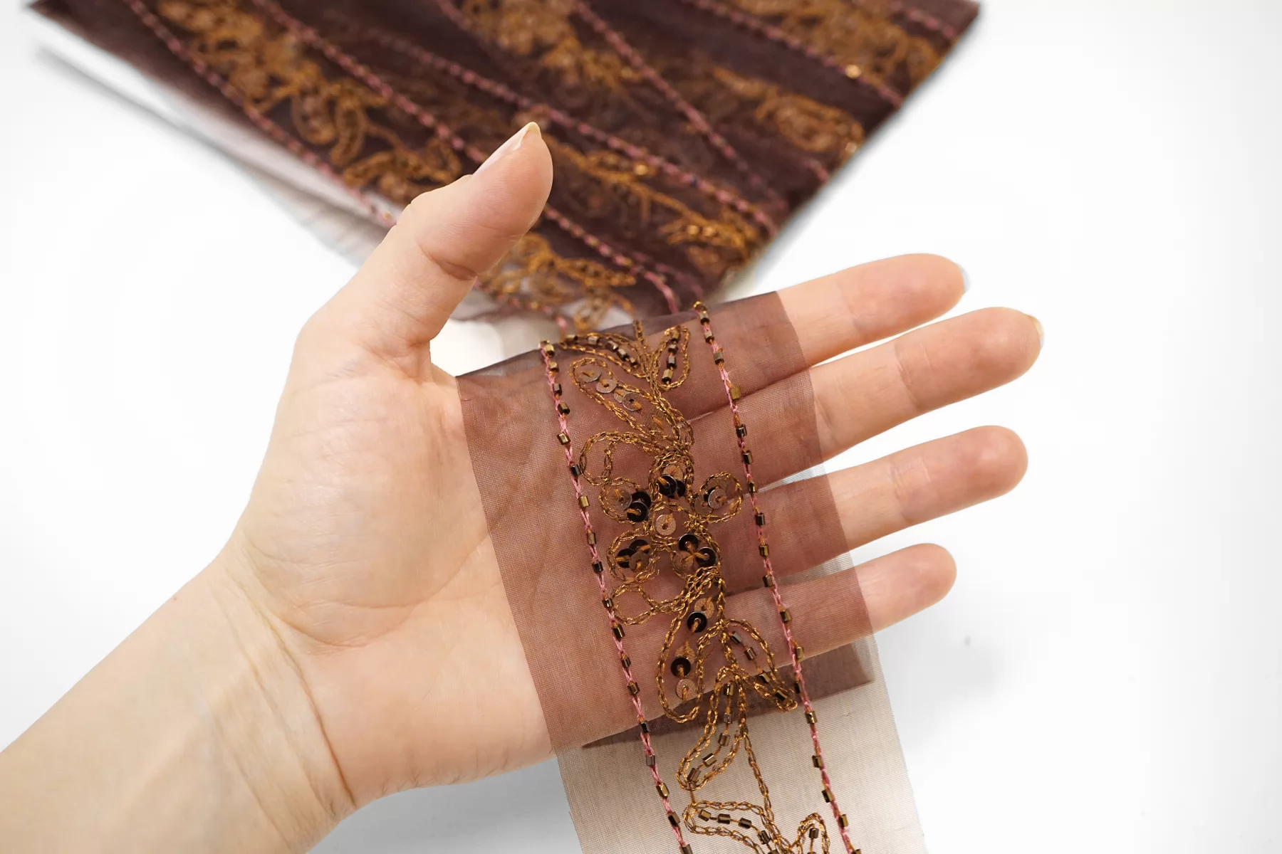 Итальянская декоративная тесьма тёмно-винного цвета из капрона с вышивкой и бисером. Жёсткая, шероховатая. Не тянется. Отлично подойдет для отделки одежды и аксессуаров.