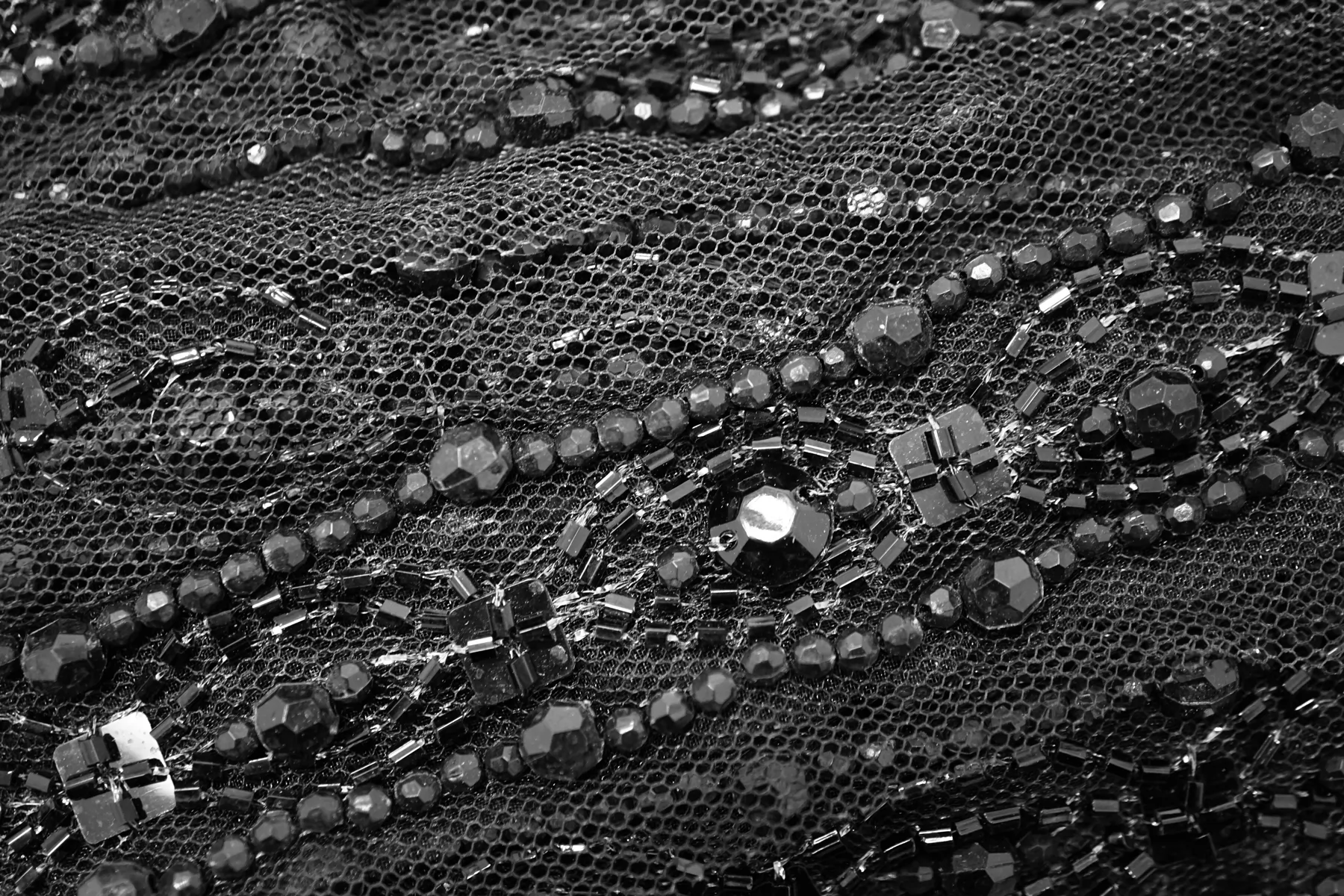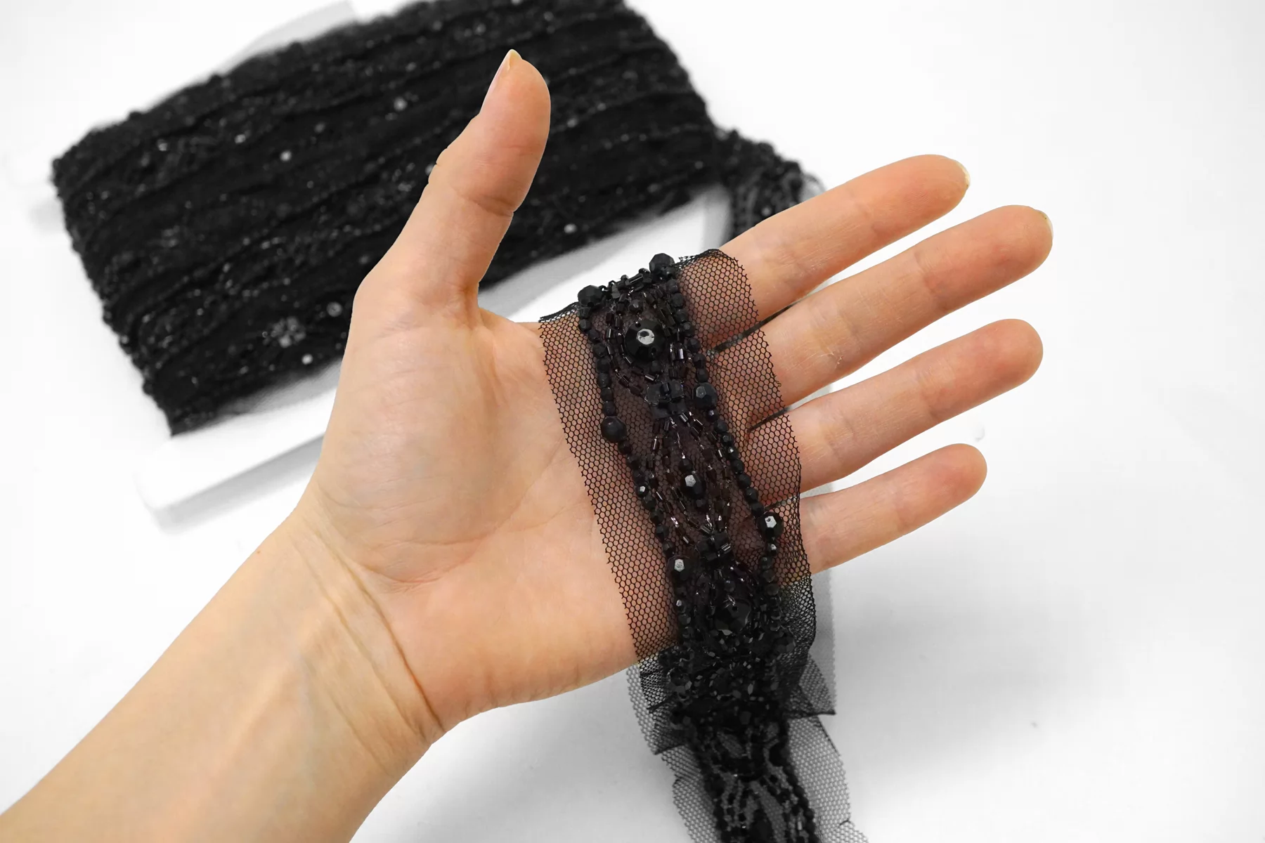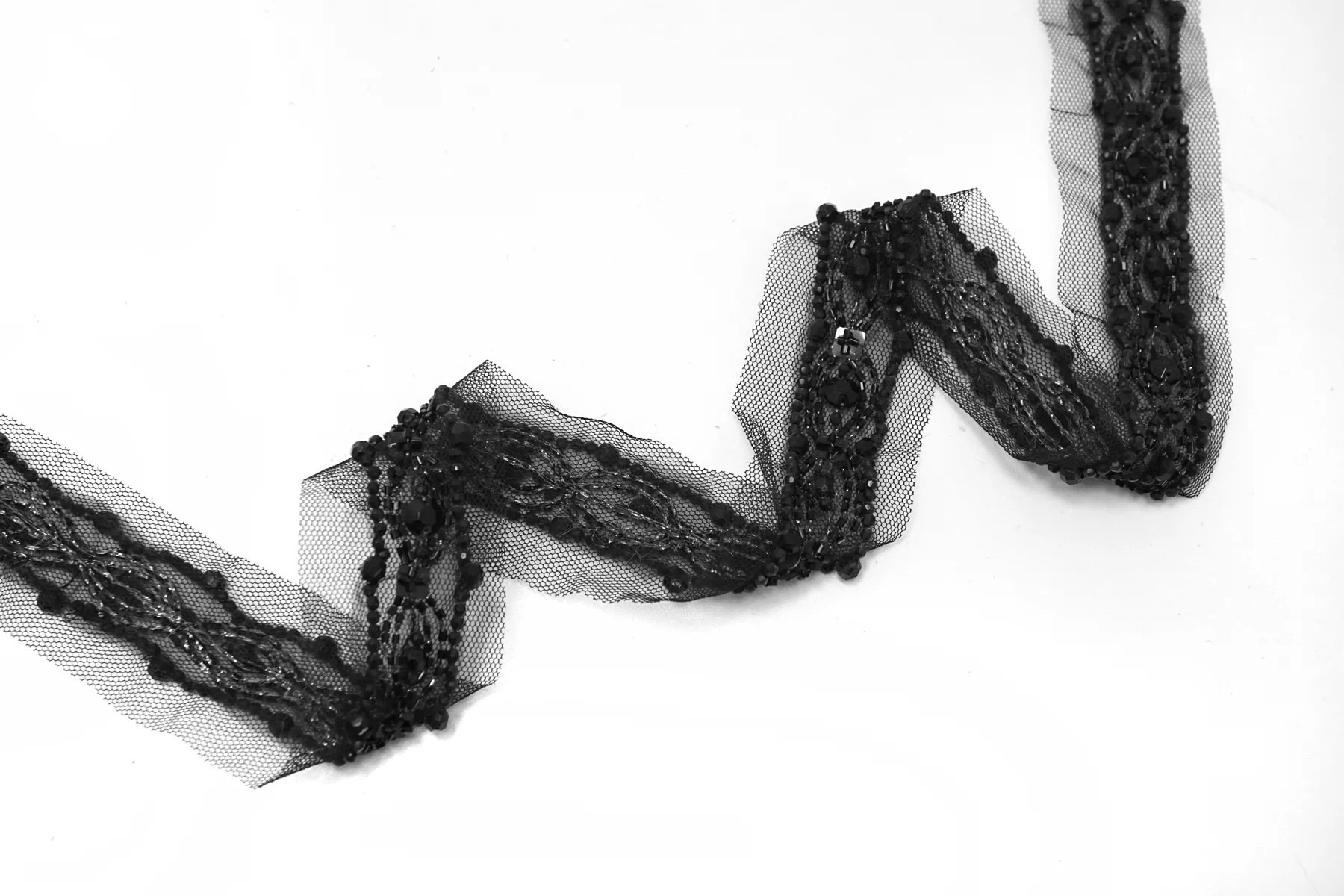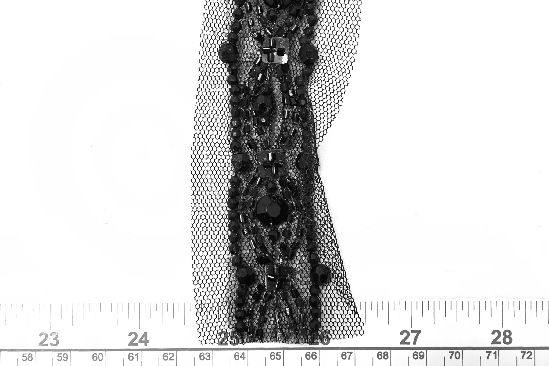 Итальянская декоративная тесьма из чёрной сетки, расшитая бисером и бусинами. Умеренной мягкости. Не тянется. Отлично подойдет для отделки одежды и аксессуаров.