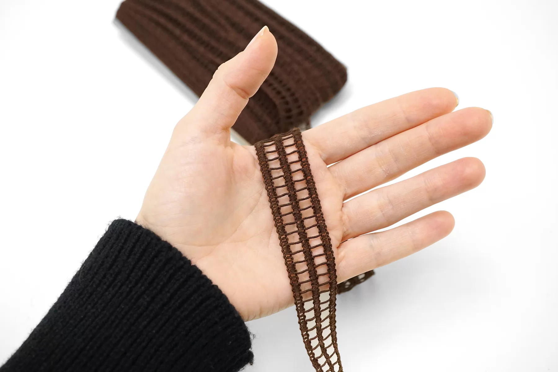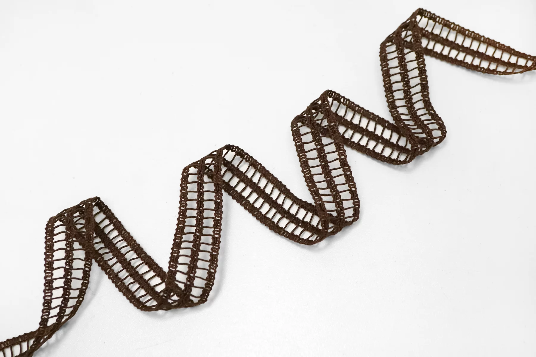 Итальянская декоративная тесьма тёмно-коричневого цвета из хлопка. Мягкая, пластичная. Не тянется. Отлично подойдет для отделки одежды и аксессуаров.