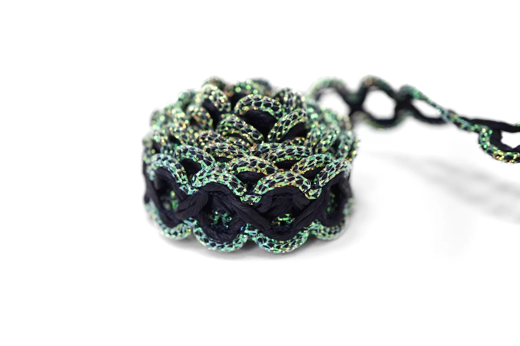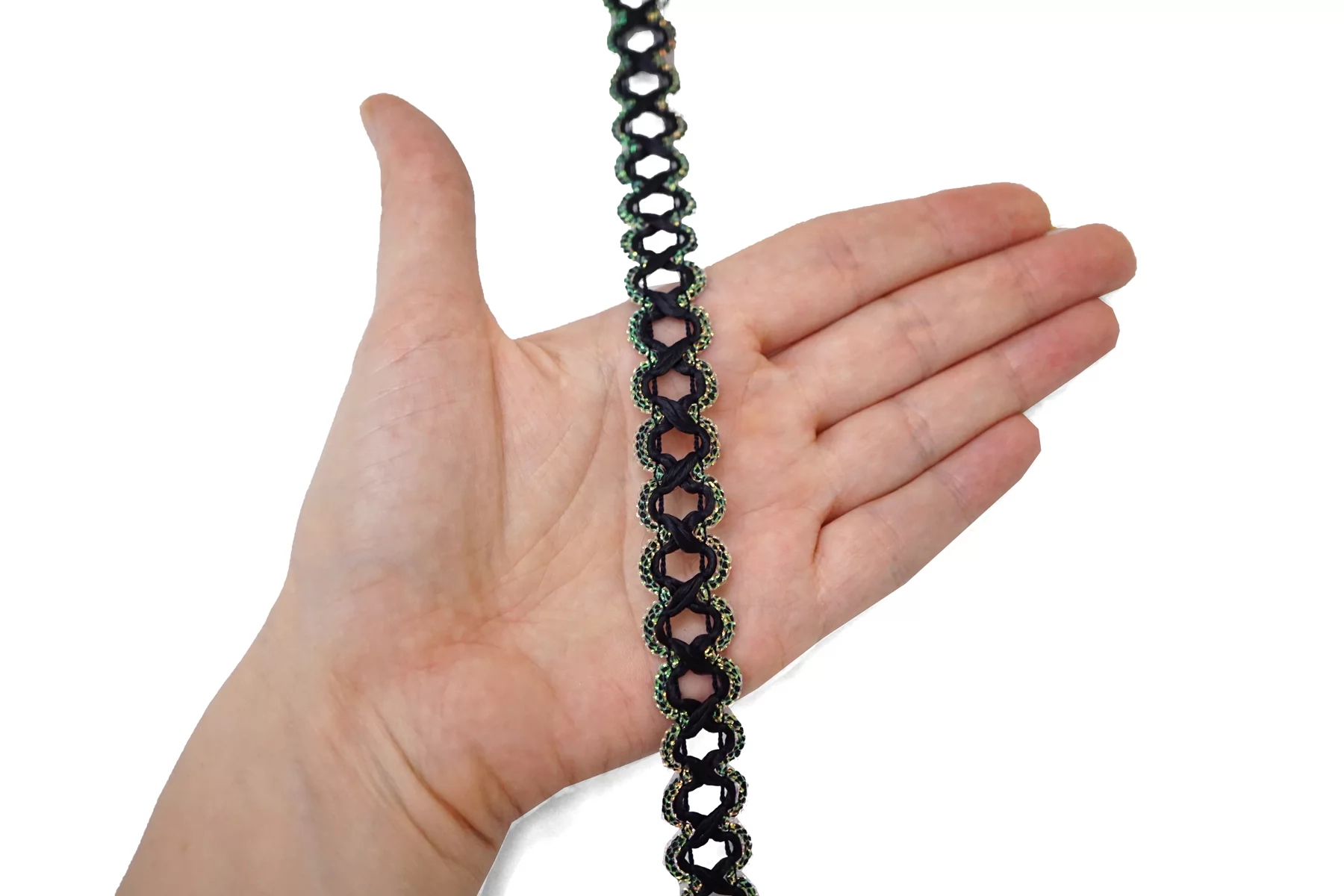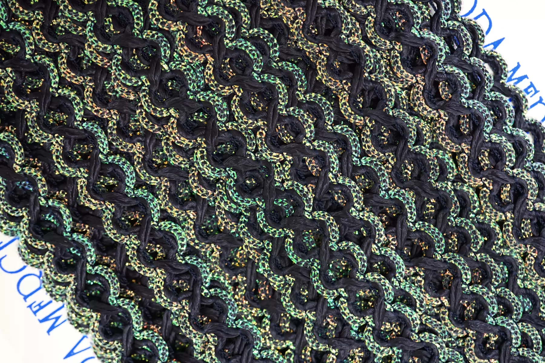 Итальянская декоративная тесьма тёмно-синего цвета с люрексом по краям (с одной стороны зелёный, с другой золотистый). Не тянется. Отлично подойдет для отделки одежды и аксессуаров.