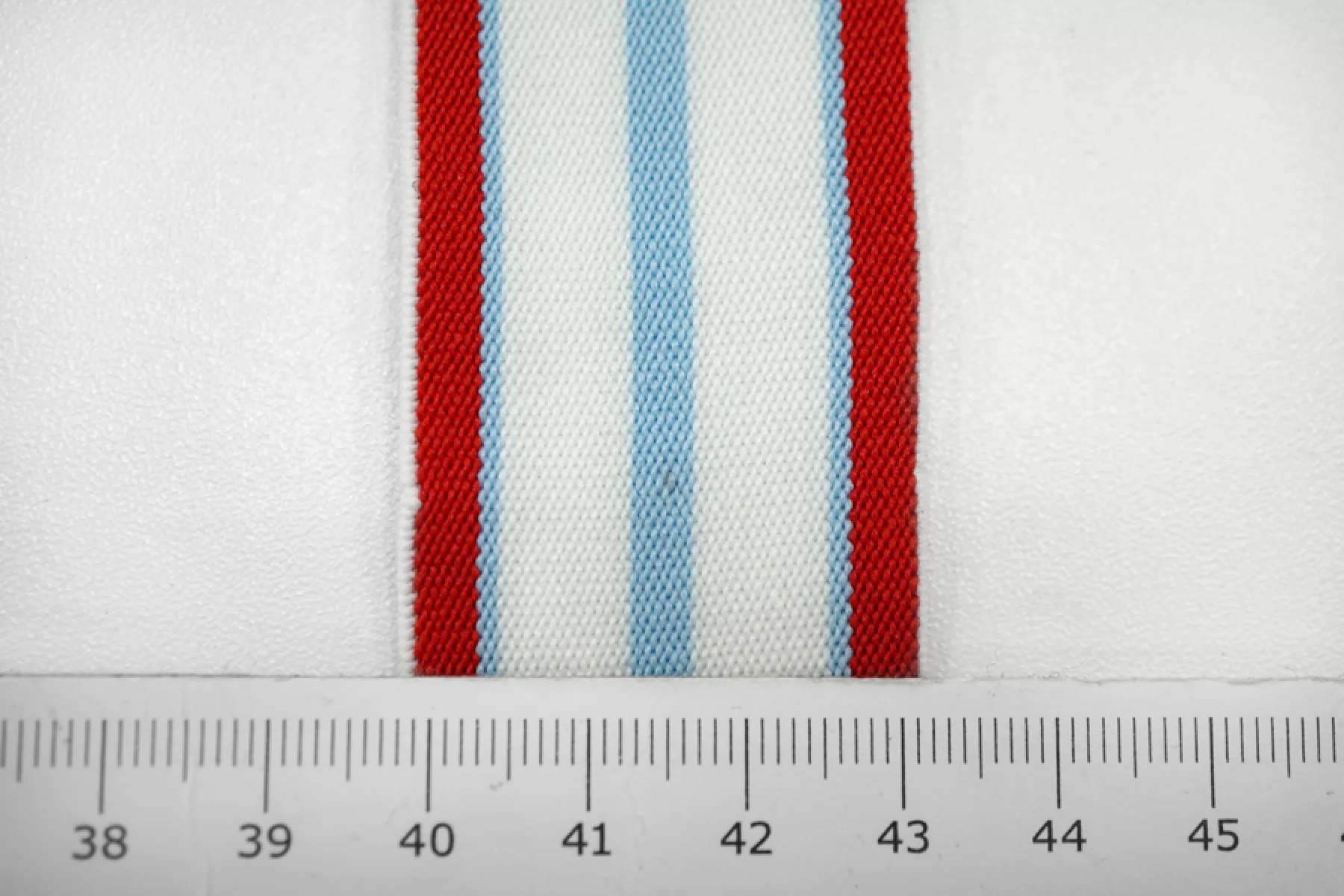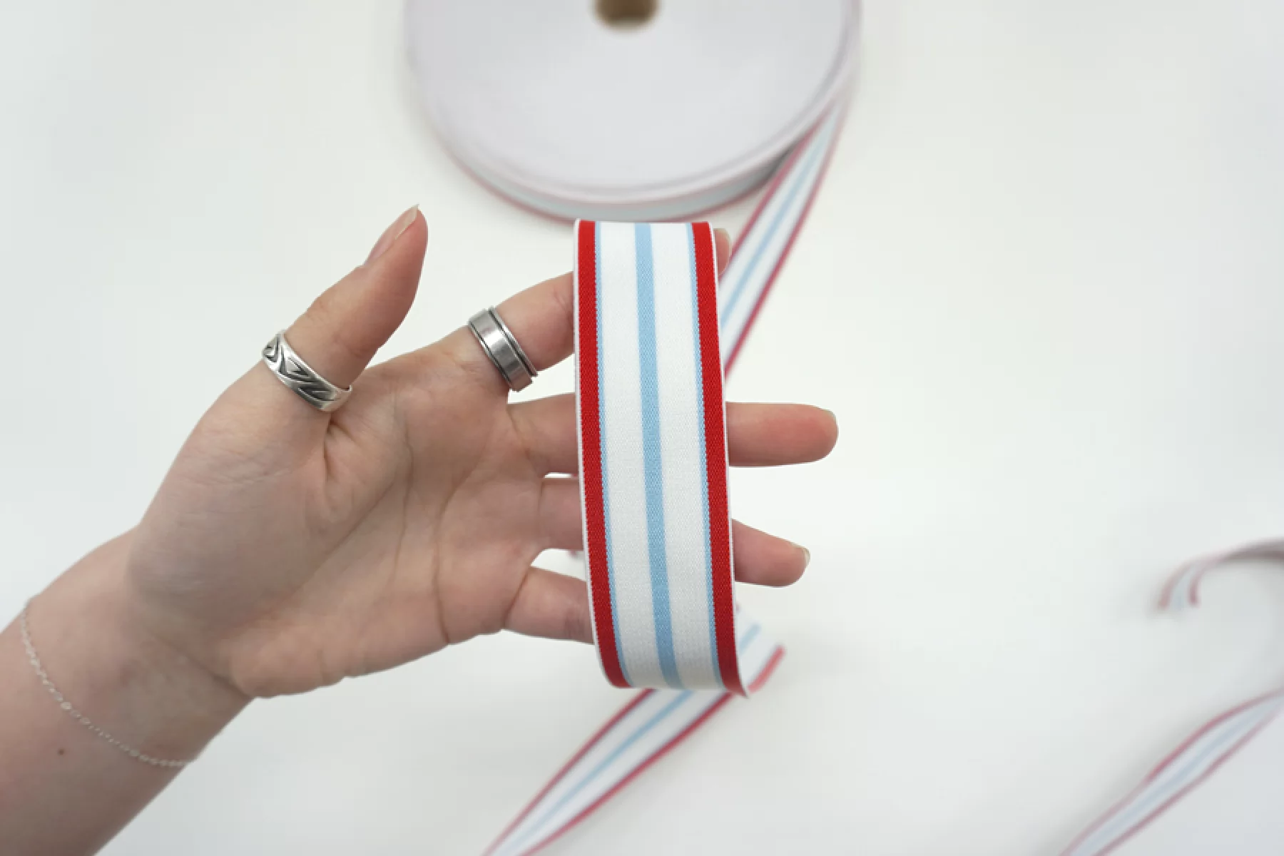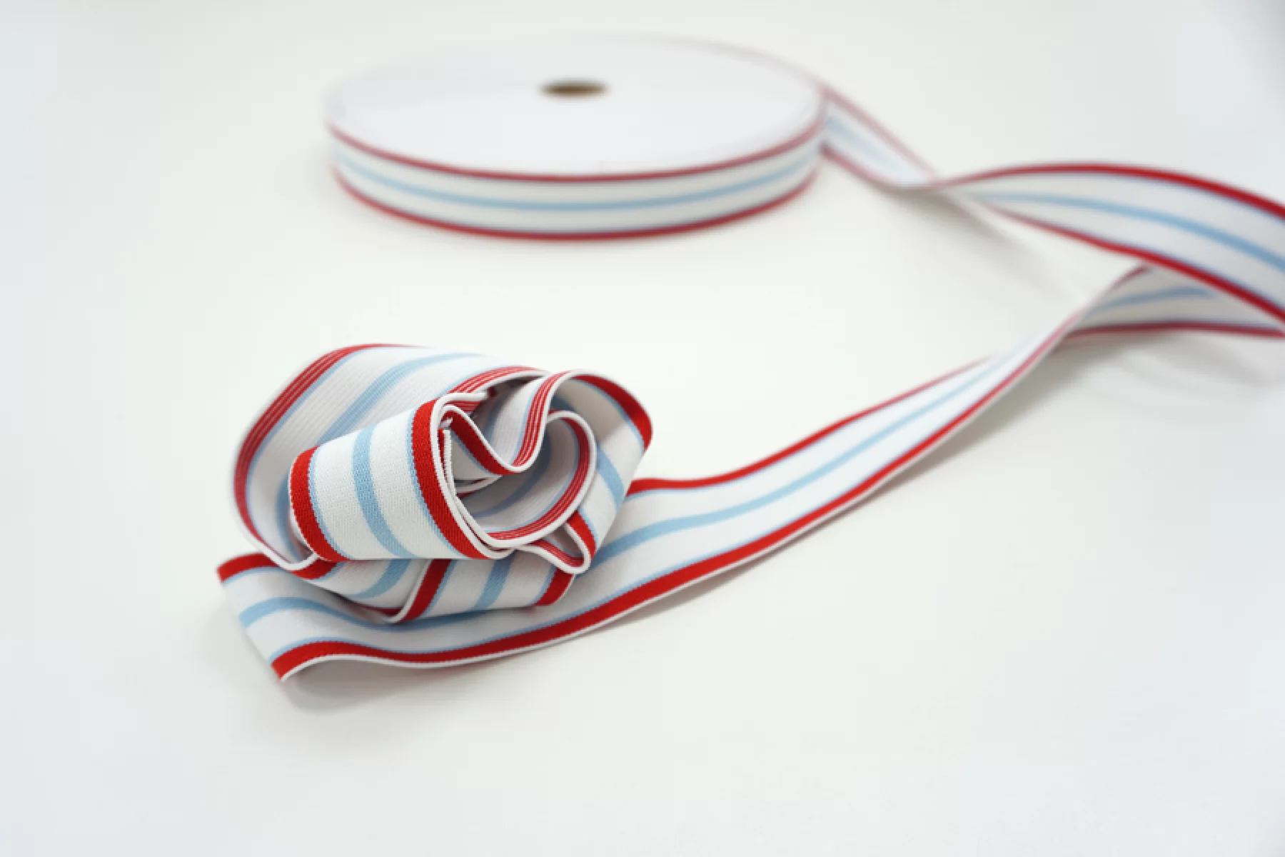Упругая резинка с полосами разных цветов: белого, голубого и красного цветов, шириной 3 см, плотная, тугая, неплохо тянется. Подойдет для отделки юбок, брюк, ремешков и аксессуаров.