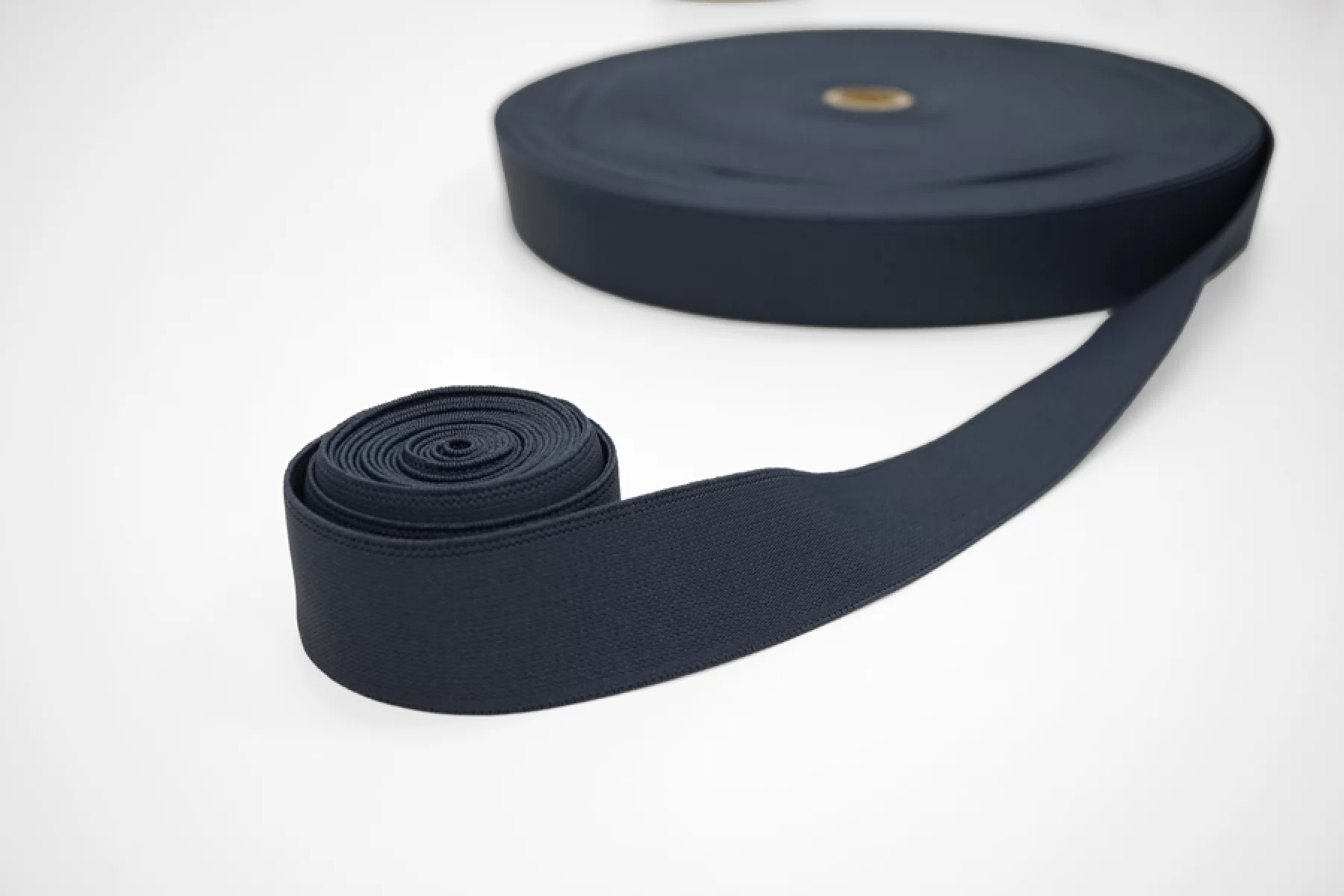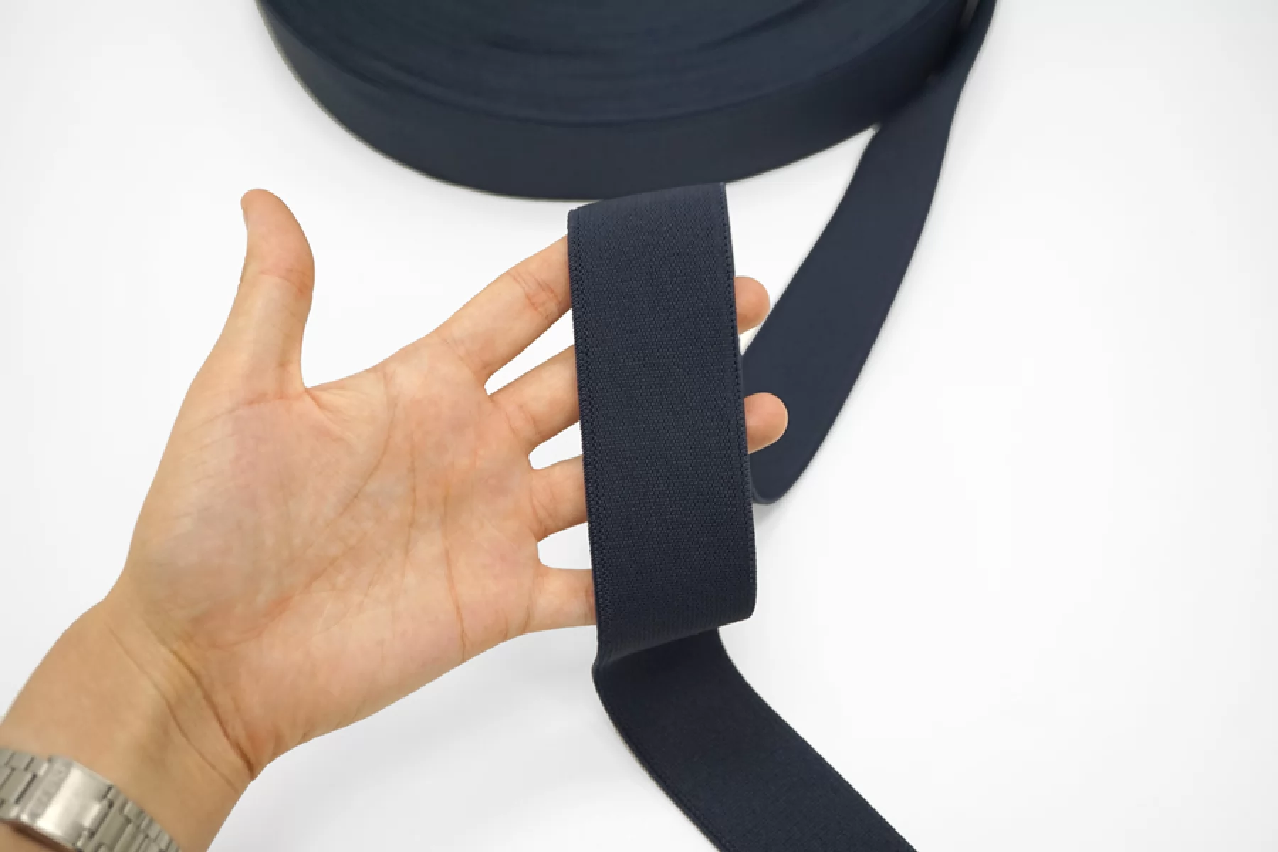 Упругая резинка темно-синяя, шириной 4 см, плотная, тугая, слабо тянется. Подойдет для отделки юбок, брюк, ремешков и аксессуаров.
