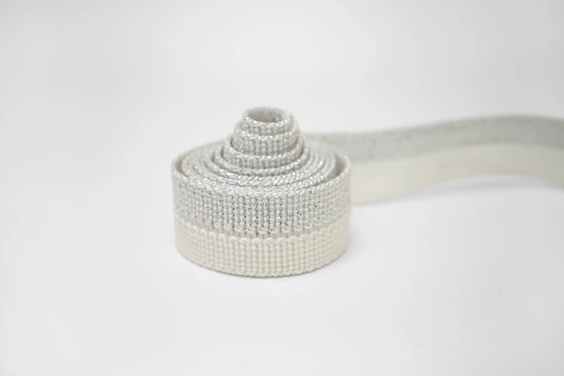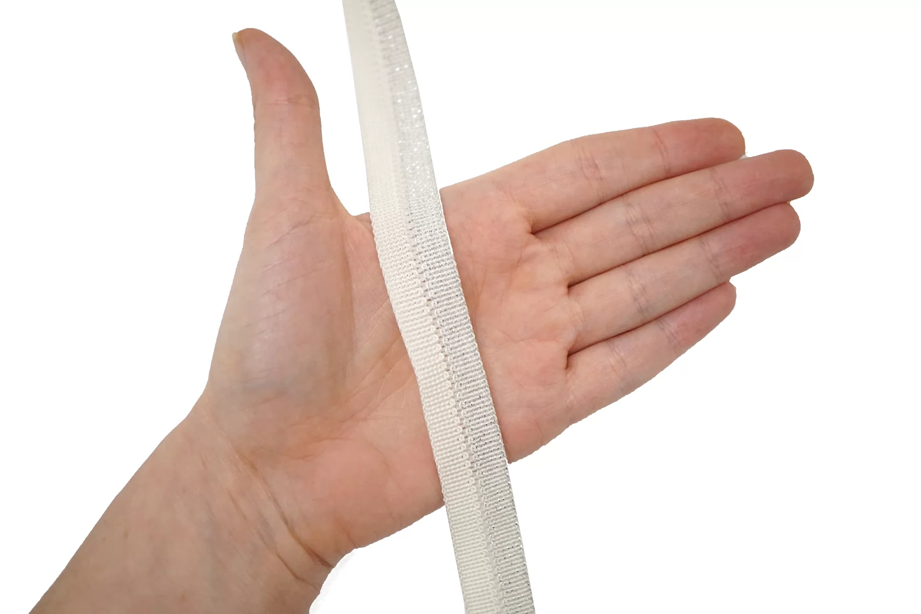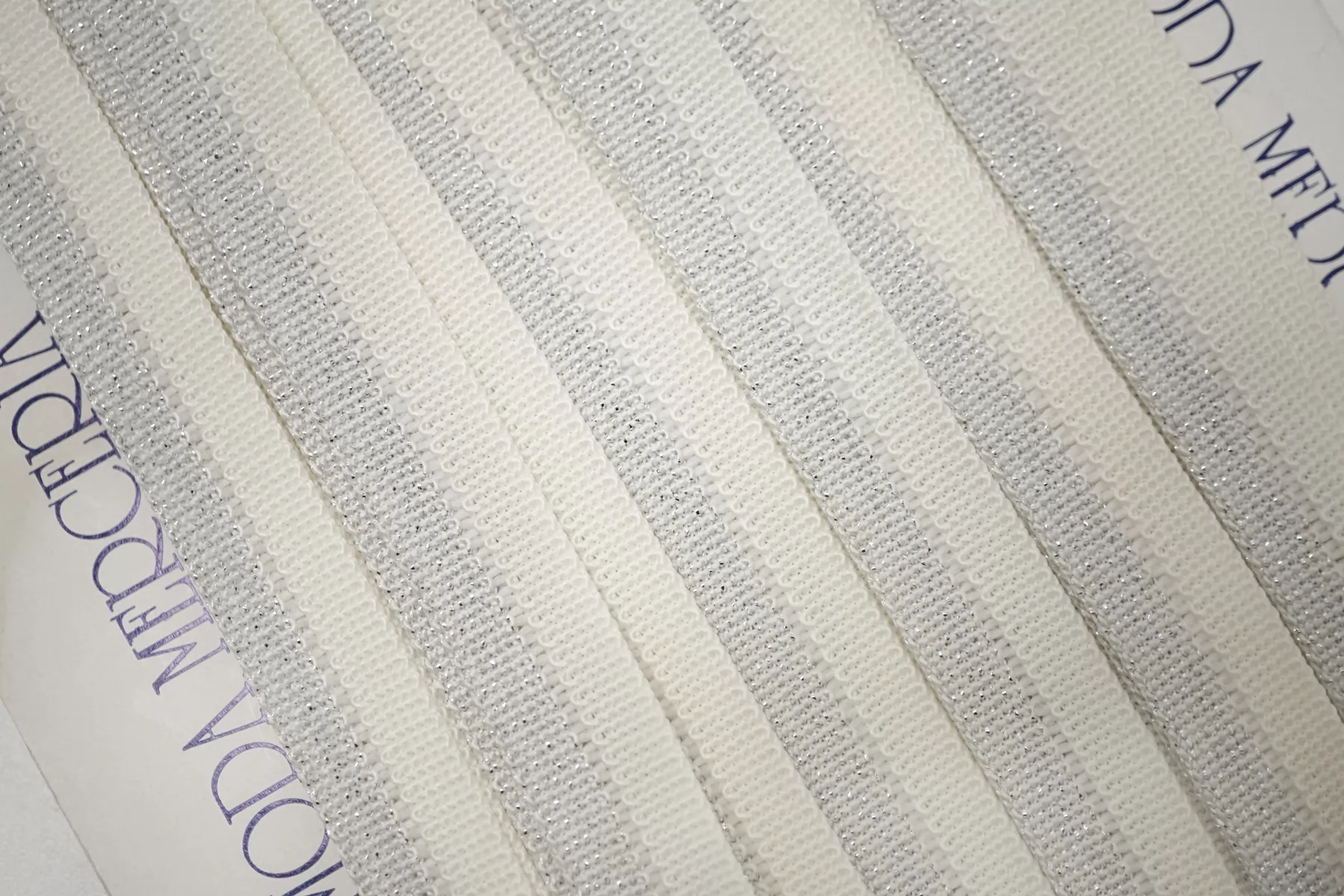 Итальянская трикотажная тесьма, нити молочного и серого цвета, с серебристым люрексом. По центру желобок для сгиба. Практически не тянется.