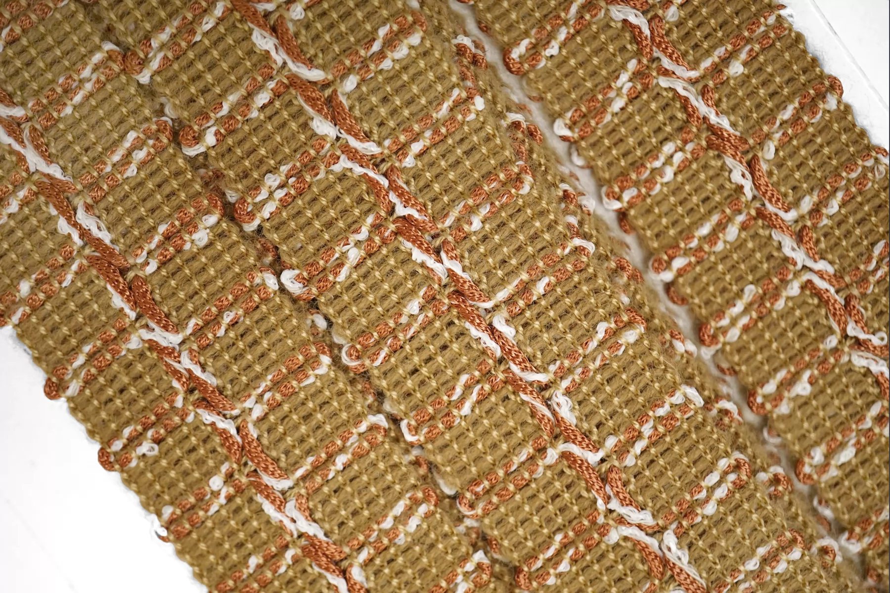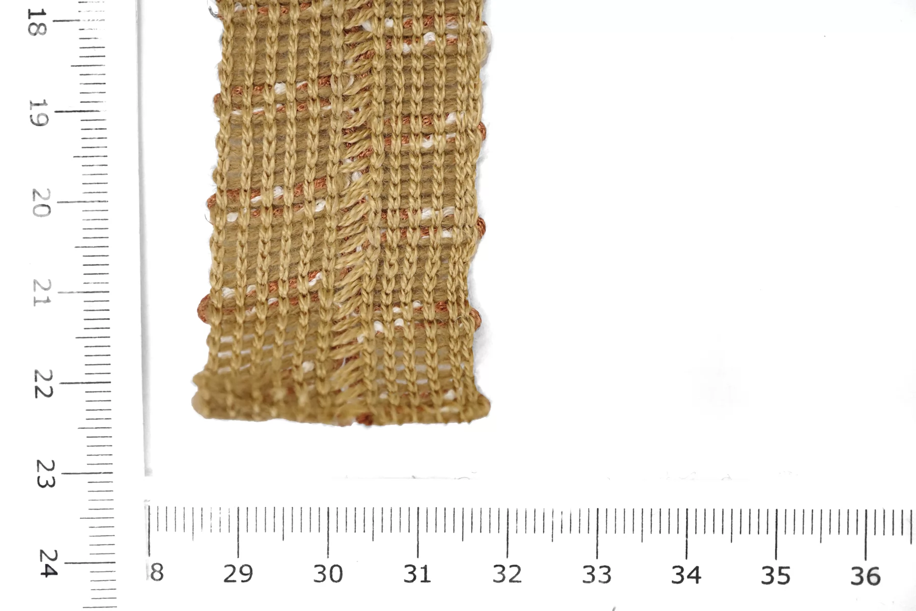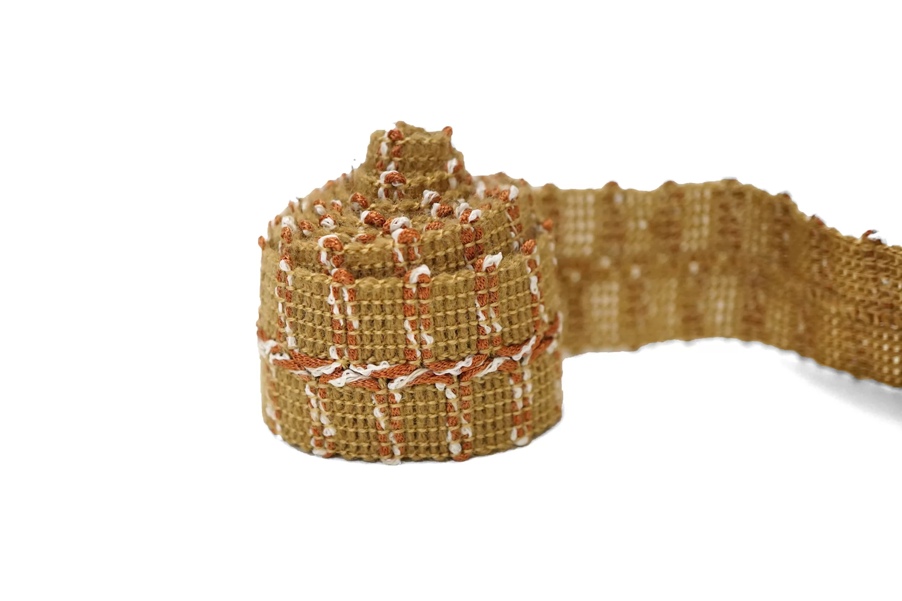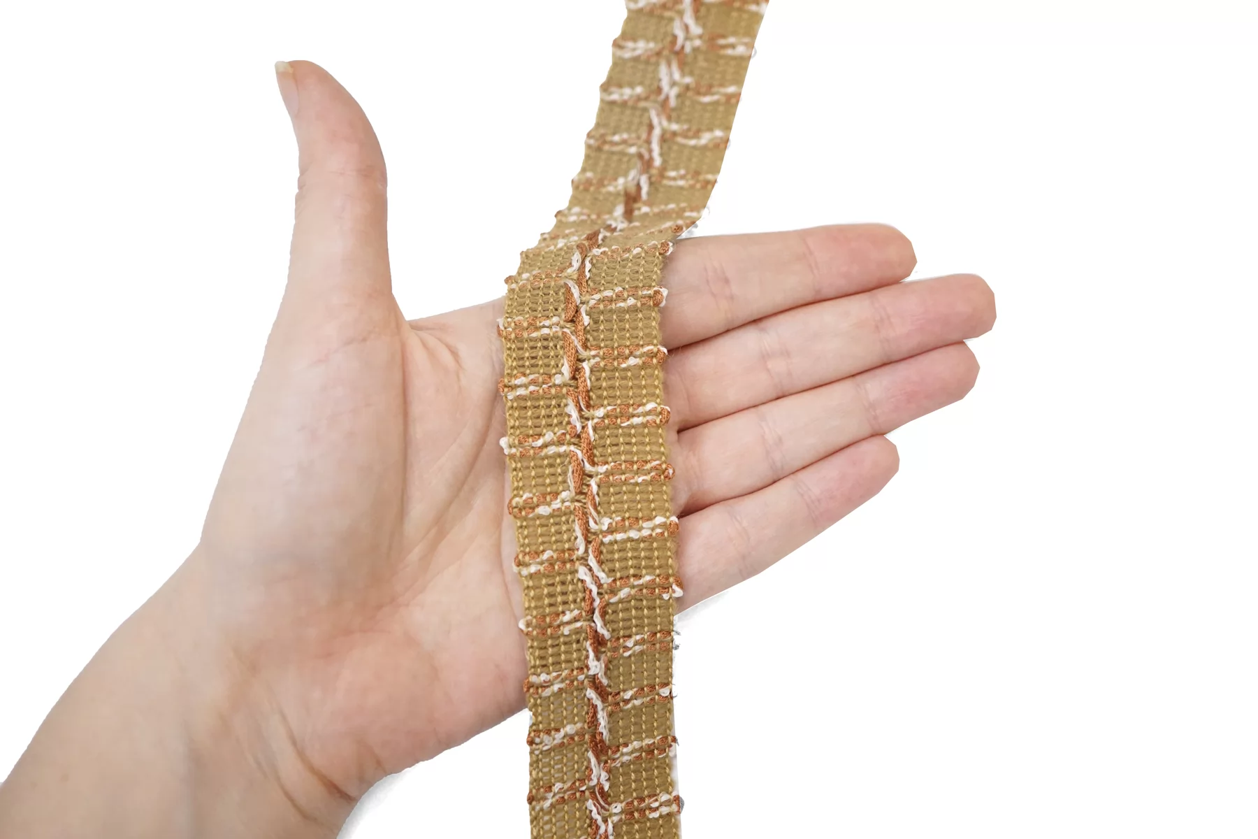 Итальянская тесьма, нити охристого, белого и коричневого цвета. По центру желобок для сгиба. Не тянется.