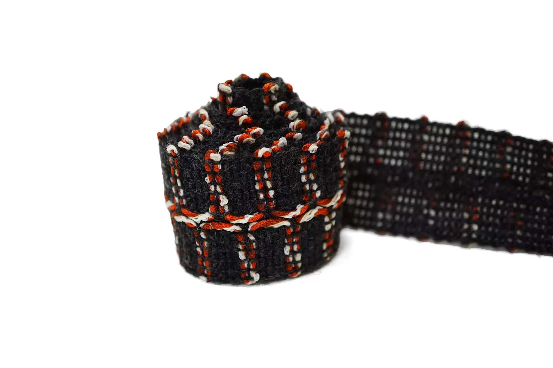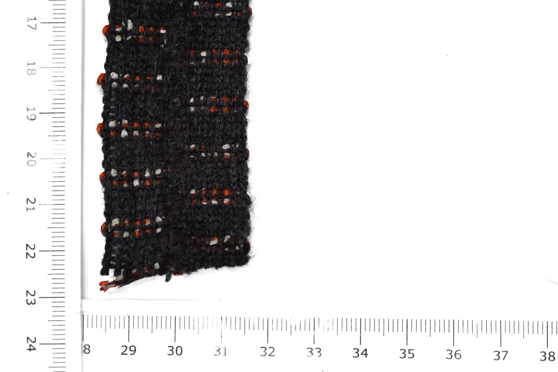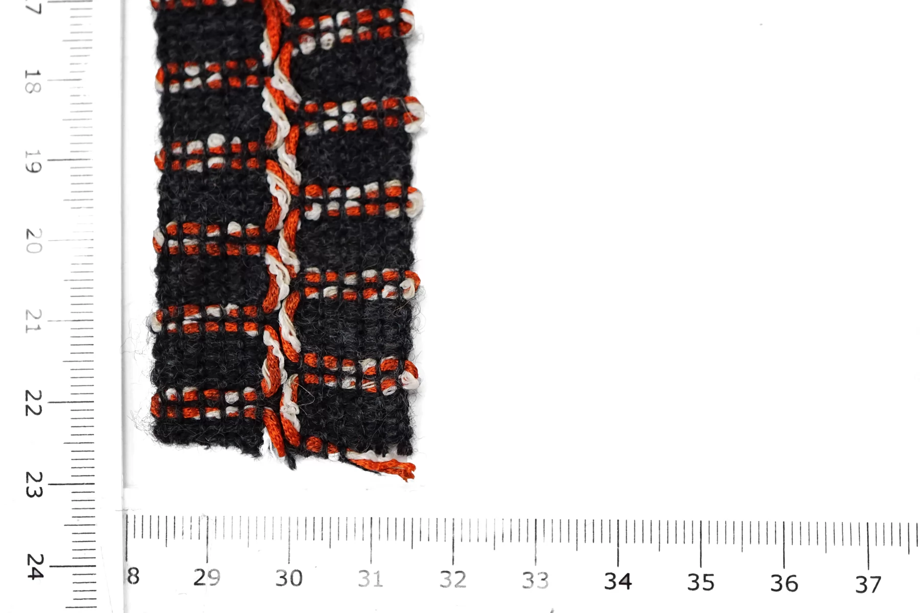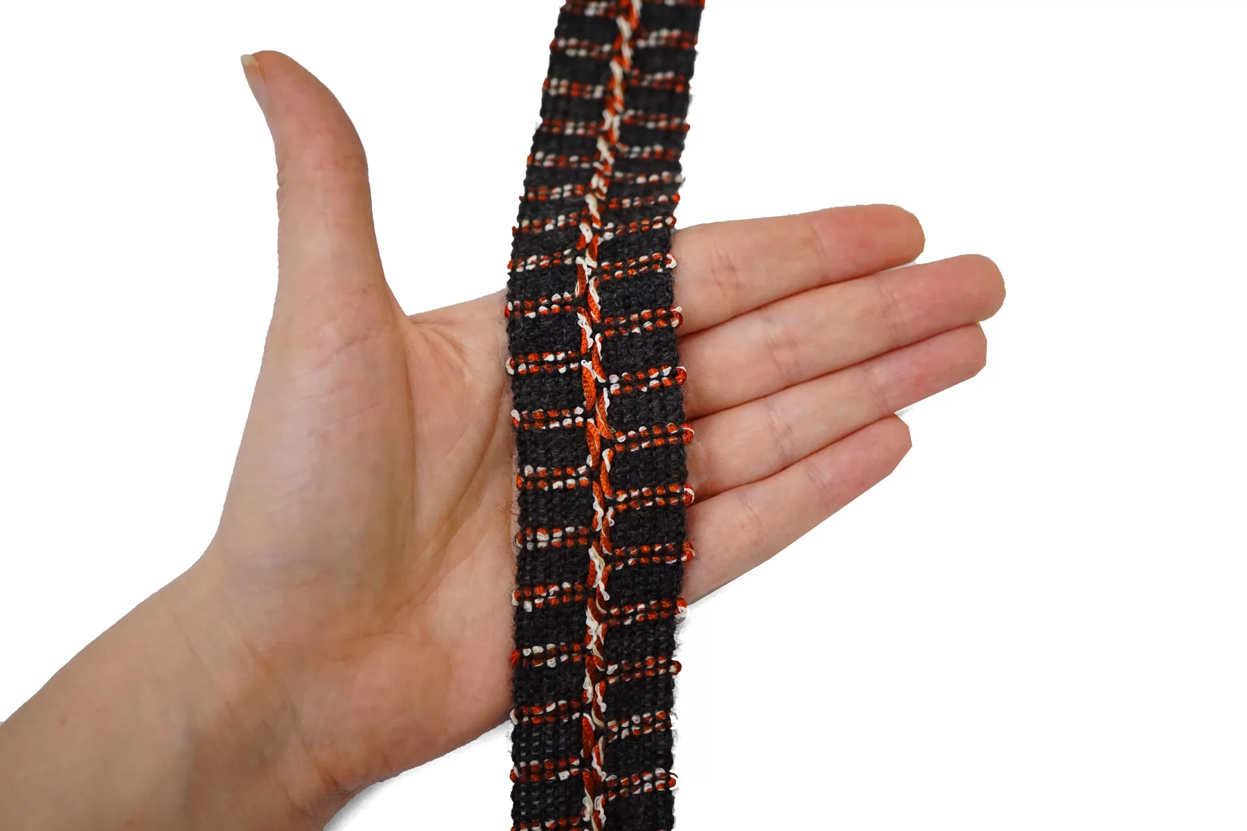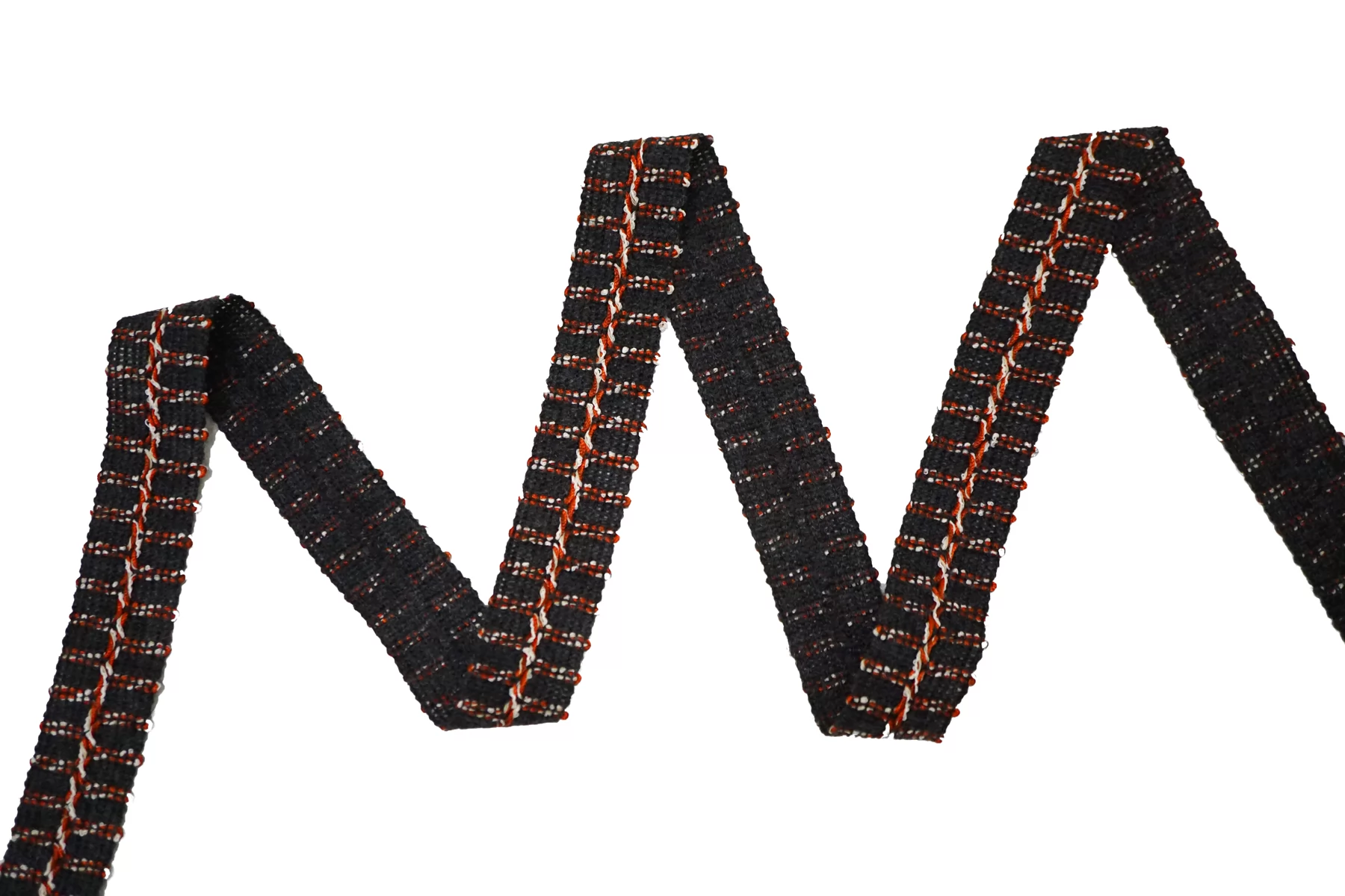 Итальянская тесьма, нити тёмно-серого цвета, с белыми и красными нитями. По центру желобок для сгиба. Не тянется.