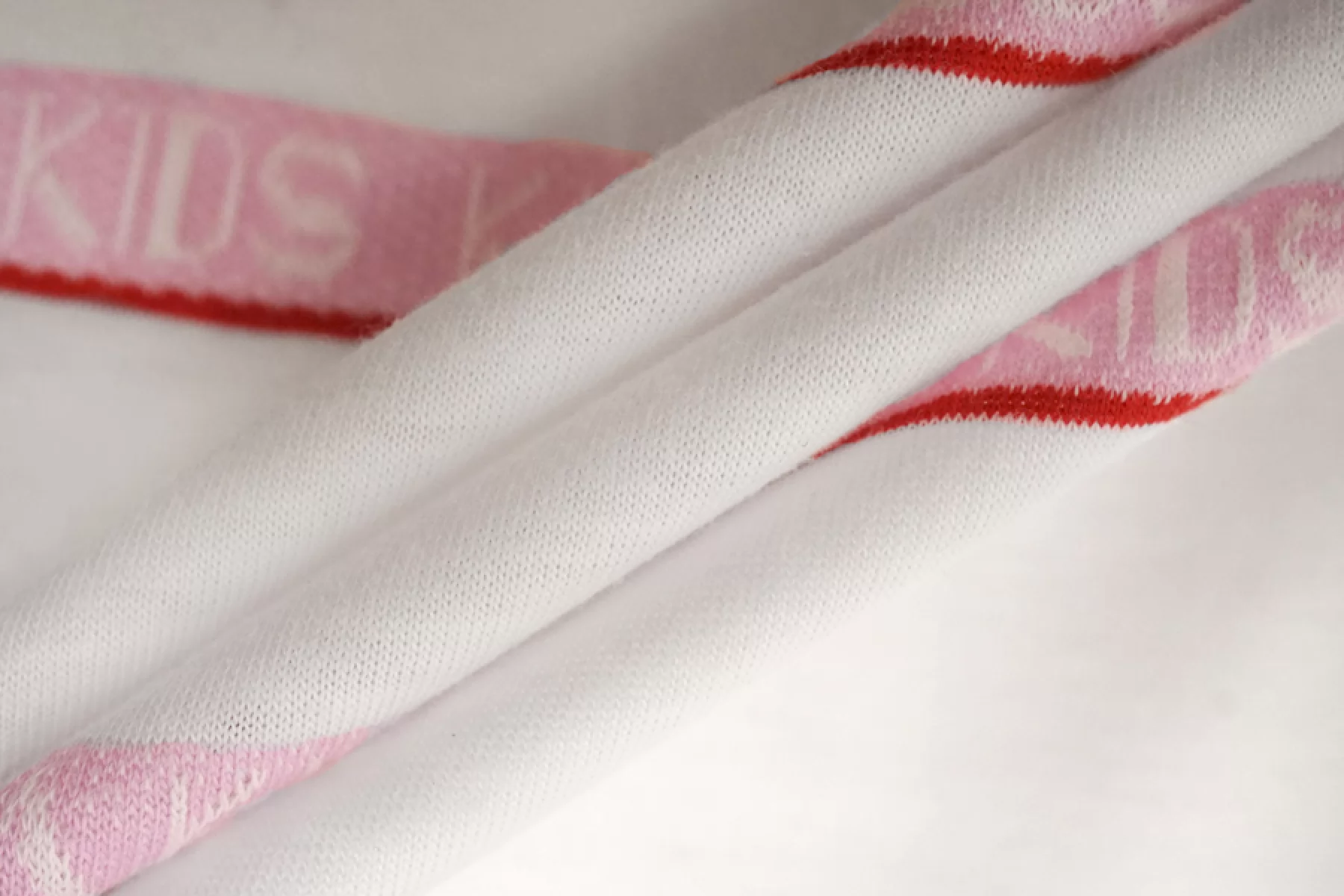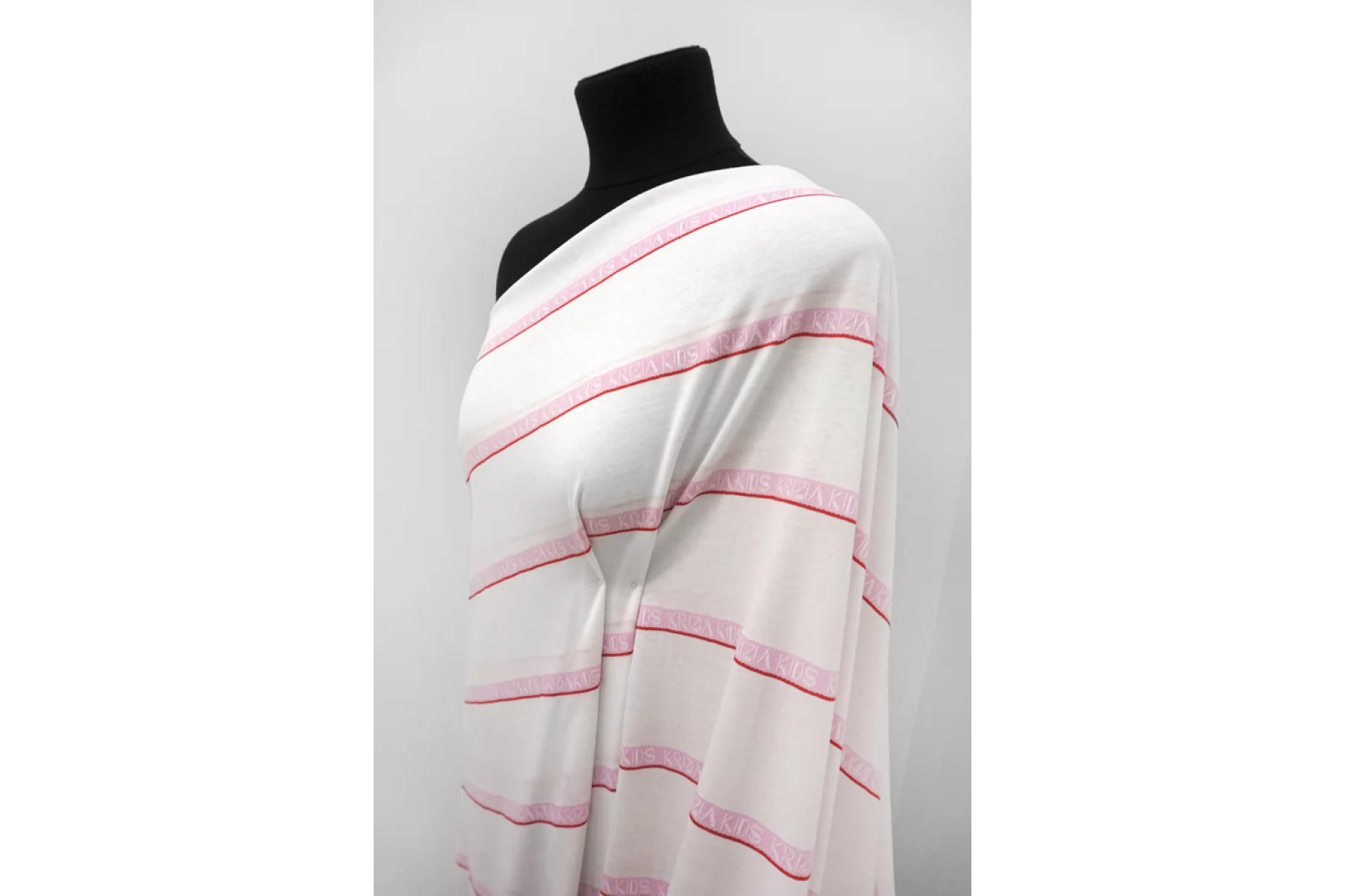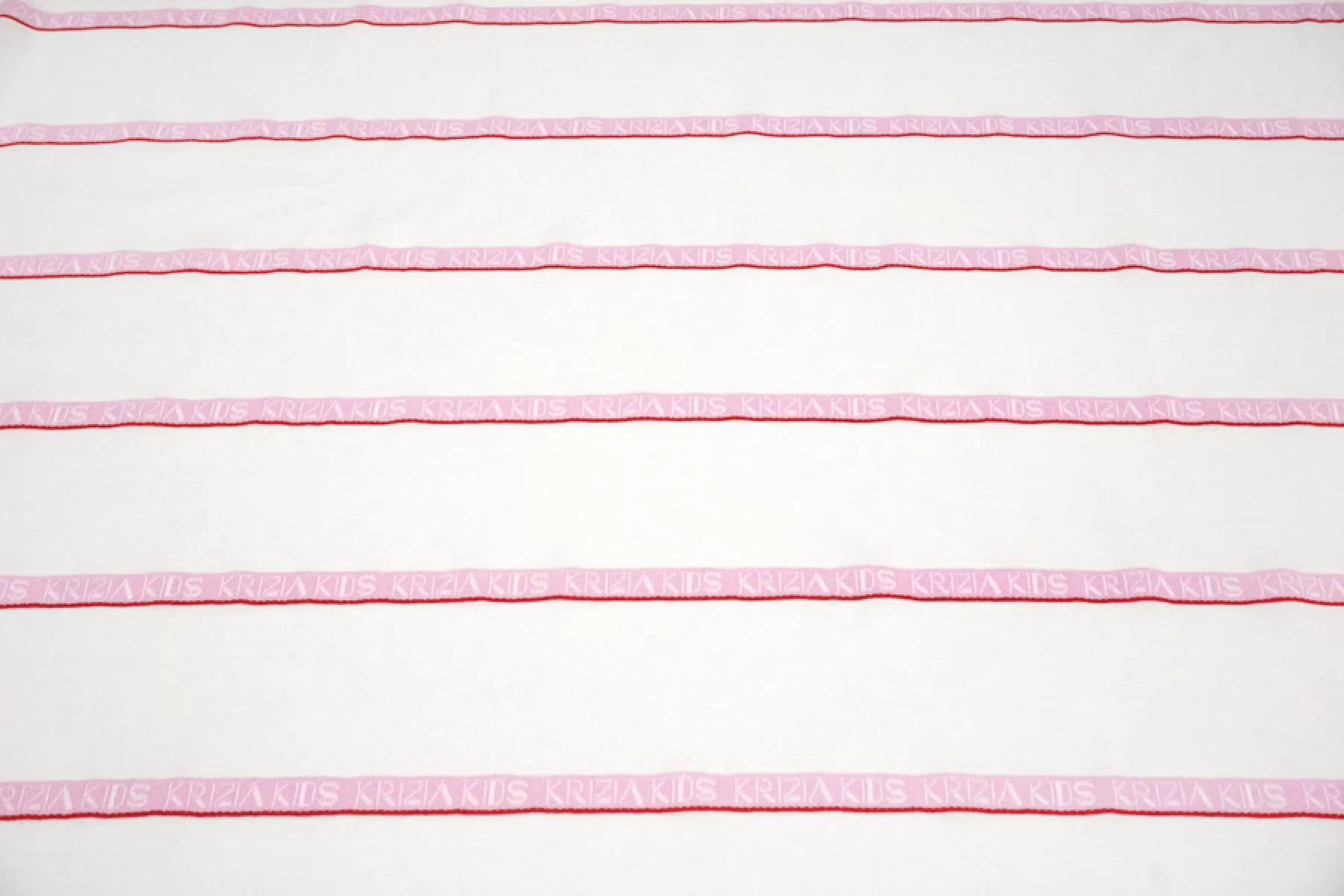 Трикотаж - кулирная гладь из хлопка от Krizia, принт представляет собой розовые полосы с логотипом на белом фоне, рисунок повторяется каждые 8,5 см. Полосы проходят поперек кромки. Трикотаж немного просвечивает, пластичный, эластичный. Подойдет для пошива детских маечек, кофточек, шортиков, футболок и т.д.