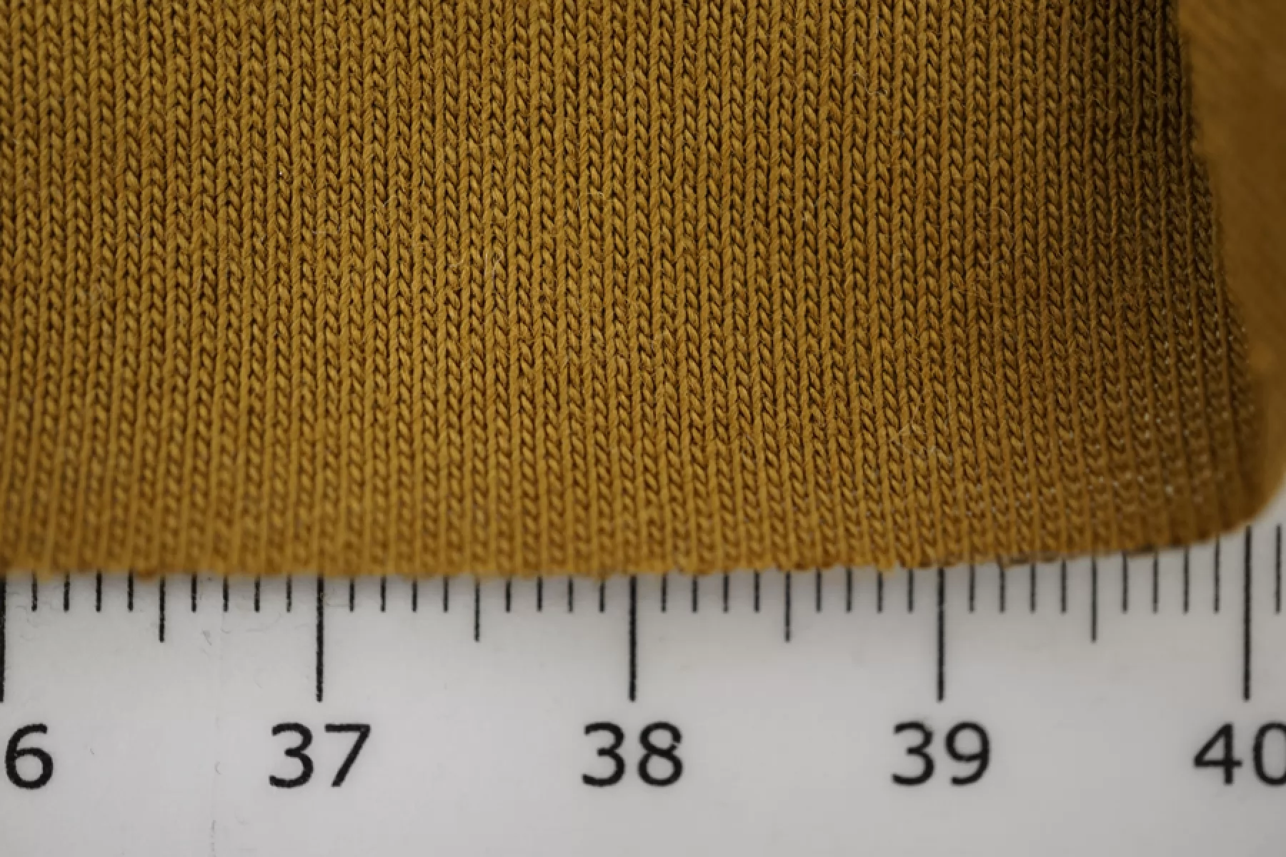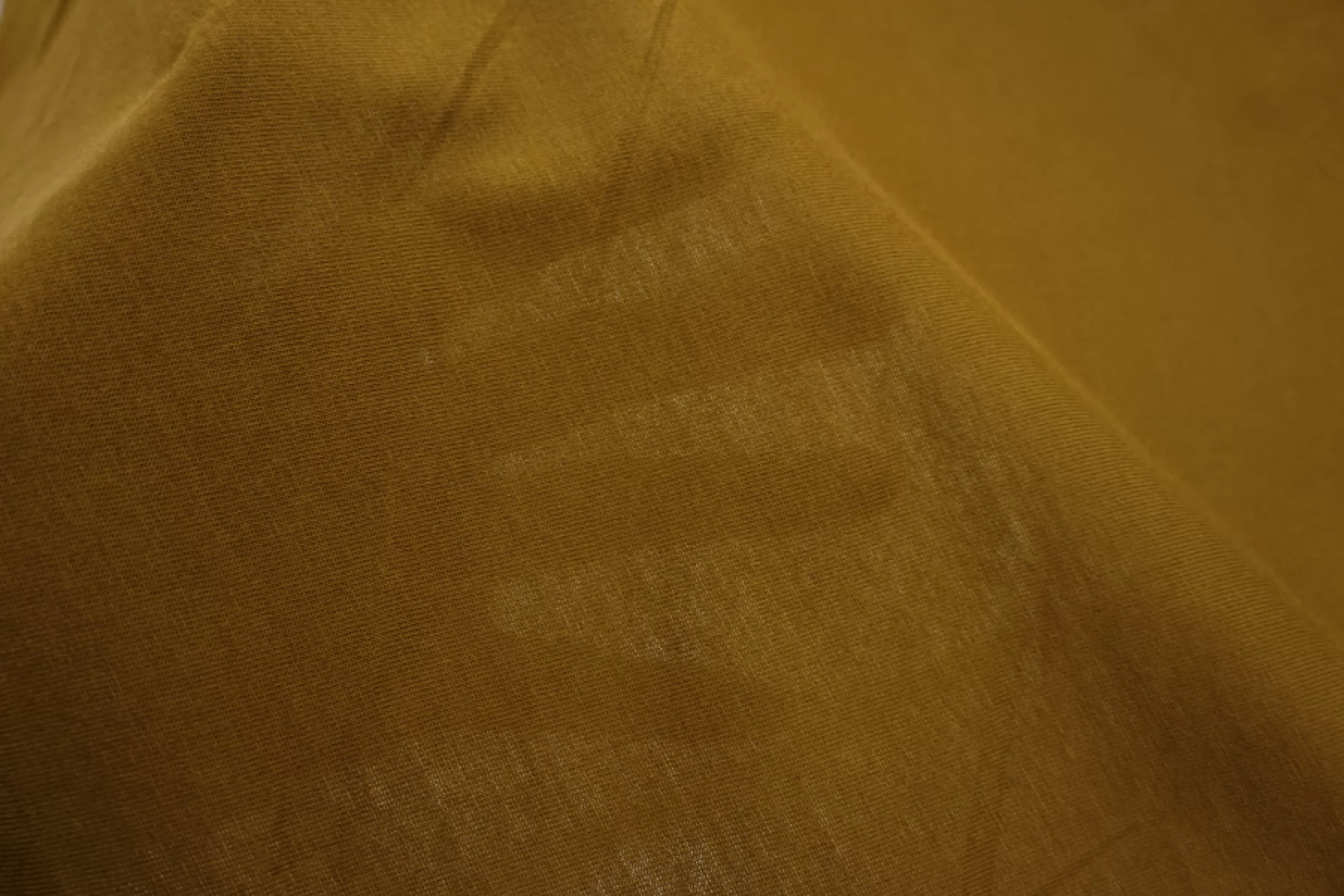 Футболочный трикотаж из хлопка, по плетению кулирная гладь. Природный, горчично-коричневый оттенок. Трикотаж просвечивает при растяжении, пластичный, эластичный. Подойдет для пошива майки, футболки, топа, платья-футболки.