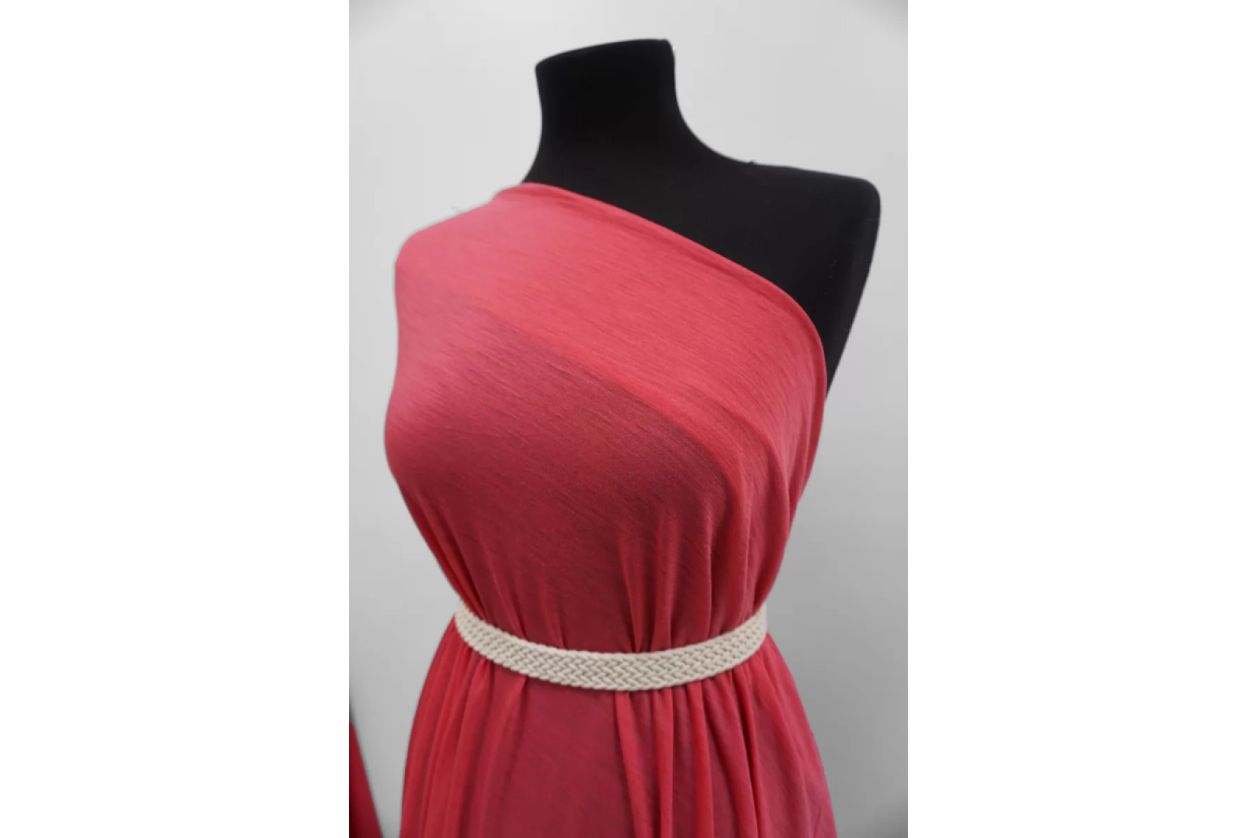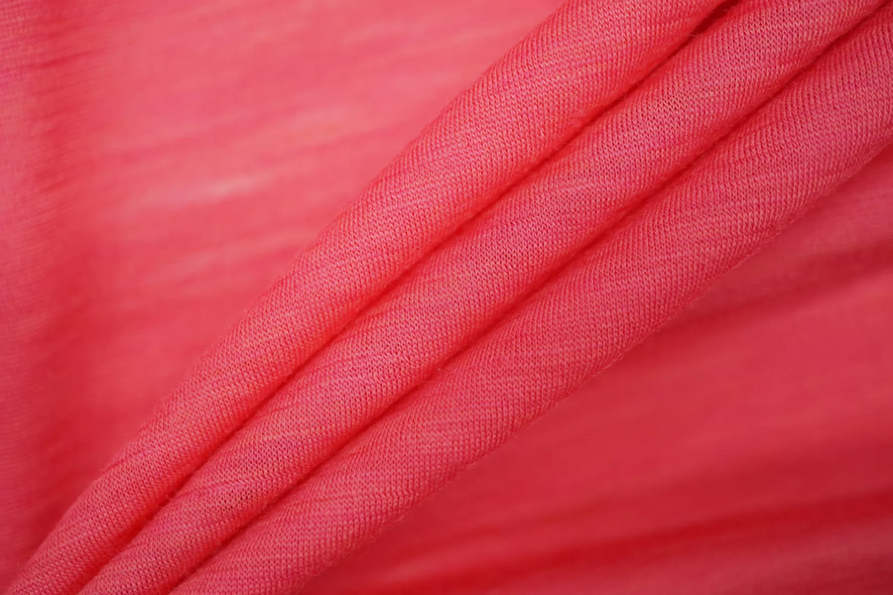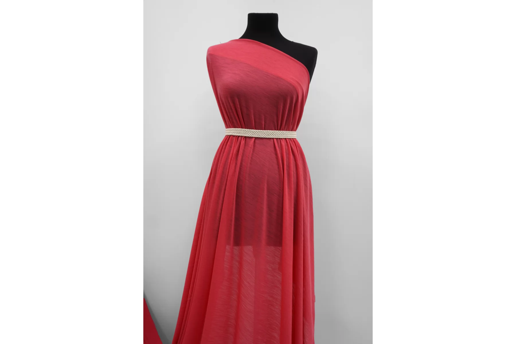 Тонкий трикотаж из шерсти, по плетению кулирная гладь. Цвет малиновый. Трикотаж просвечивает, пластичный, эластичный. Подойдет для пошива майки, футболки, топа, можно использовать в качестве подклада, греющей нижней юбки, тонкой водолазки.