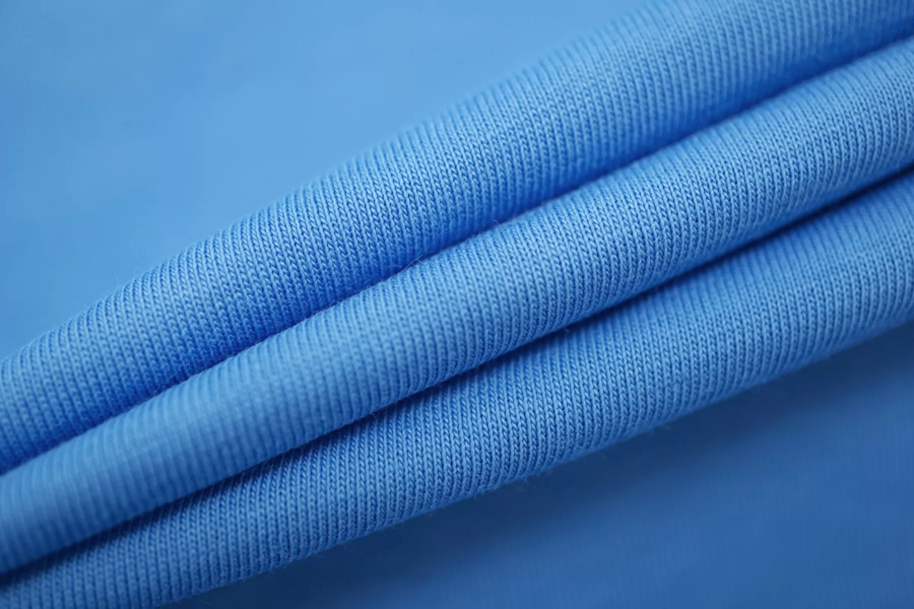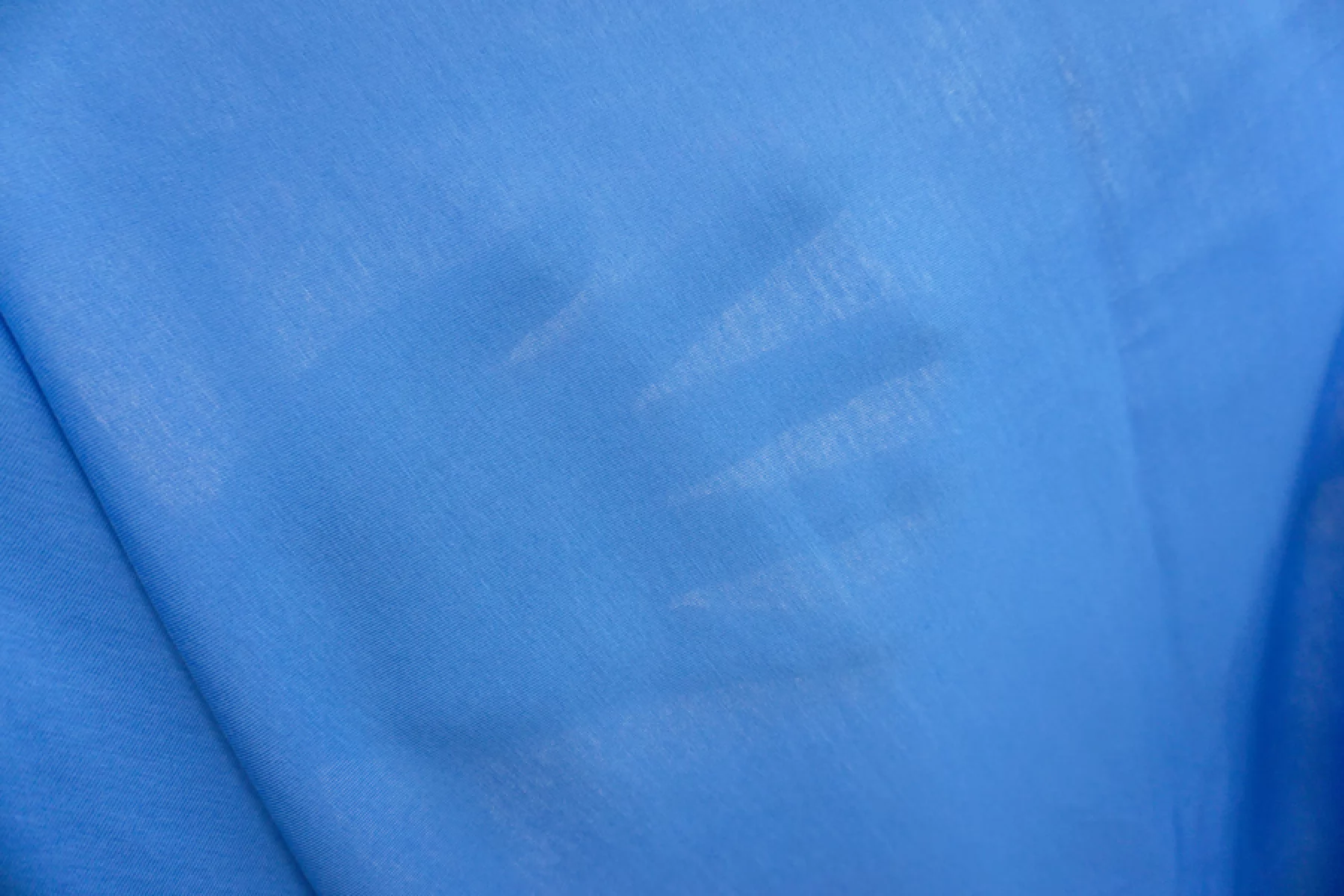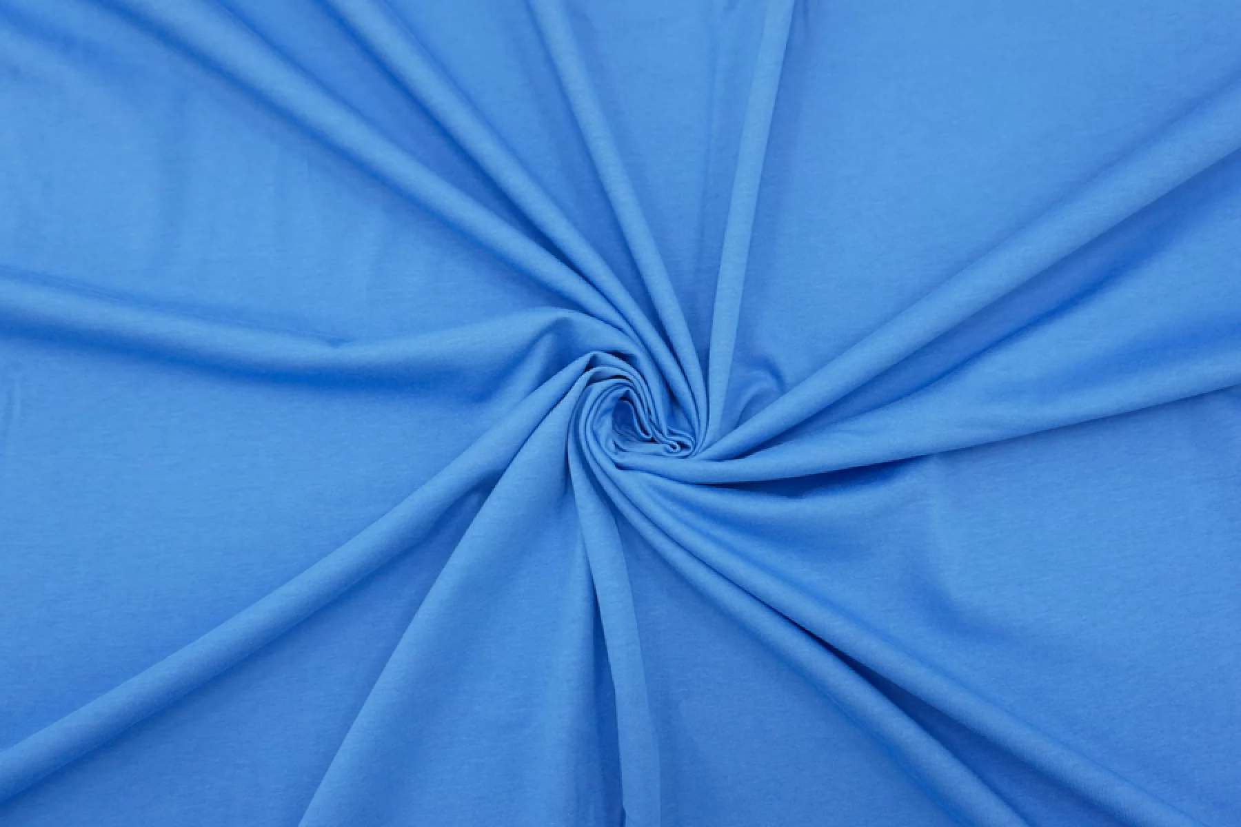 Футболочный трикотаж из хлопка, по плетению кулирная гладь. Красивый сине-голубой цвет. Трикотаж просвечивает при растяжении, пластичный, эластичный. Подойдет для пошива майки, футболки, топа, платья-футболки.