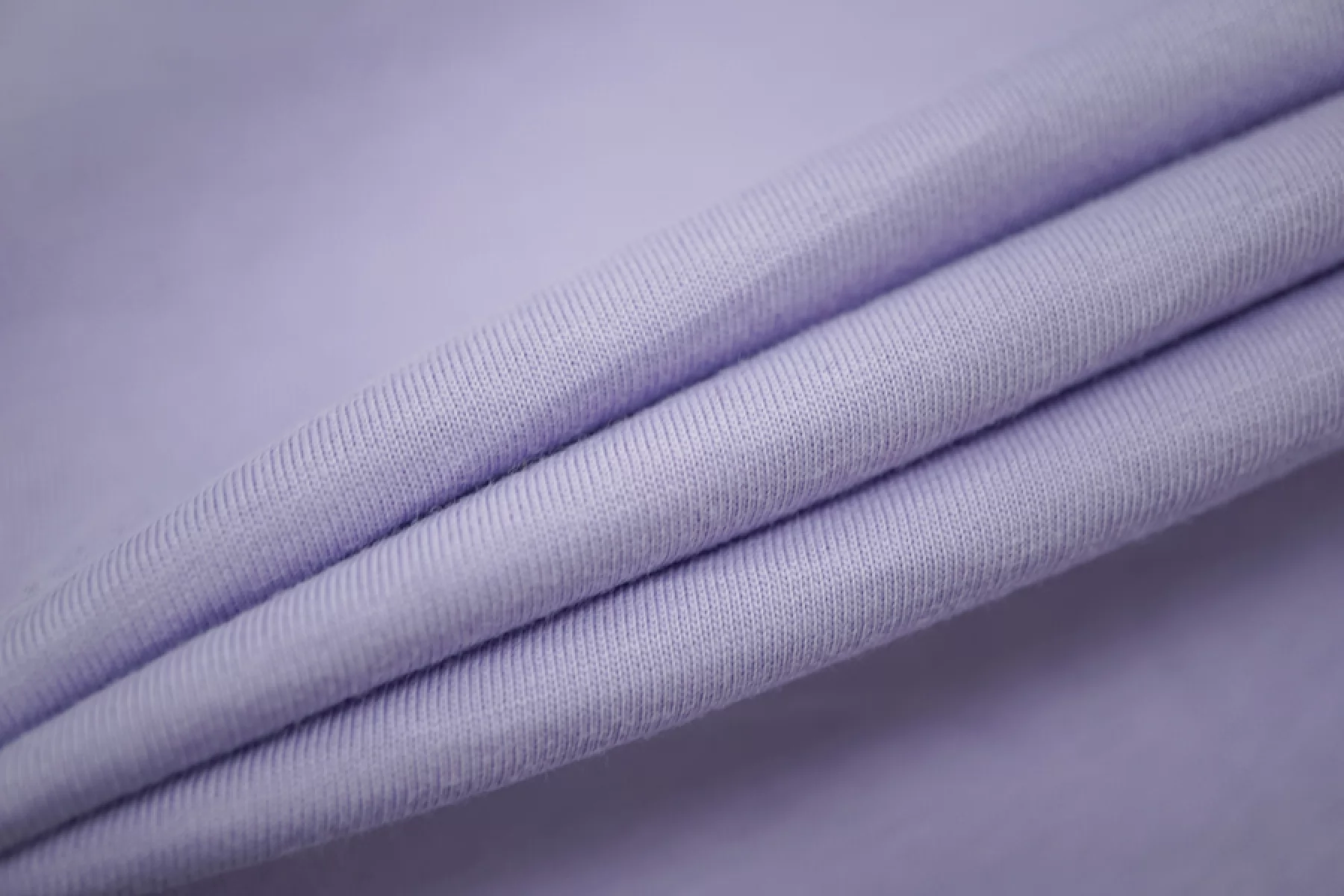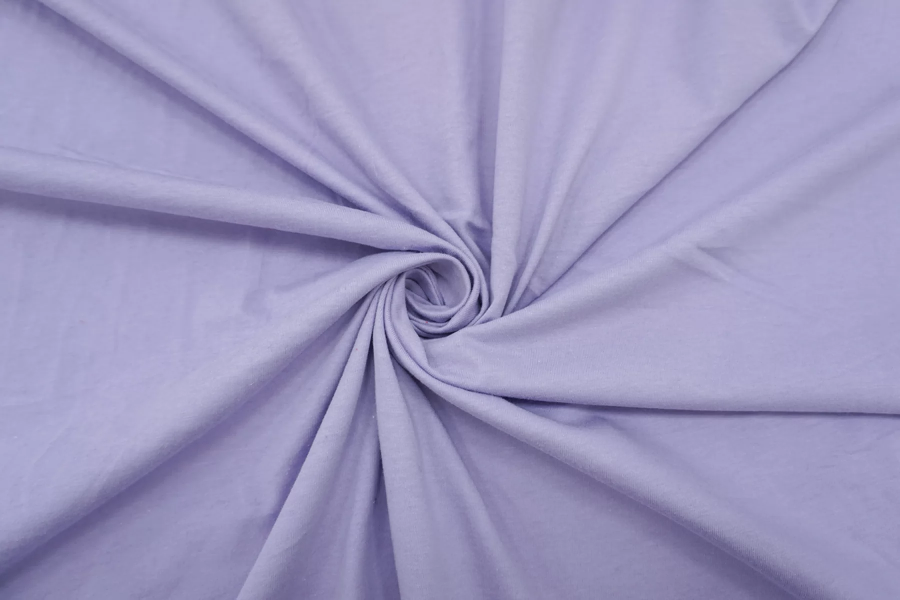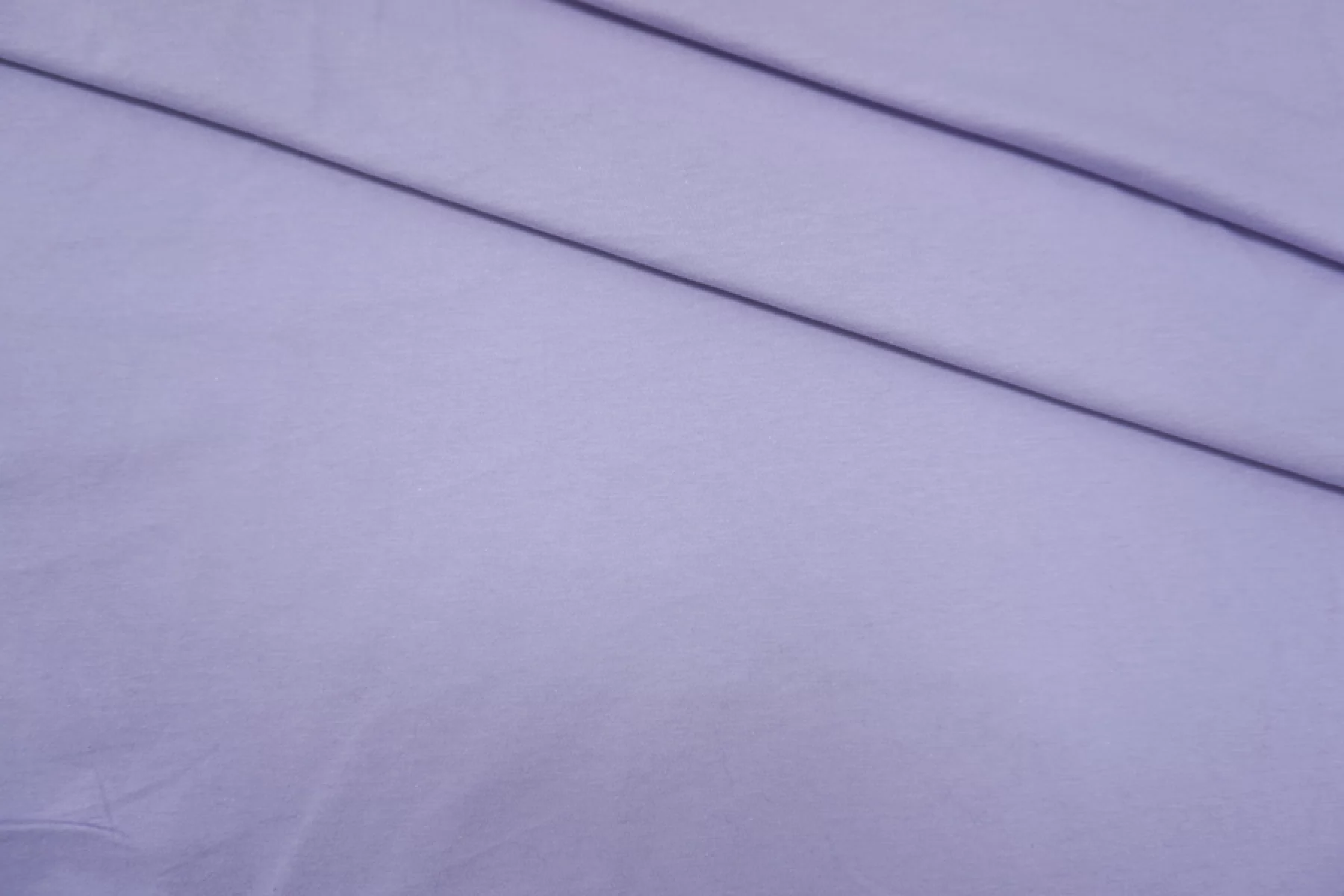 Футболочный трикотаж из хлопка, по плетению кулирная гладь. Цвет сиреневый. Трикотаж просвечивает при растяжении, пластичный, эластичный. Подойдет для пошива майки, футболки, топа, платья-футболки.