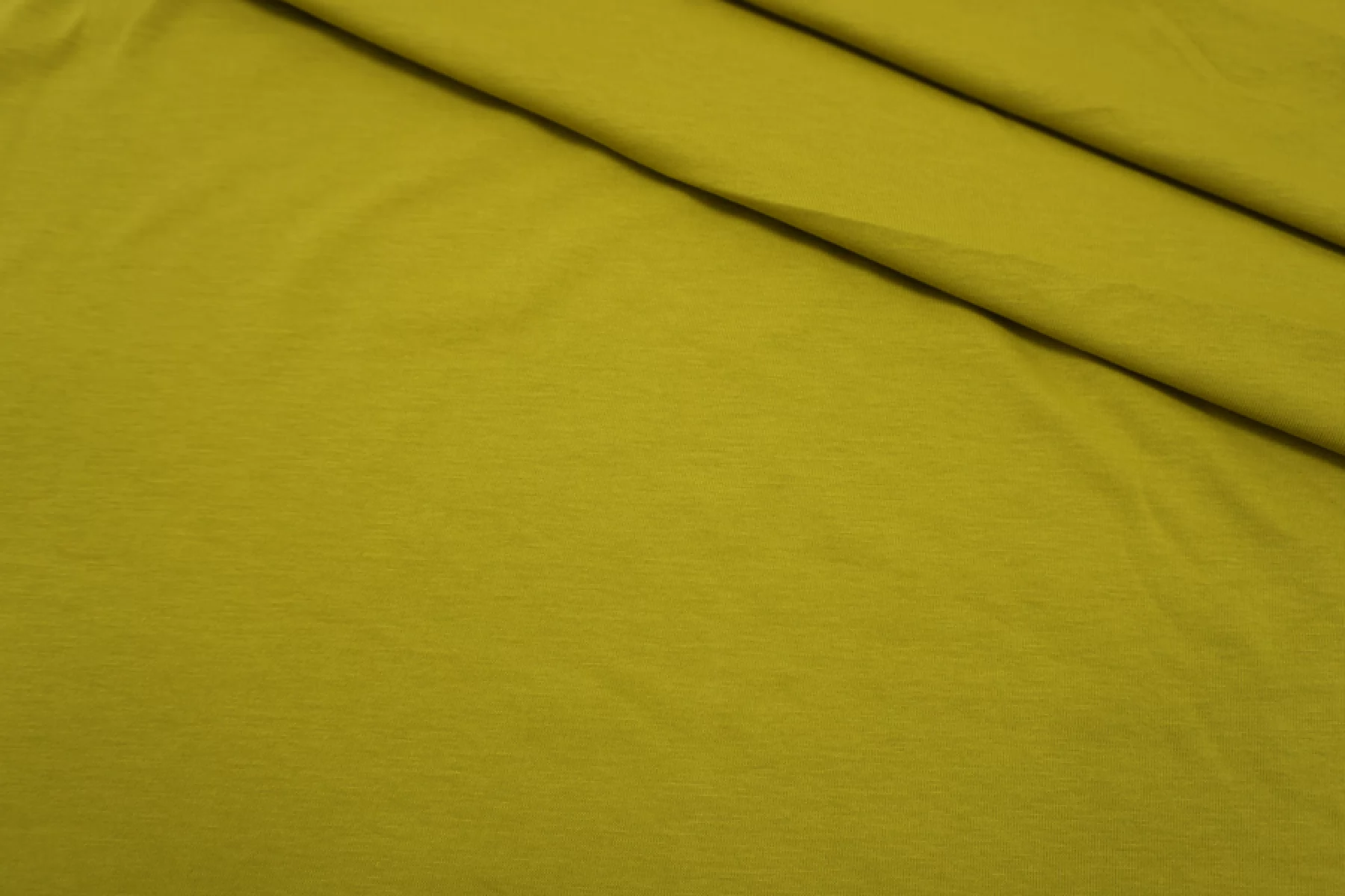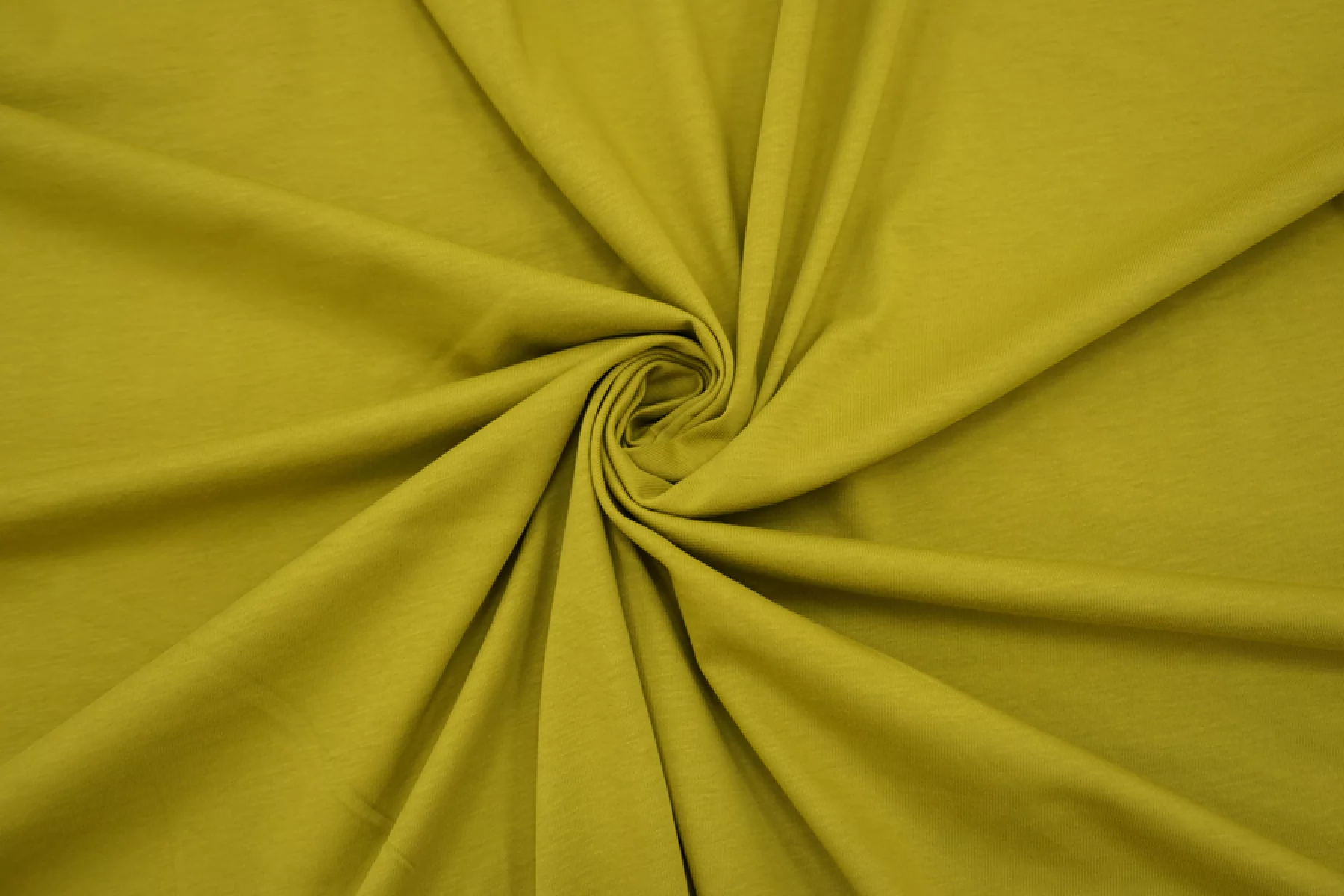 Футболочный трикотаж из хлопка, по плетению кулирная гладь. Красивый, стильный желто-зеленый оттенок. Трикотаж просвечивает при растяжении, пластичный, эластичный. Подойдет для пошива майки, футболки, топа, платья-футболки.