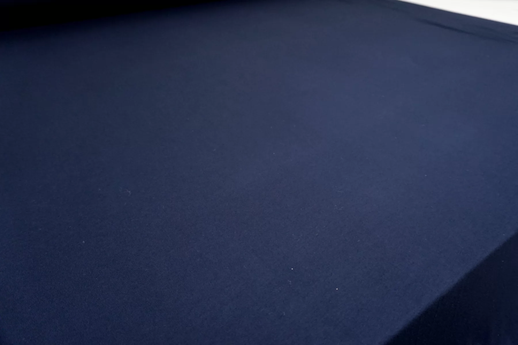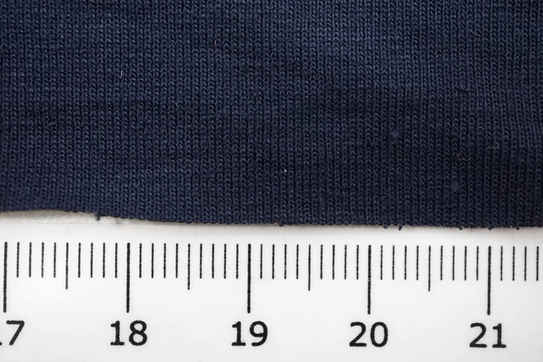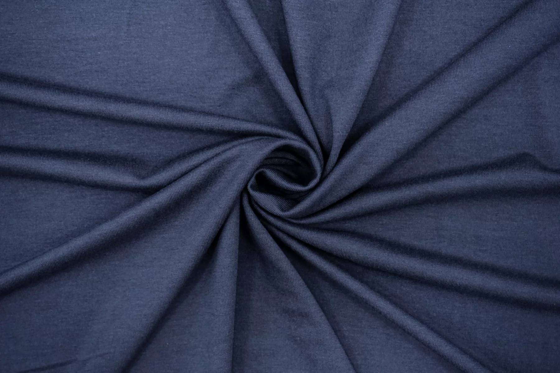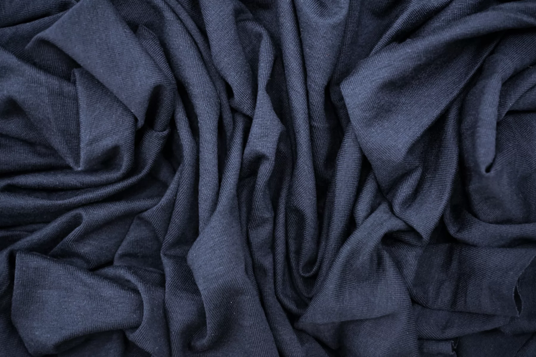 ПРИСУТСТВУЮ БЕЛЕСЫЕ ПОЛОСЫ. СМ. НА ФОТО. Итальянский трикотаж - кулирная гладь из вискозы в темно-синем цвете. Трикотаж немного просвечивает, пластичный, эластичный. Тактильно приятный и мягкий. Подойдет для пошива майки, футболки, топа, платья-футболки, домашней одежды.