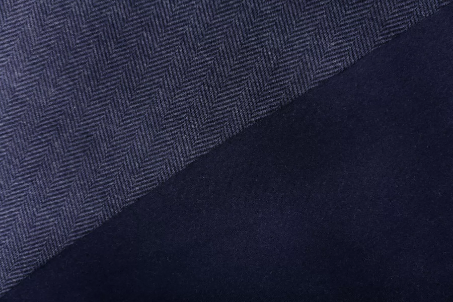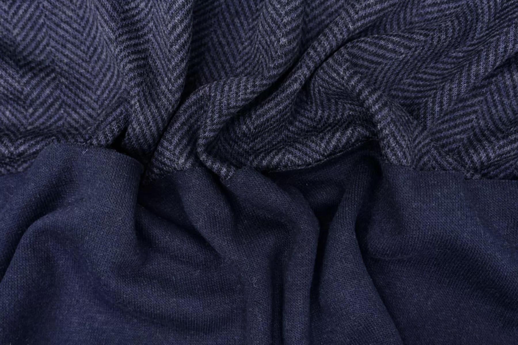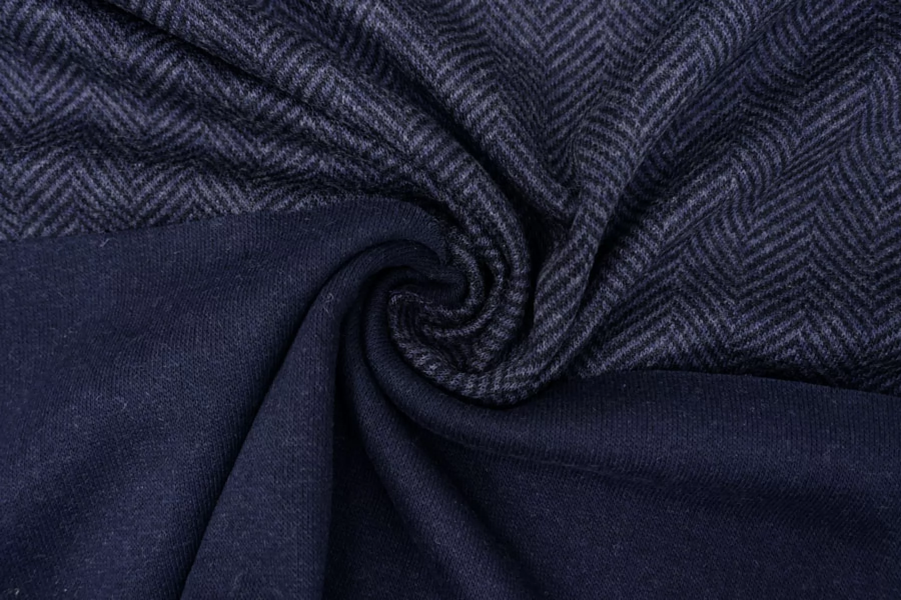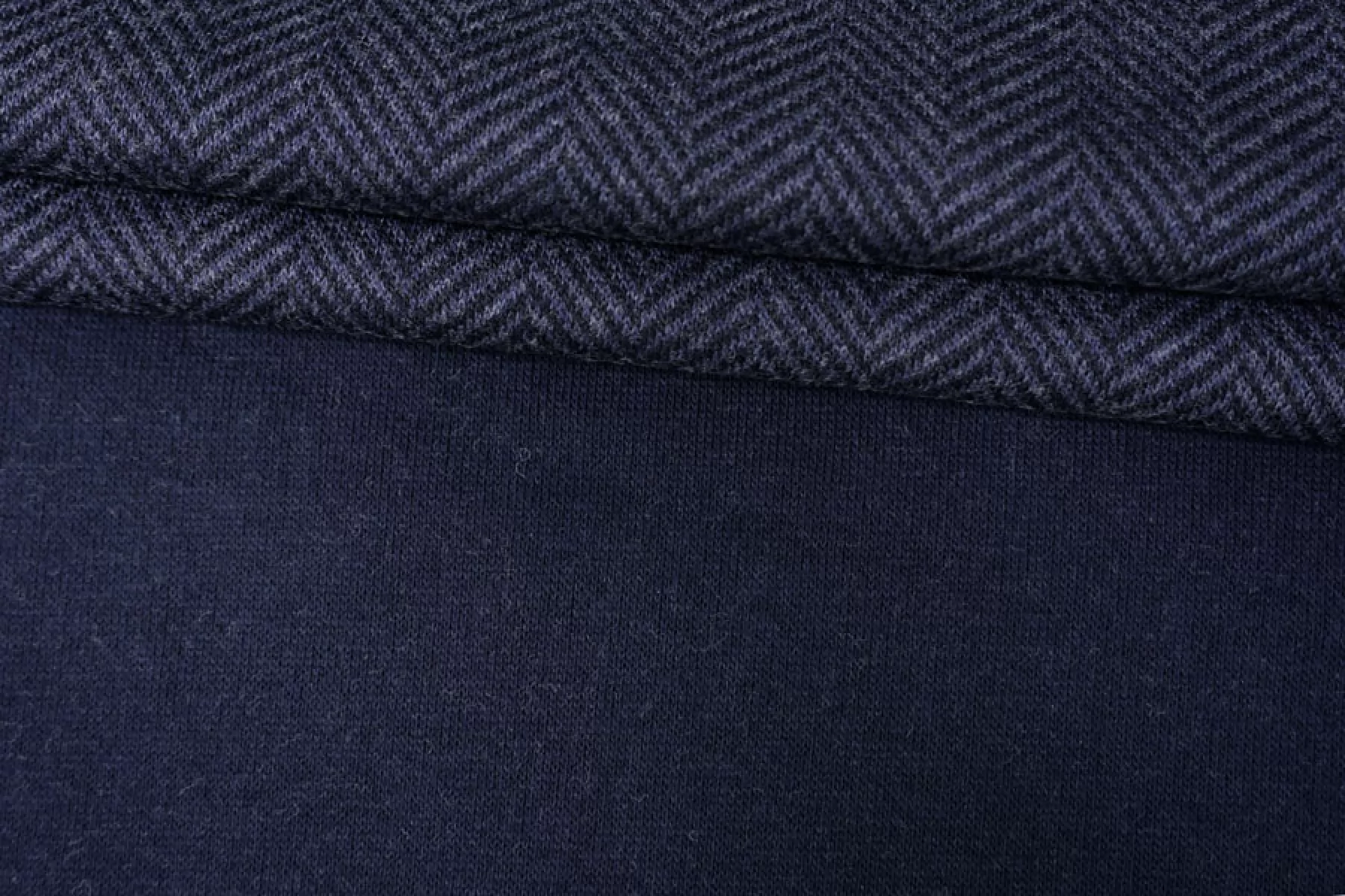 Прекрасный двуслойный (слои не разделяются) трикотаж с добавлением шерсти качества virgin, двусторонний. Одна сторона - елочка сине-черная, другая сторона- синяя. Мягкий, приятный, с очень легким начесом, не колется. Хорошо тянется. Не просвечивает. Плотненький. Форму держит. Пластичный. Подойдет для пошива костюма ,платья, мягкого жакета. Учитывайте возможную усадку.