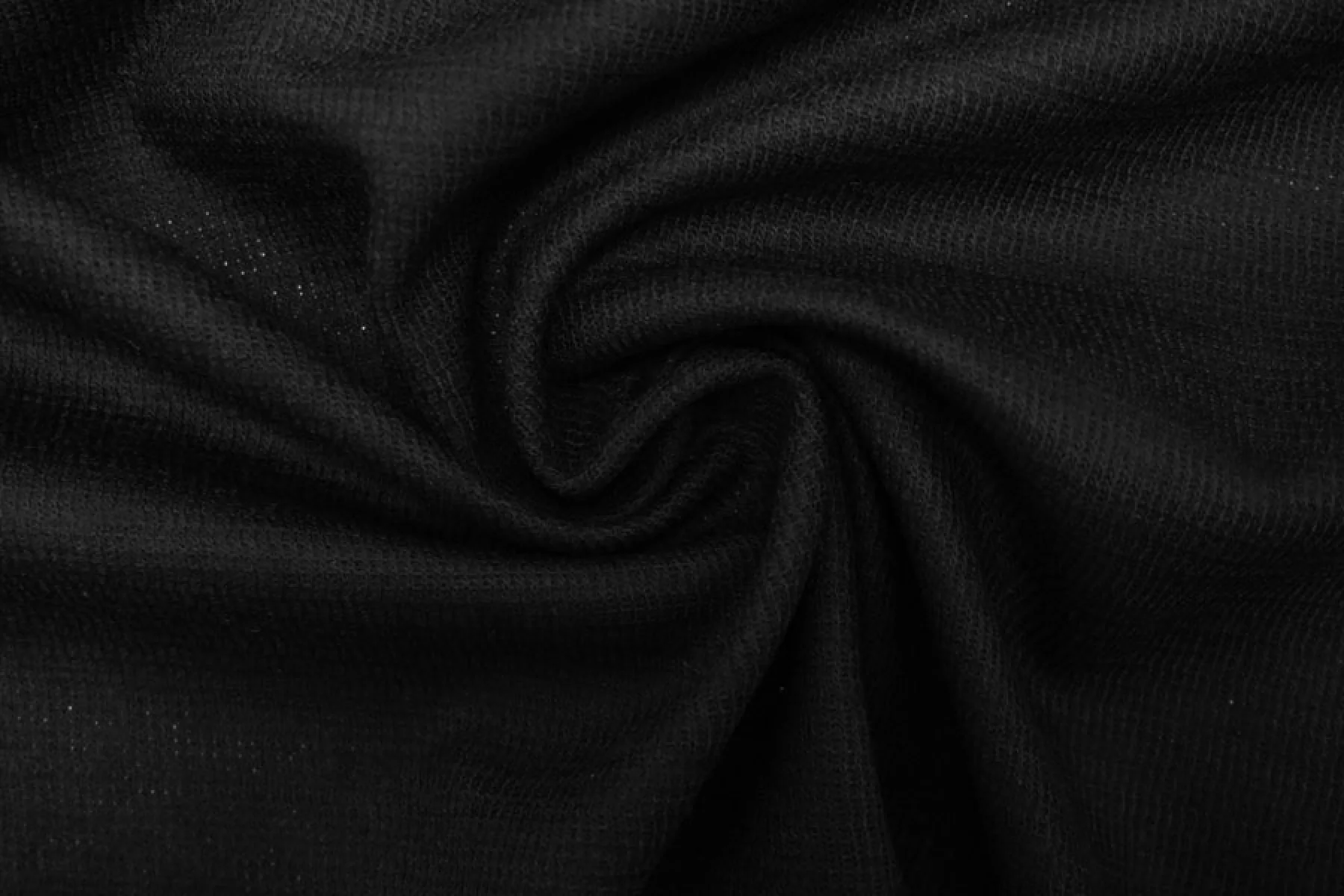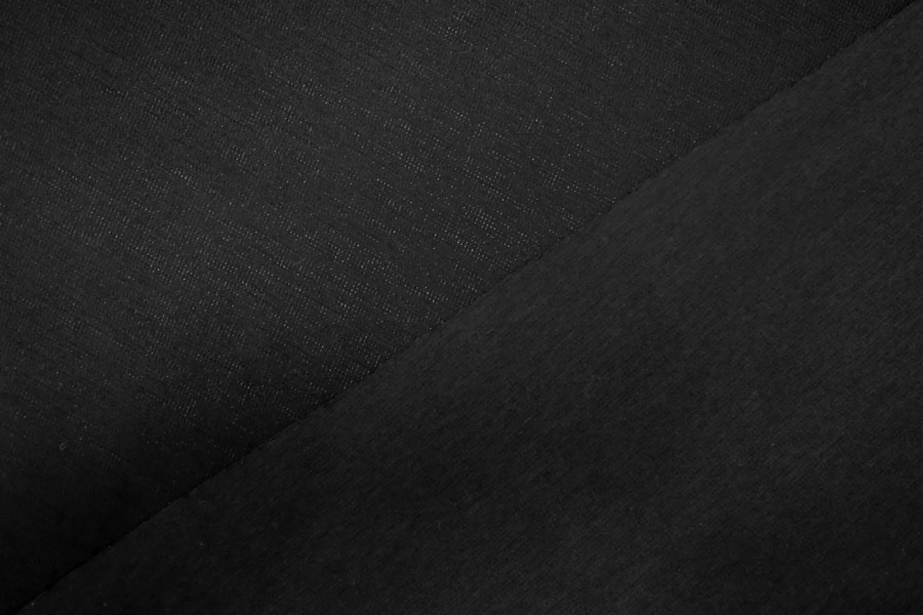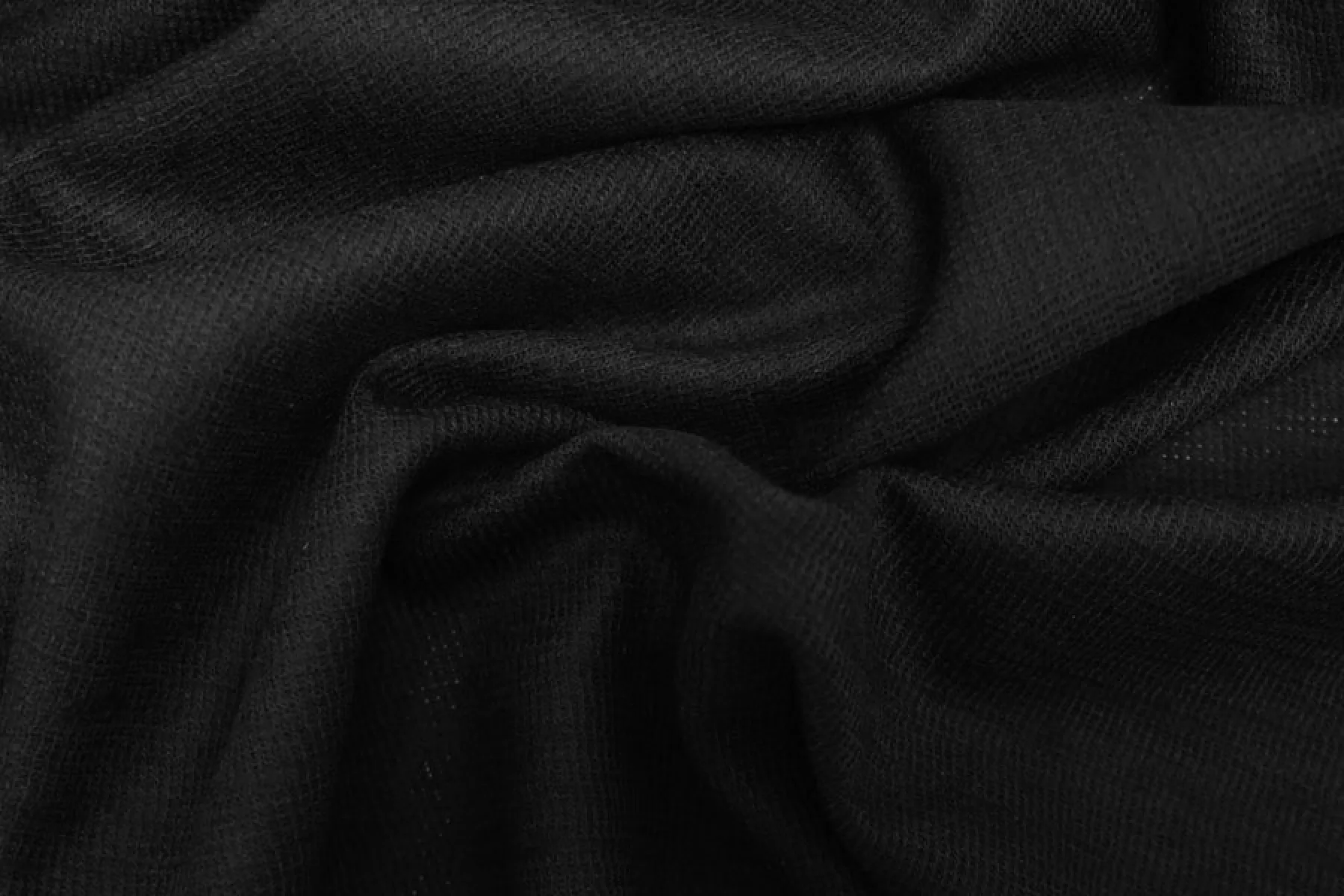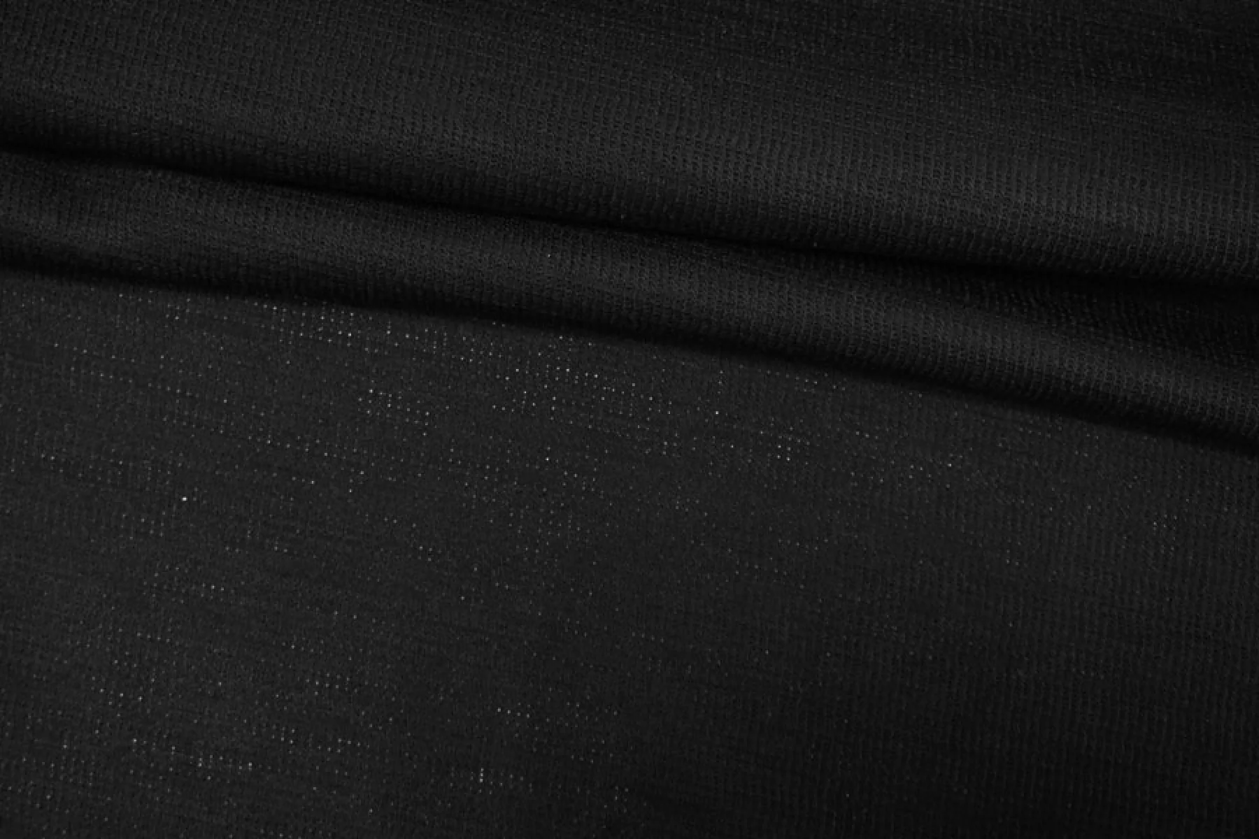 Отличный трикотаж двусторонний, одна сторона хлопковая, другая шерстяная. Черного цвета. Плетение не плотное, просвечивает. Хорошо тянется. Гладкий и приятный наощупь. Форму немного держит. Подойдет для пошива майки, футболки, топа, можно использовать в качестве подклада, греющей нижней юбки, тонкой водолазки. Уход деликатный.