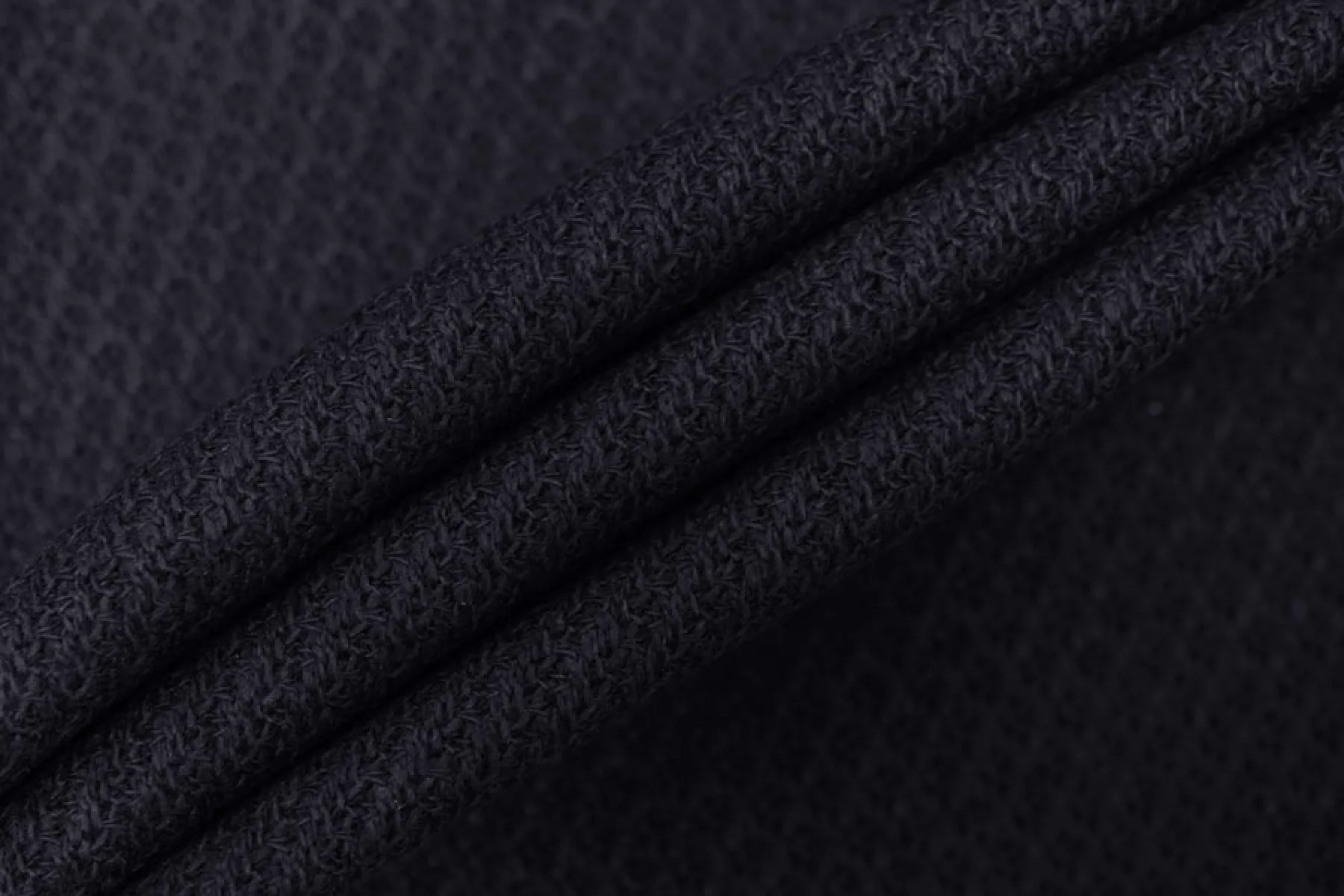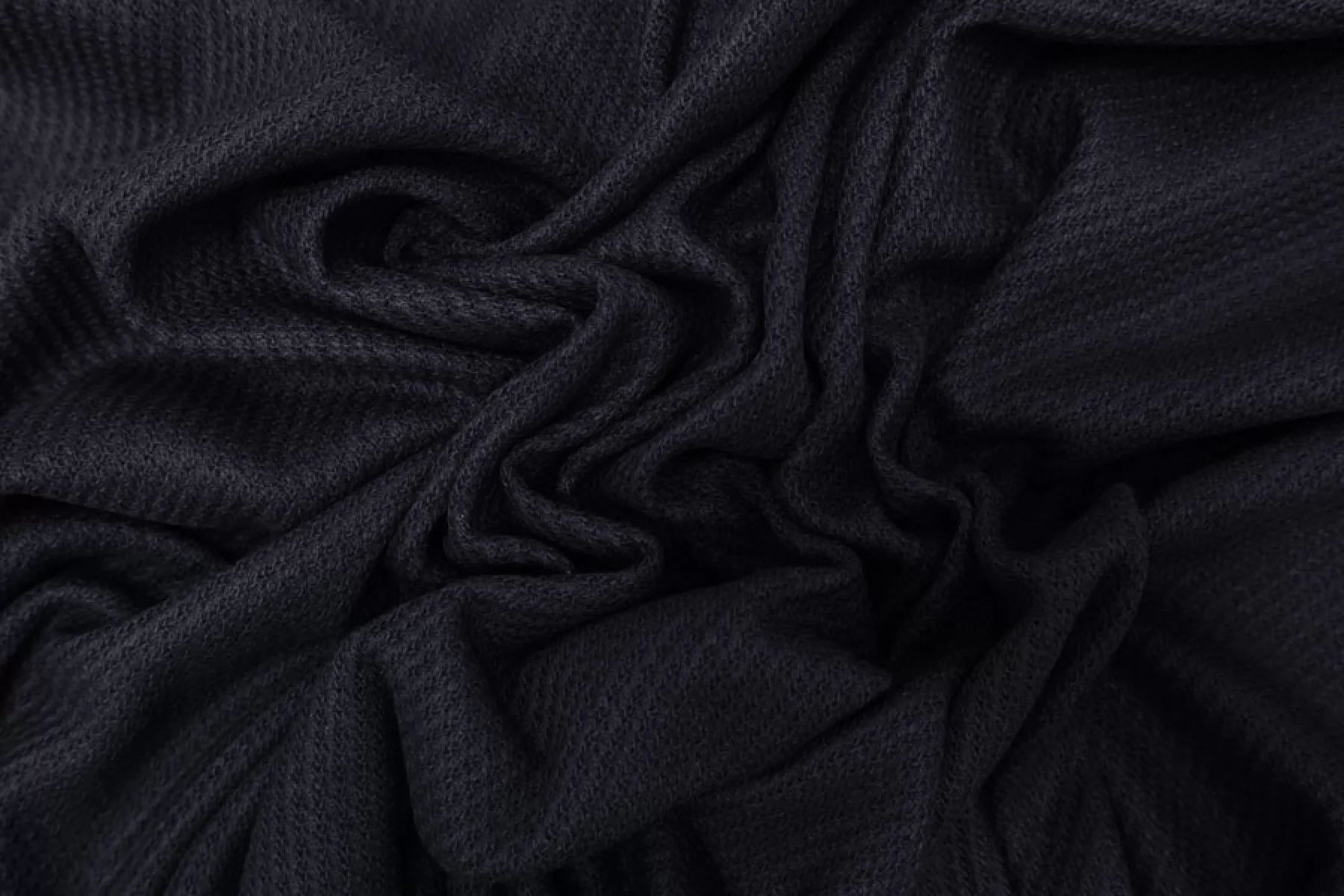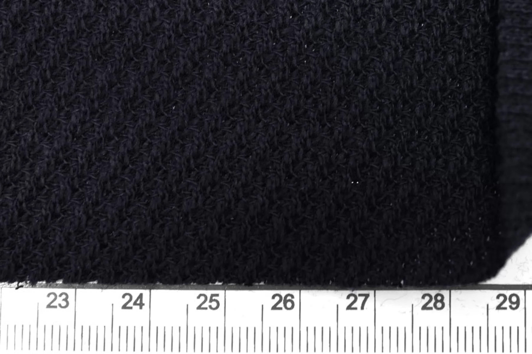 Трикотаж из хлопка с фактурной поверхностью, в очень темном синем цвете, почти черном. Материал тактильно приятный и мягкий, изнанка гладкая. Тянется благодаря плетению. Немного просвечивает силуэт если смотреть насквозь. Держит форму, довольно пластичный. Подойдет на кофты, кардиганы, комфортные штаны.