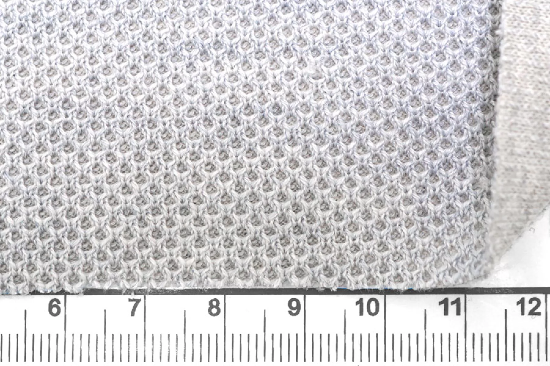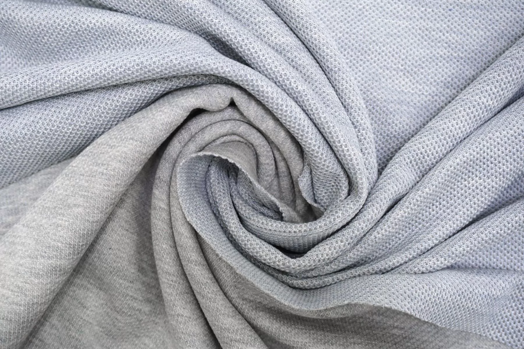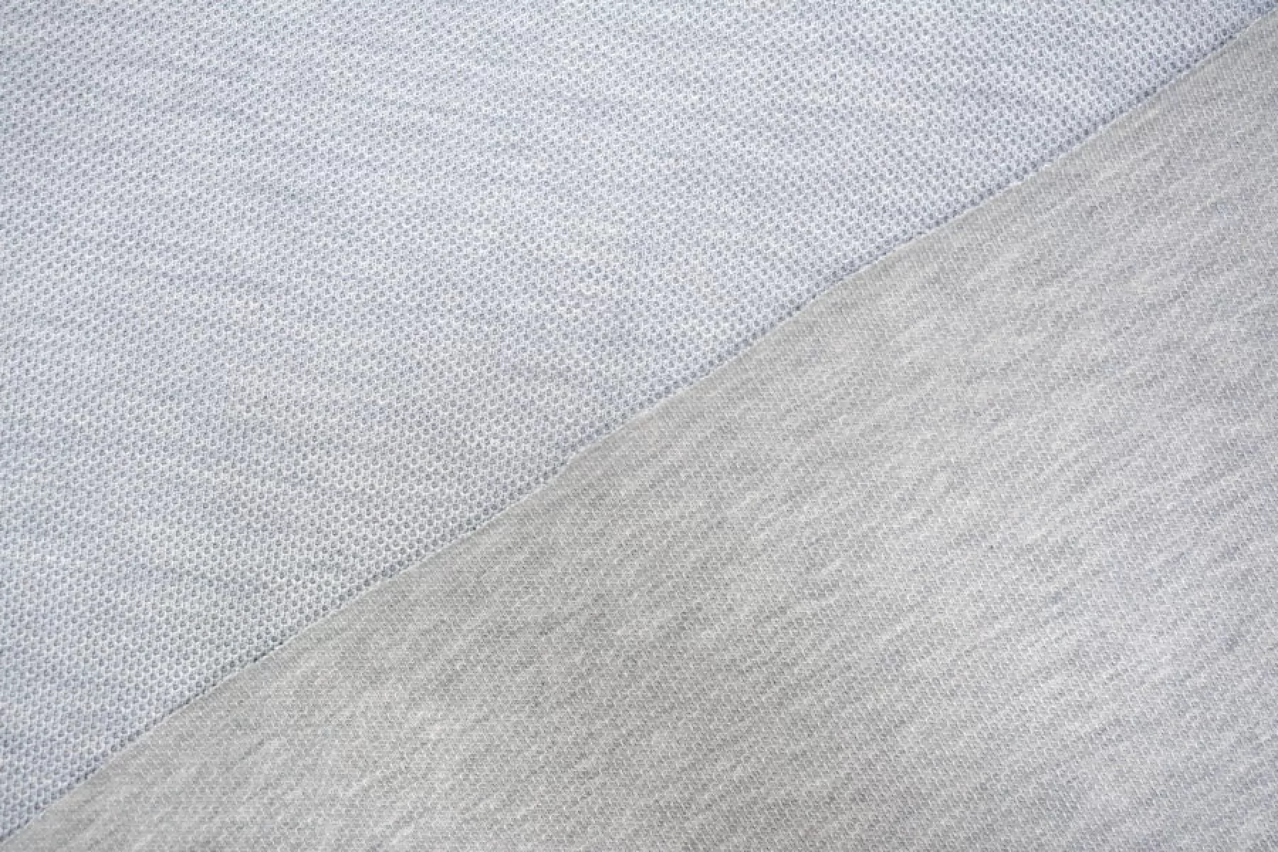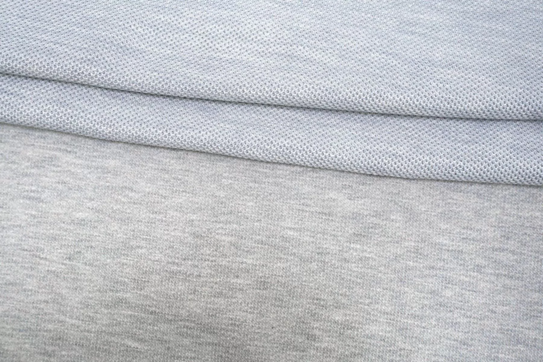 Трикотаж из хлопка с шёлком, с фактурной ячеистой поверхностью, напоминает соты. Цвет светлый серый. Материал тактильно приятный и мягкий, изнанка гладкая. Тянется благодаря плетению. Минимально просвечивает силуэт. Совсем немного держит форму, довольно пластичен. Подойдет на футболки, свитшоты, туники, платья, лонгсливы, комфортные штаны.