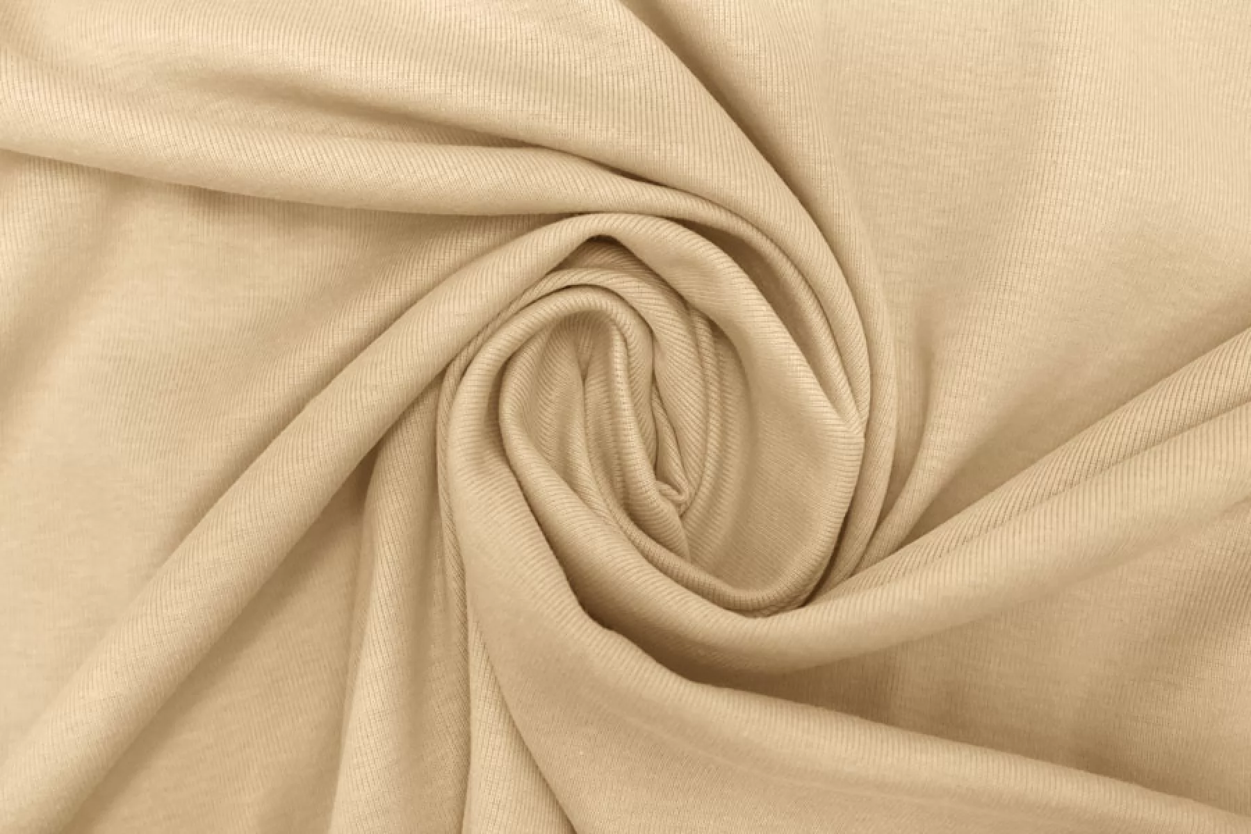 Хлопковый трикотаж, бежевого цвета (с желтинкой), по вязке ближе к интерлоку. Хорошо тянется за счет плетения, просвечивает средне. Тактильно очень приятный, гладкий. Пластичный, форму практически не держит. Очень комфортный к телу. Можно использовать для пошива маек, футболок, платьев, туник и другого.