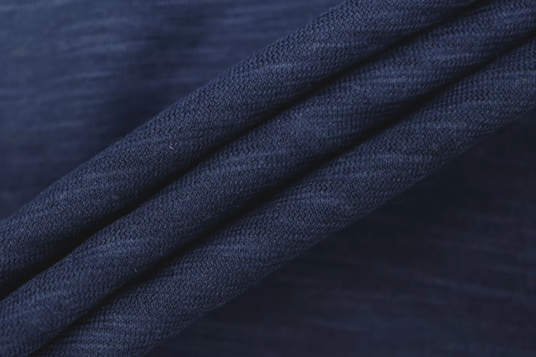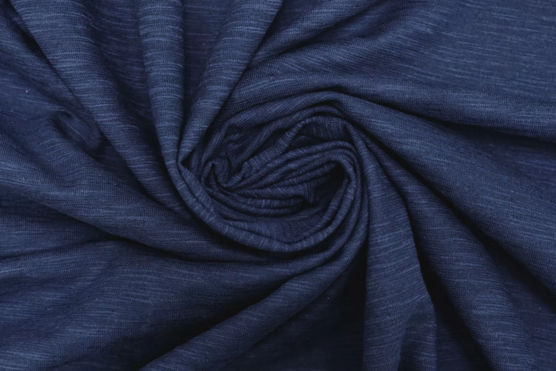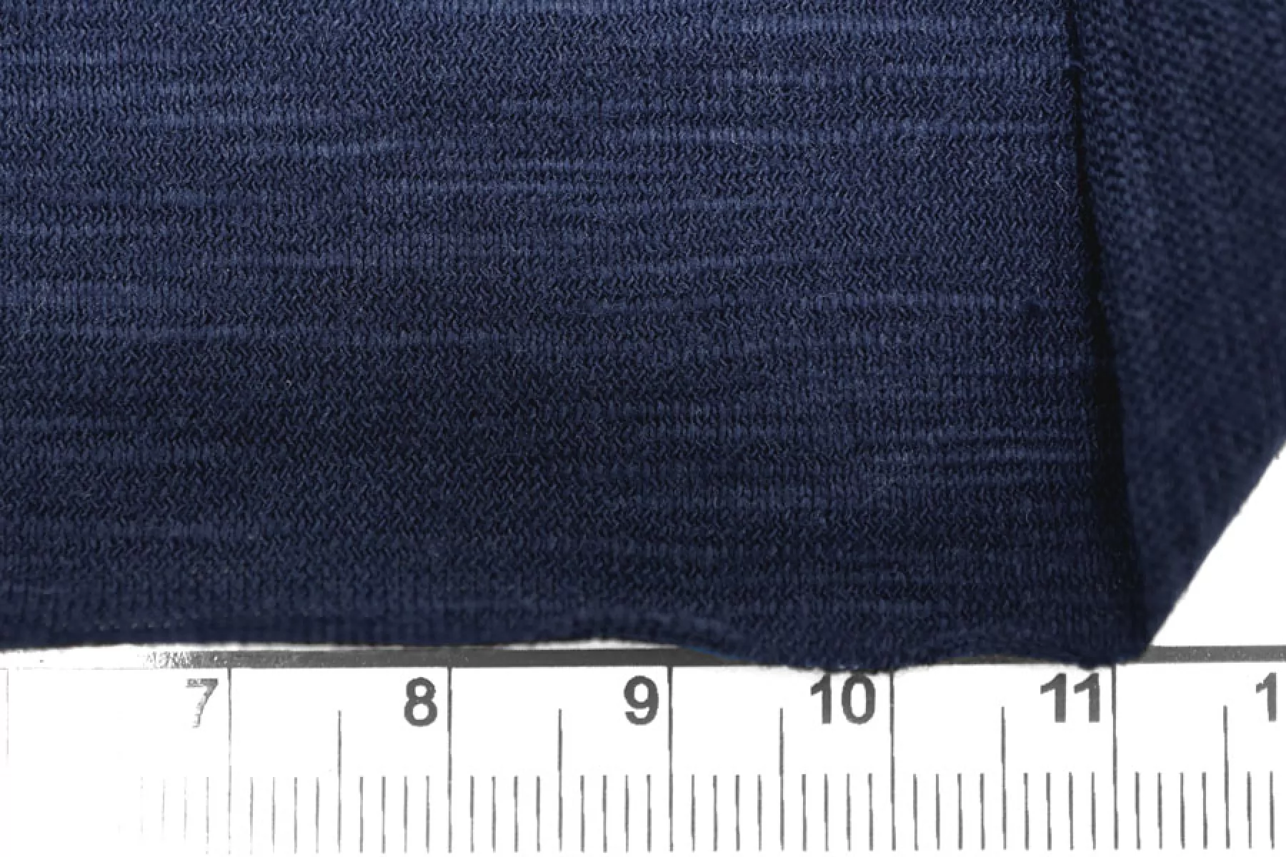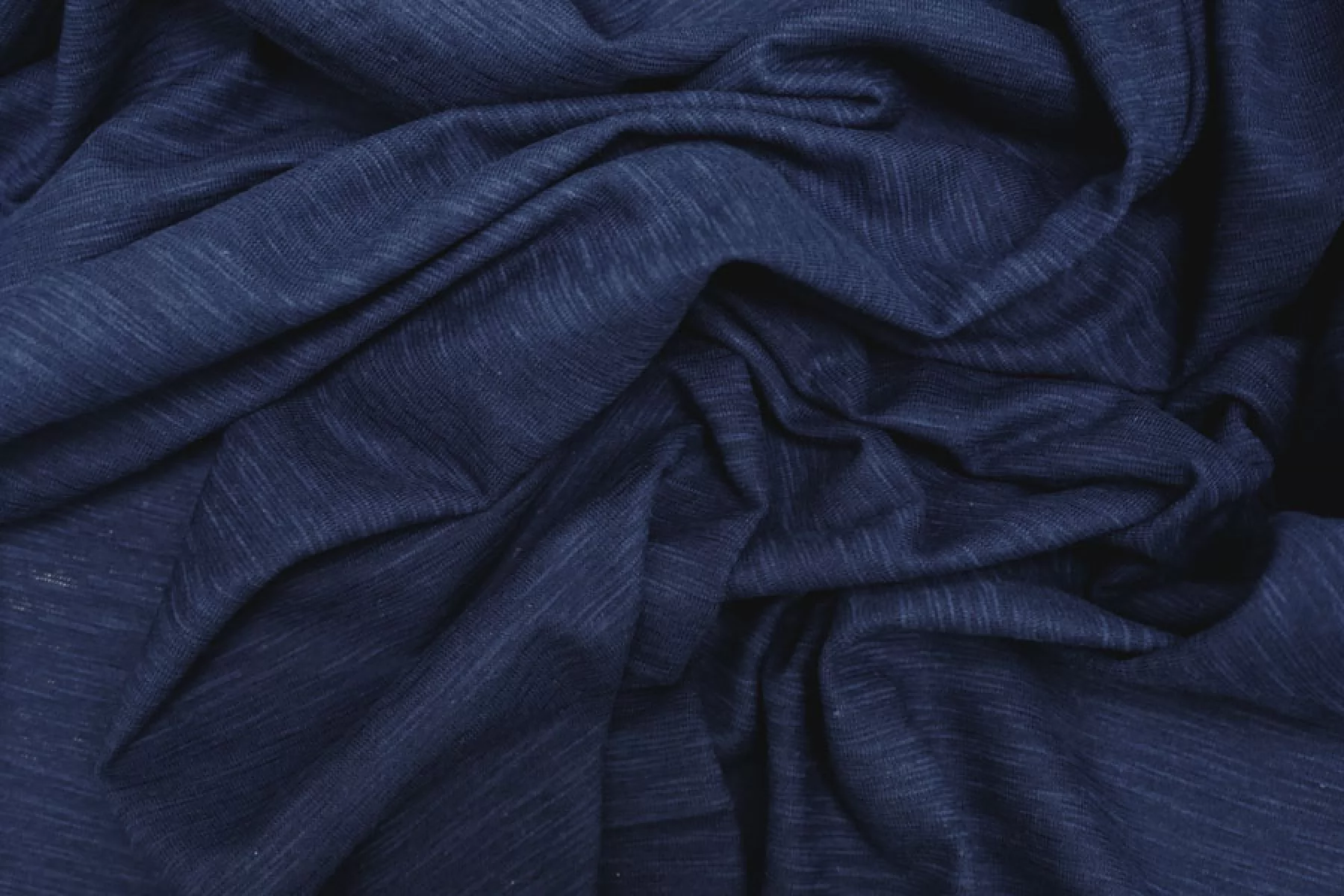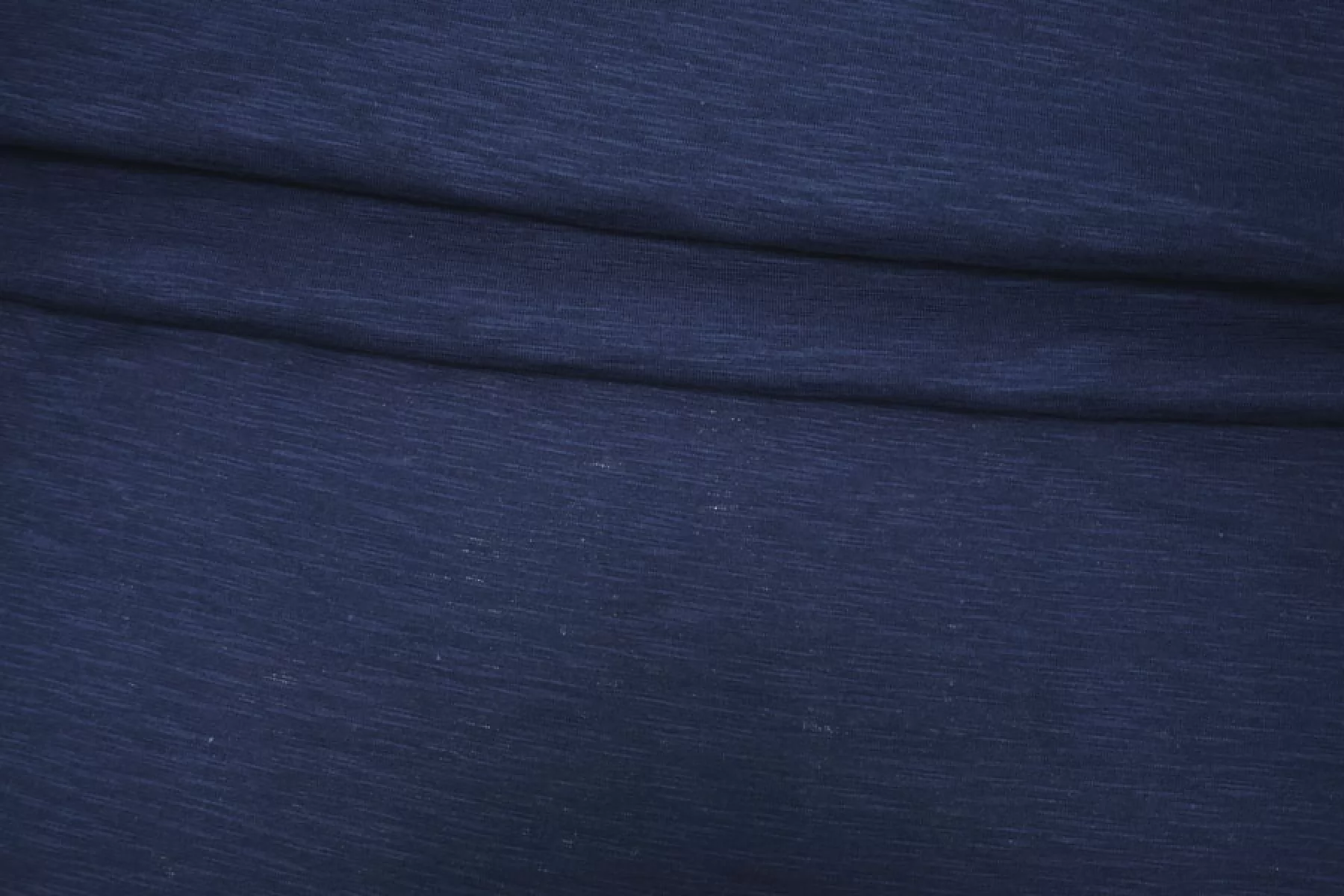 Хлопковый трикотаж от бренда Etro, в немного затемнённом синем цвете, по вязке ближе к кулирке. Присутствуют фактурные утолщения нити, визуально напоминают лен. Хорошо тянется, просвечивает. Тактильно очень приятный, мягкий, гладкий. Пластичный, форму практически не держит. Очень комфортный к телу. Можно использовать для пошива маек, футболок, платьев, туник и другого.