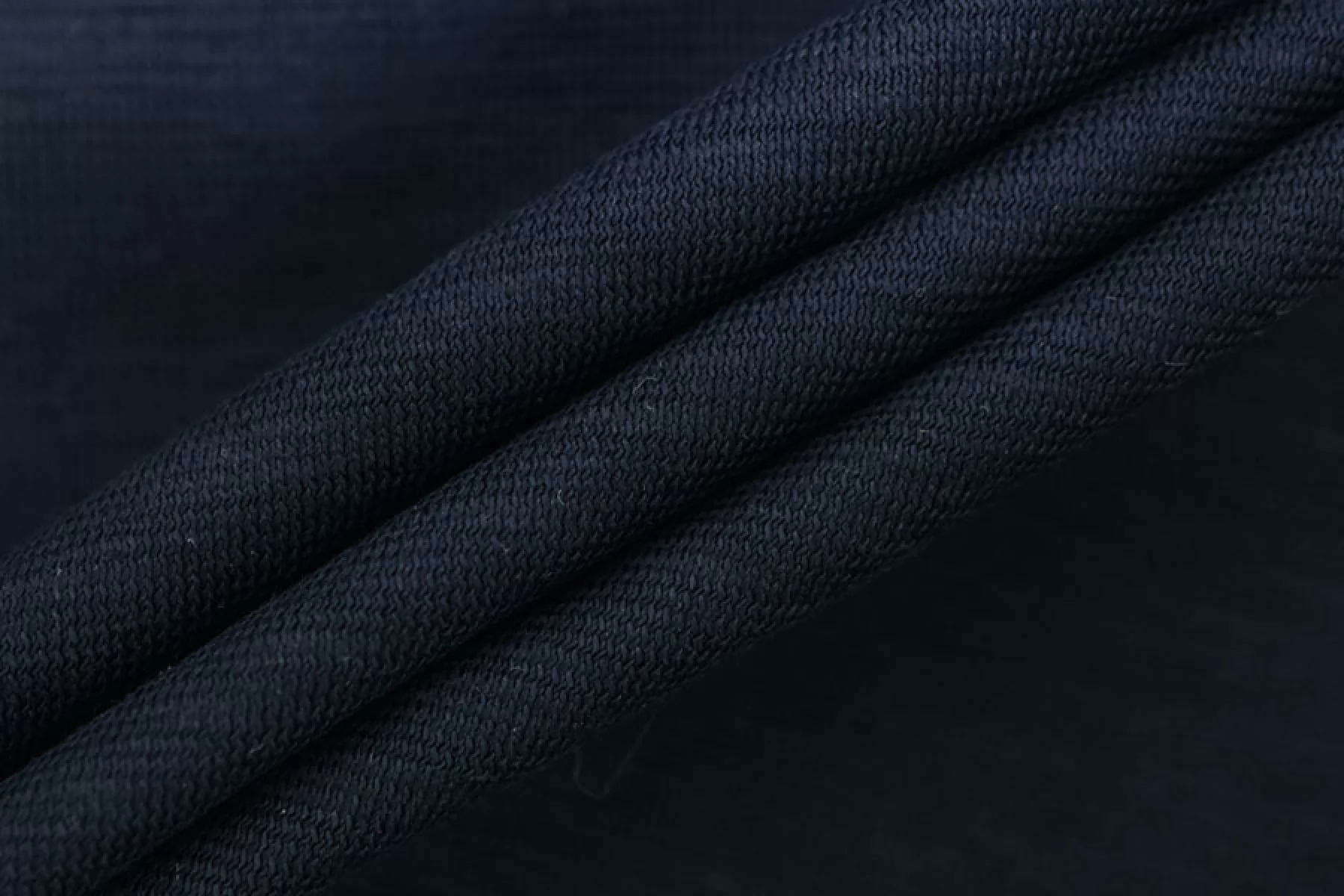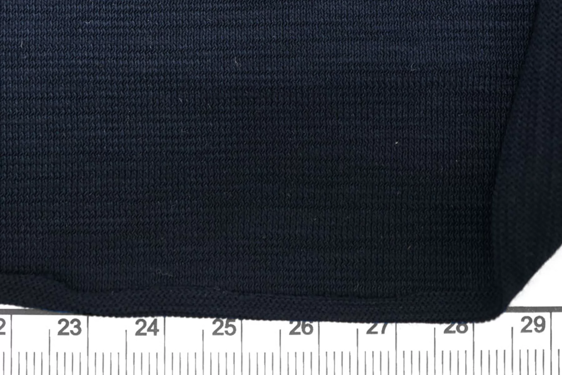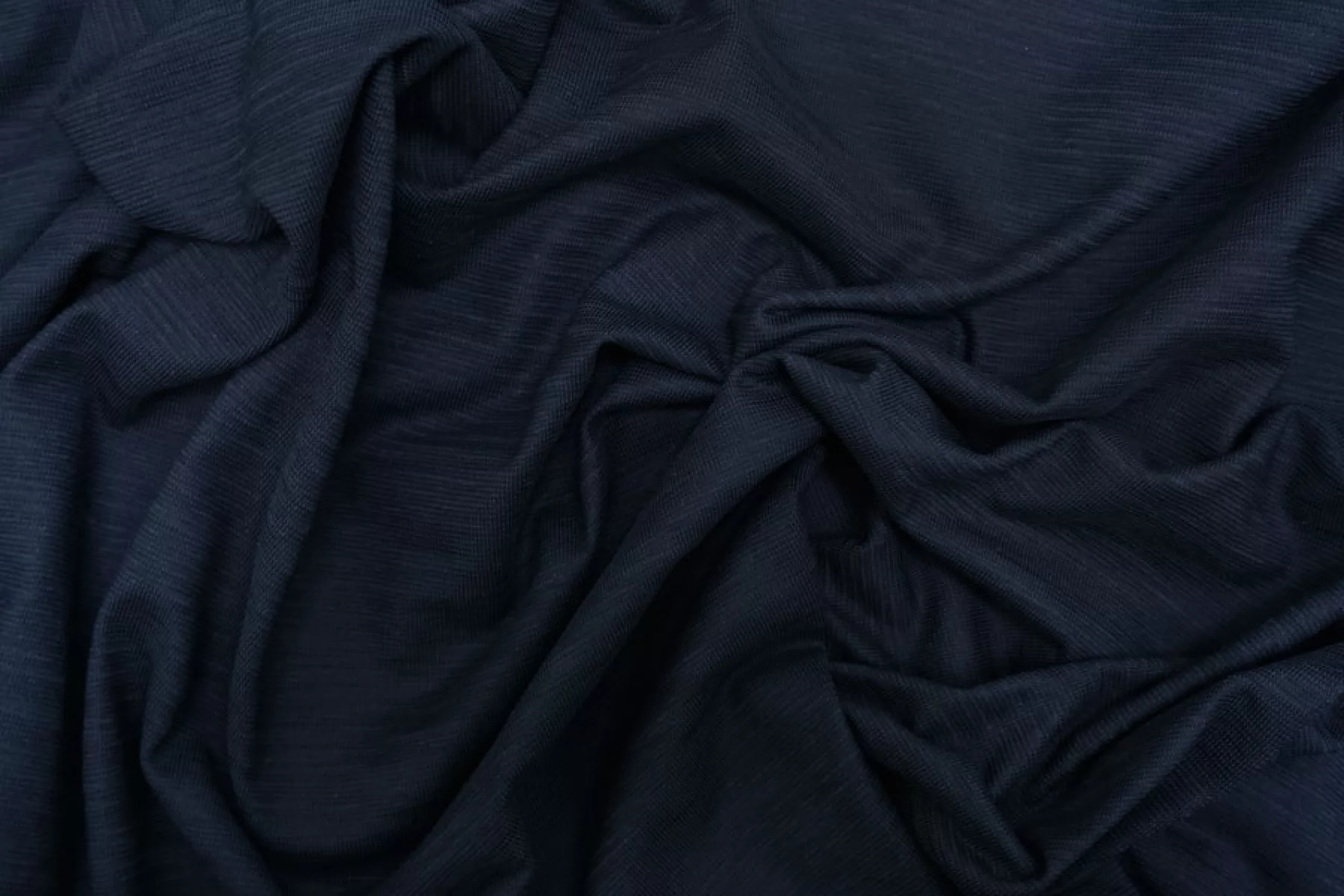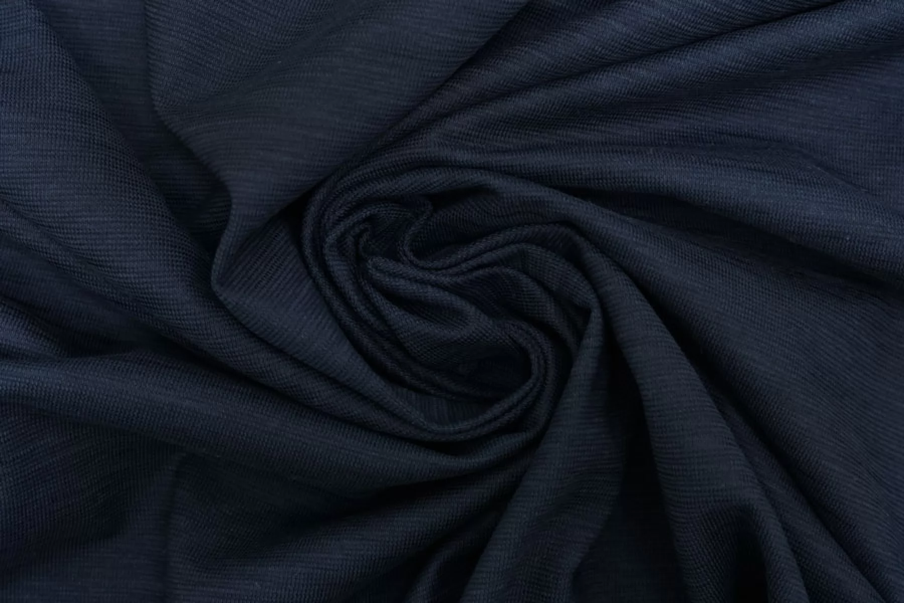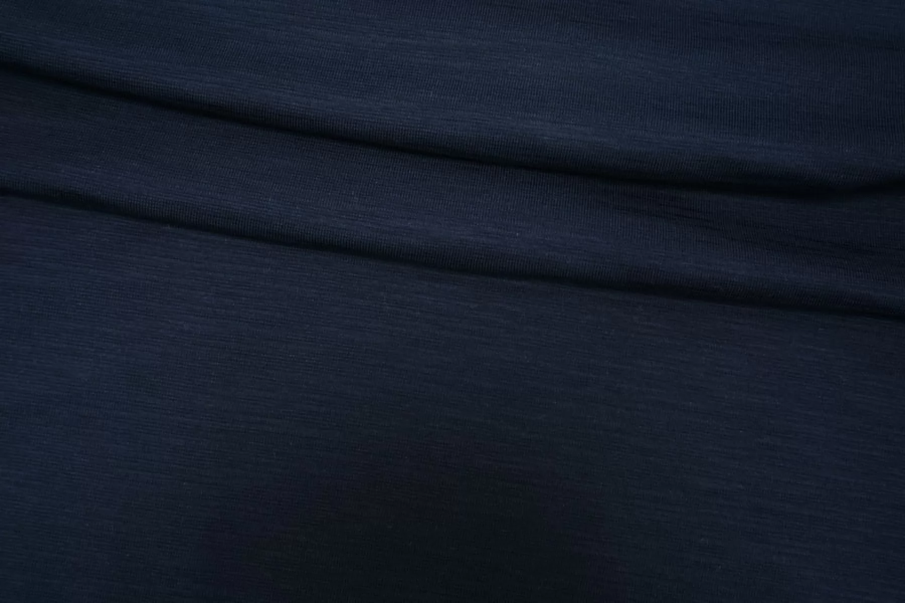 Хлопковый трикотаж от бренда Etro, в очень тёмном синем цвете, по вязке ближе к кулирке. Присутствуют фактурные утолщения нити, визуально напоминают лен. Хорошо тянется, просвечивает. Тактильно очень приятный, мягкий, гладкий. Пластичный, форму практически не держит. Очень комфортный к телу. Можно использовать для пошива маек, футболок, платьев, туник и другого.