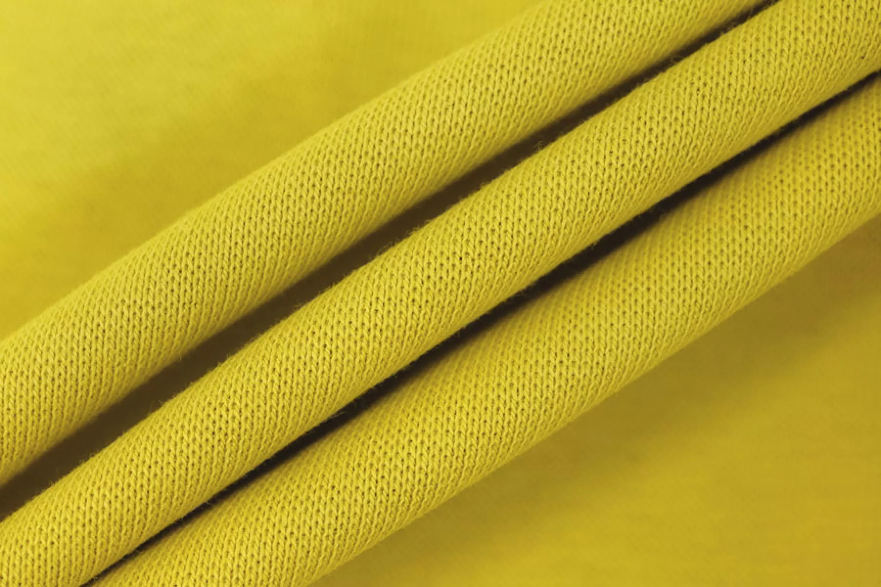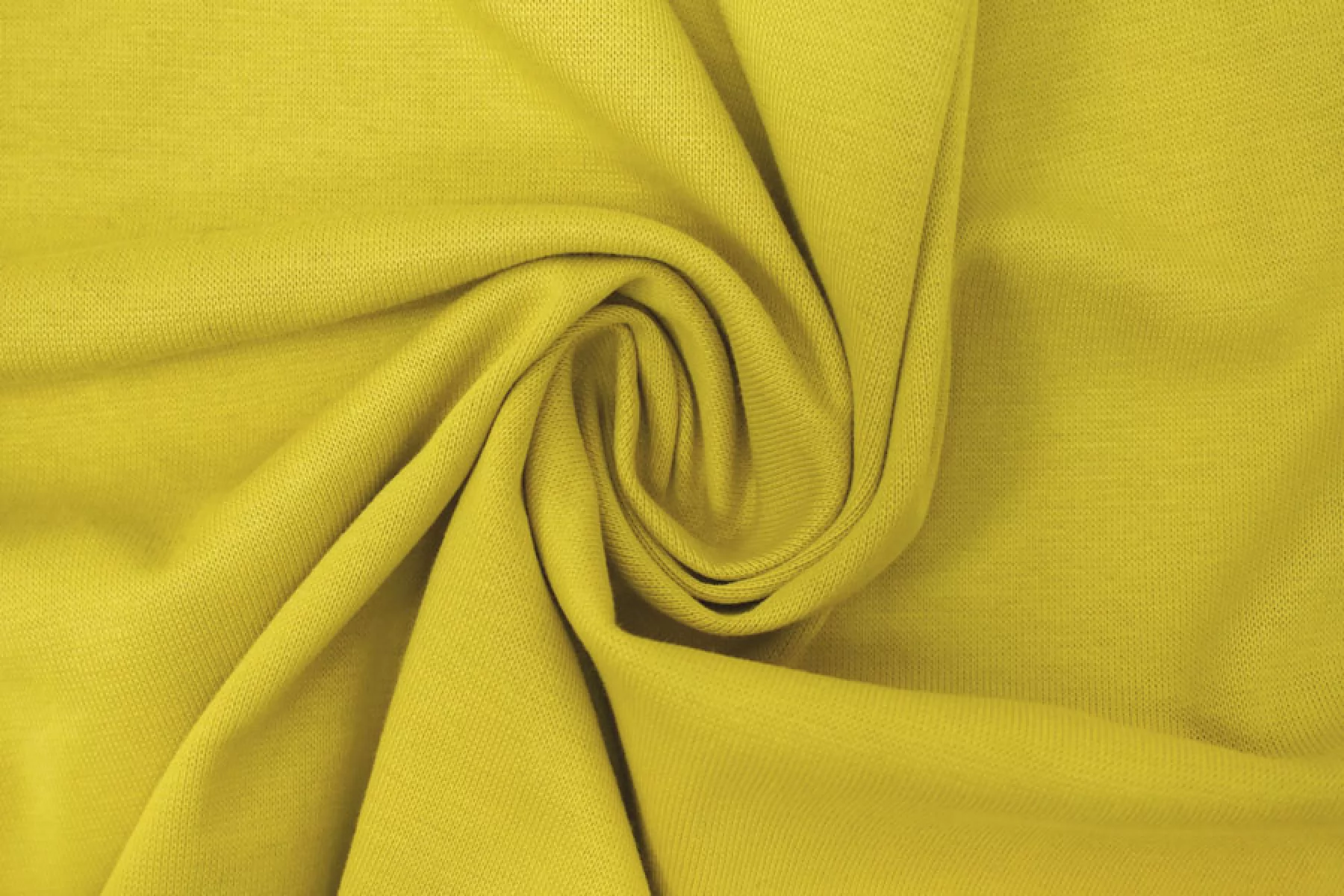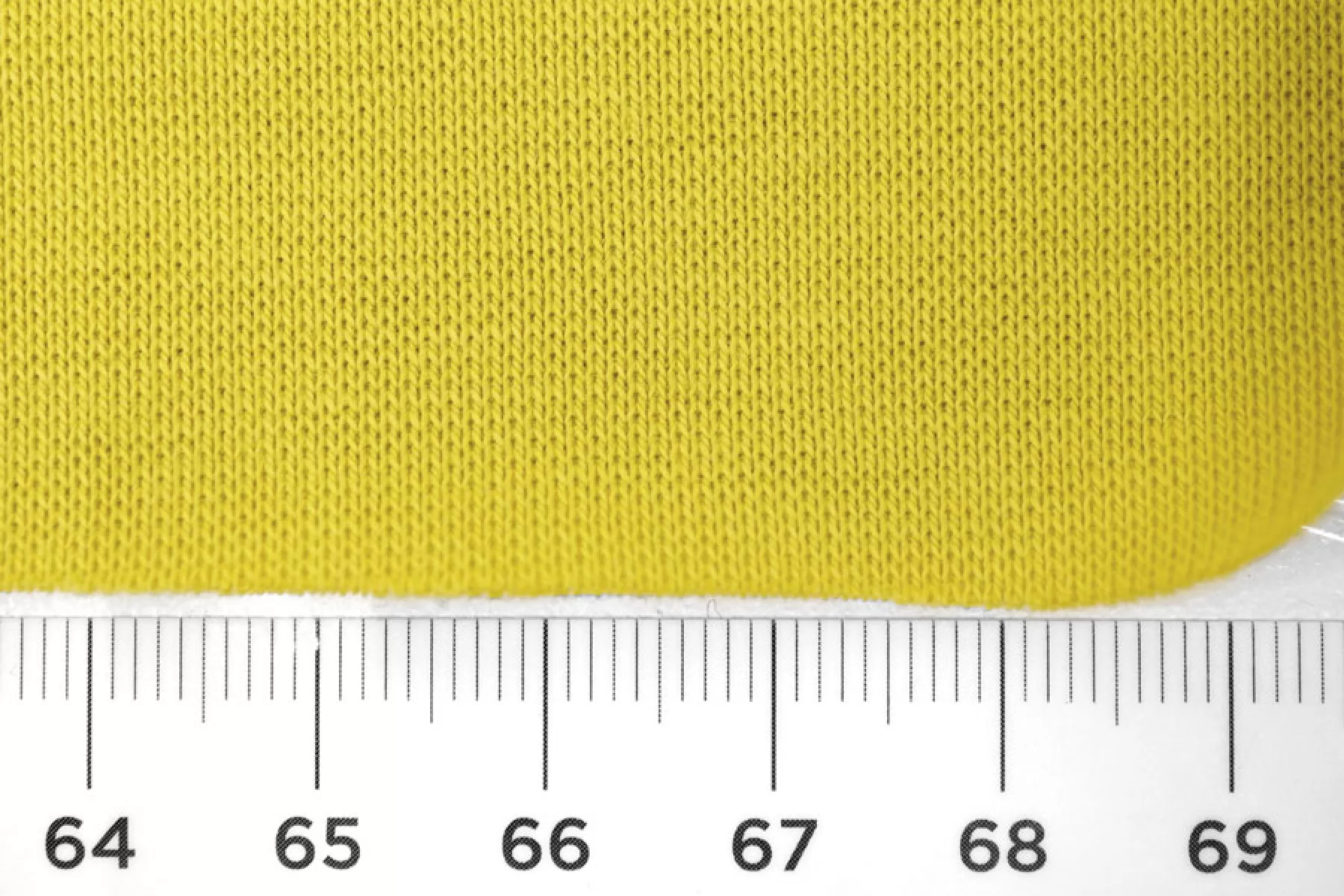 Итальянский хлопковый трикотаж - рибана горчичного цвета. Материал пластичный, мягкий, гладкий. С красивым блеском. Плотный, но тонкий. Немного просвечивает. Практически не мнется. Отлично тянется за счет плетения. Подойдет для пошива майки, футболки, топа, а также манжетов, подвязов или воротников.