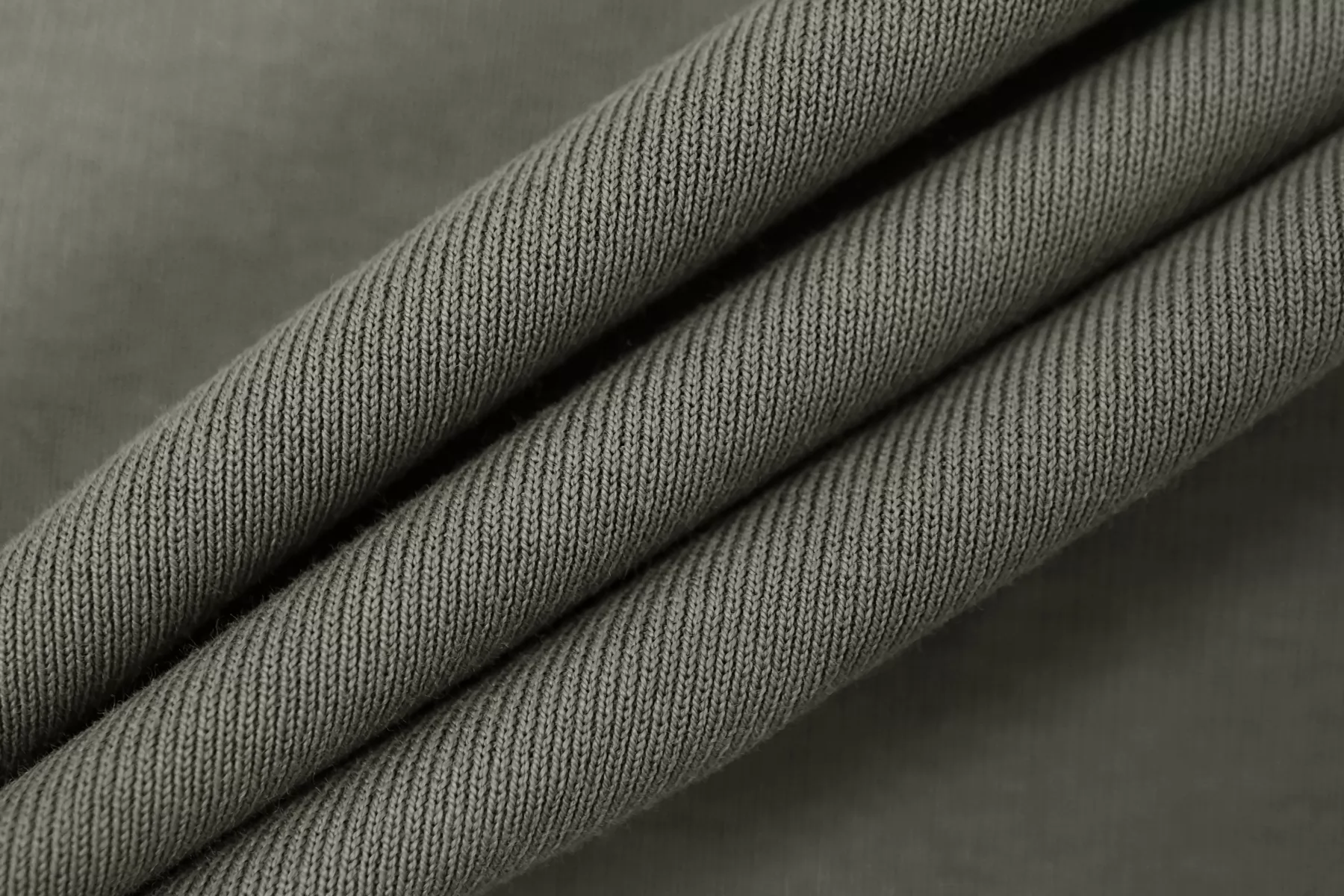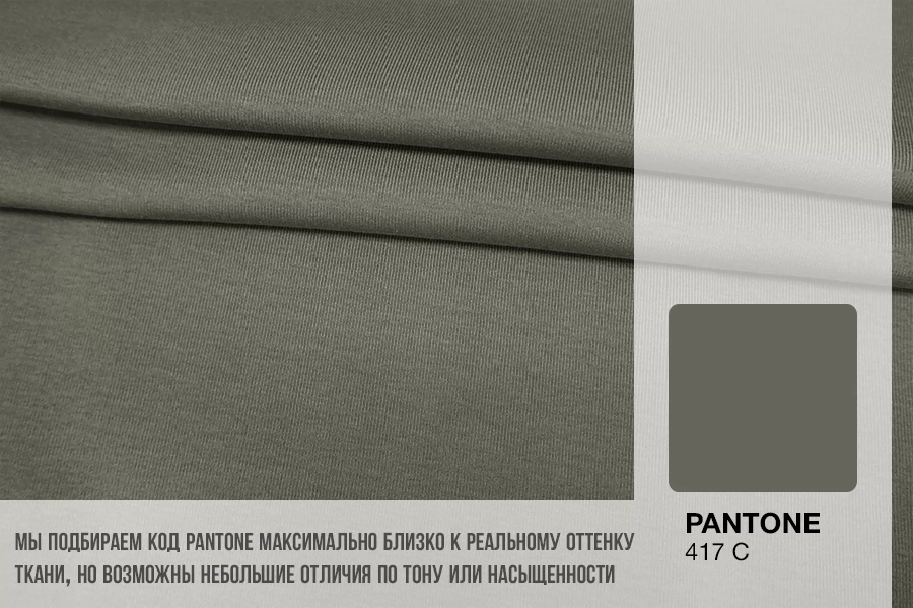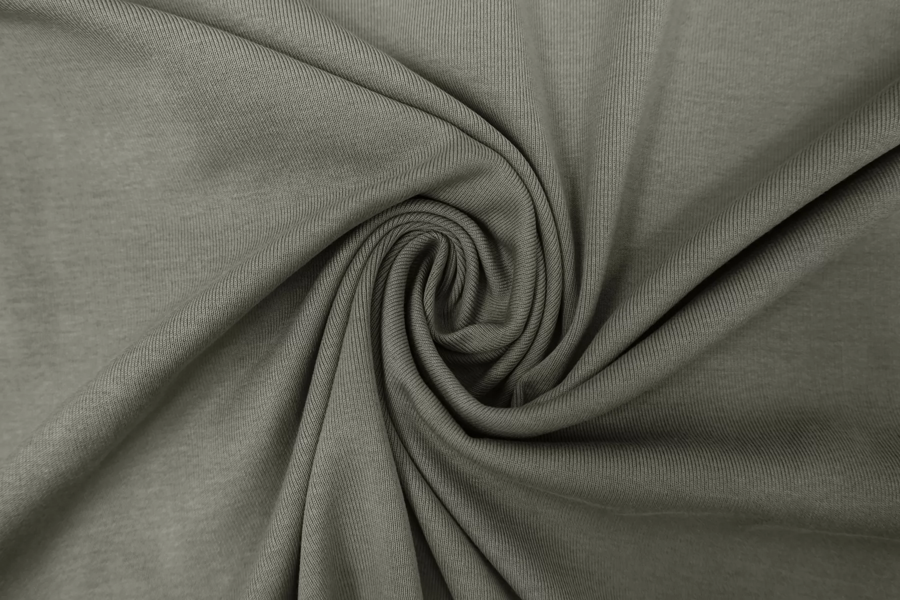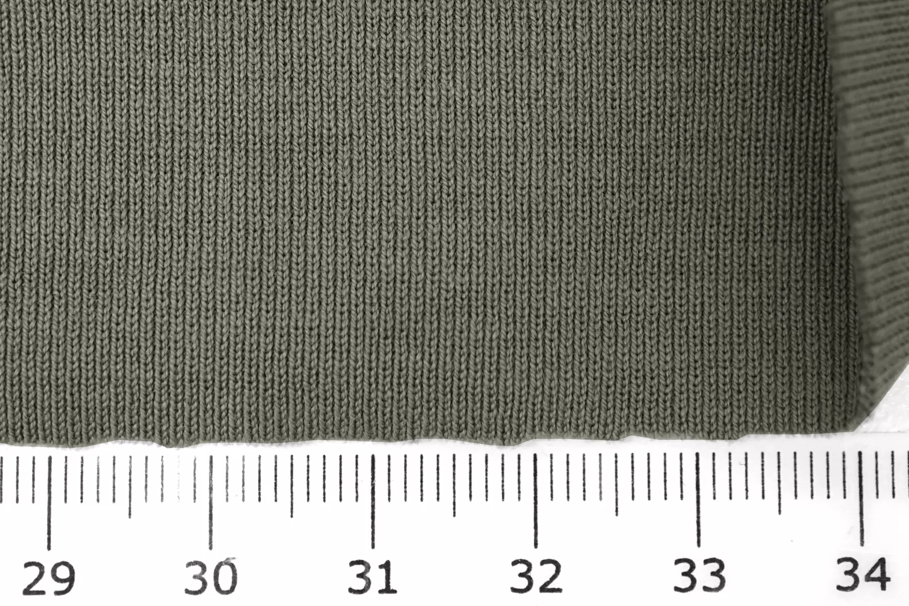 Итальянский хлопковый трикотаж в красивом оттенке зелёного хаки, по вязке ближе к рибане. Материал пластичный, мягкий, гладкий, очень приятный к телу. Плотный, не толстый. Не просвечивает. Практически не мнется. Хорошо тянется. Подойдет для пошива майки, футболки, топа.