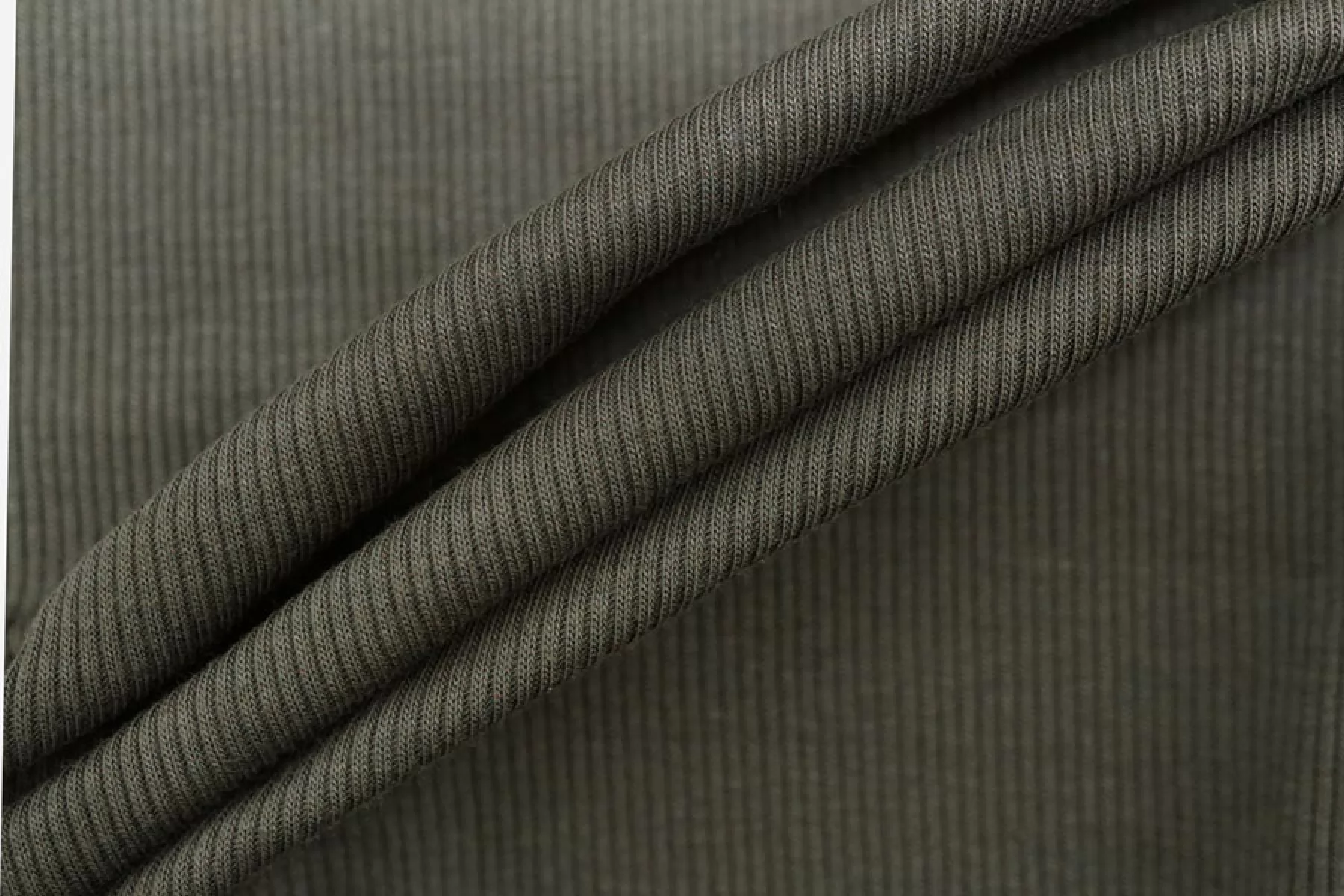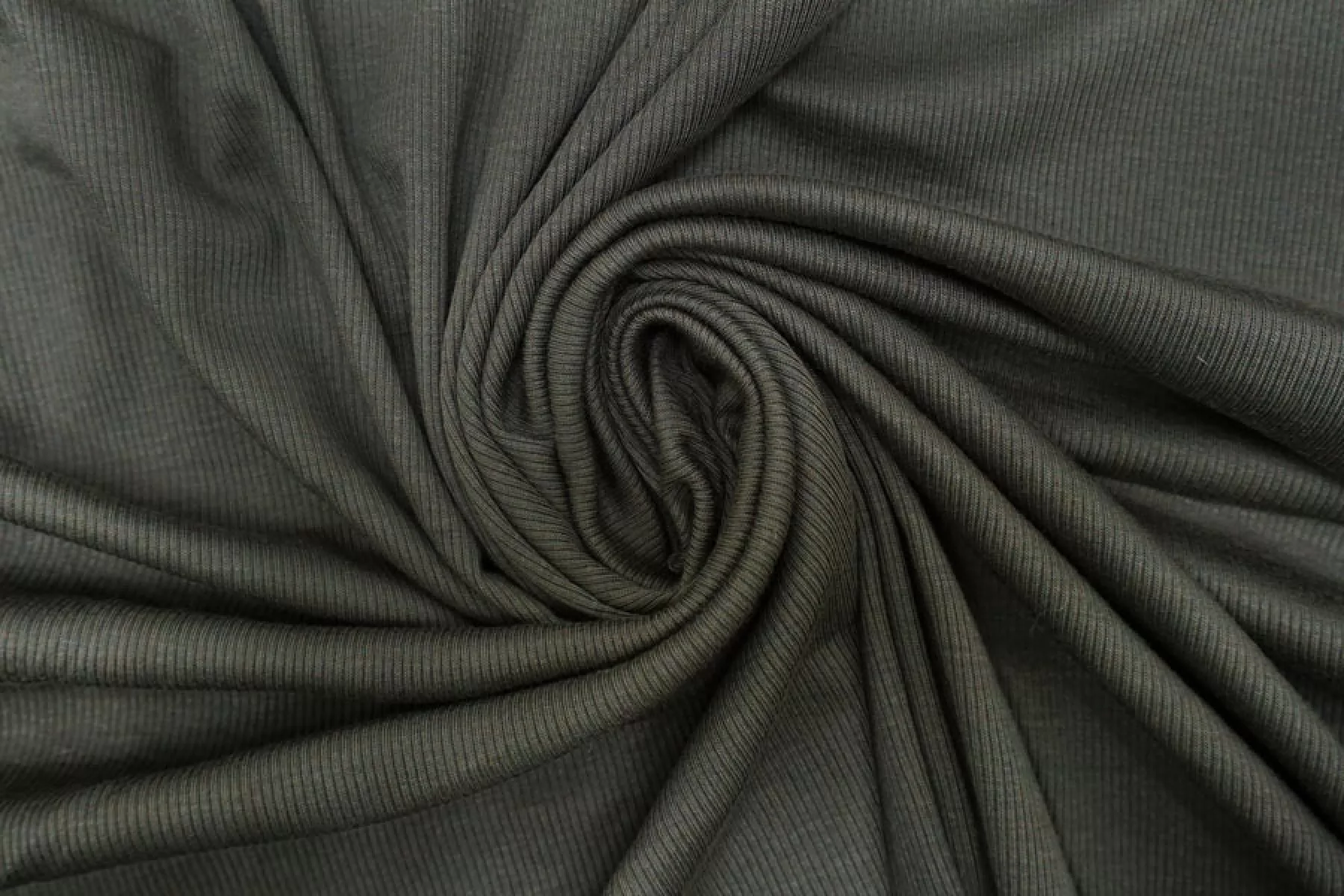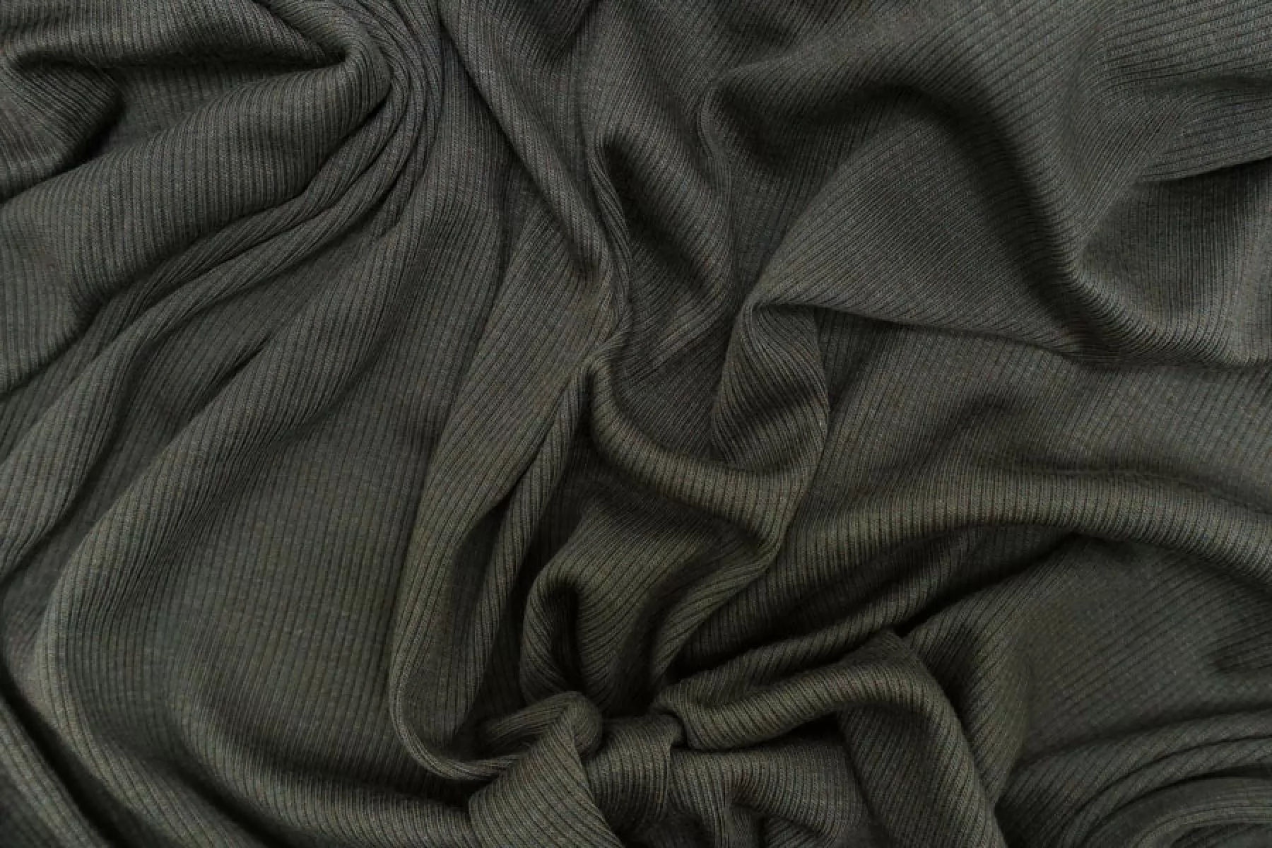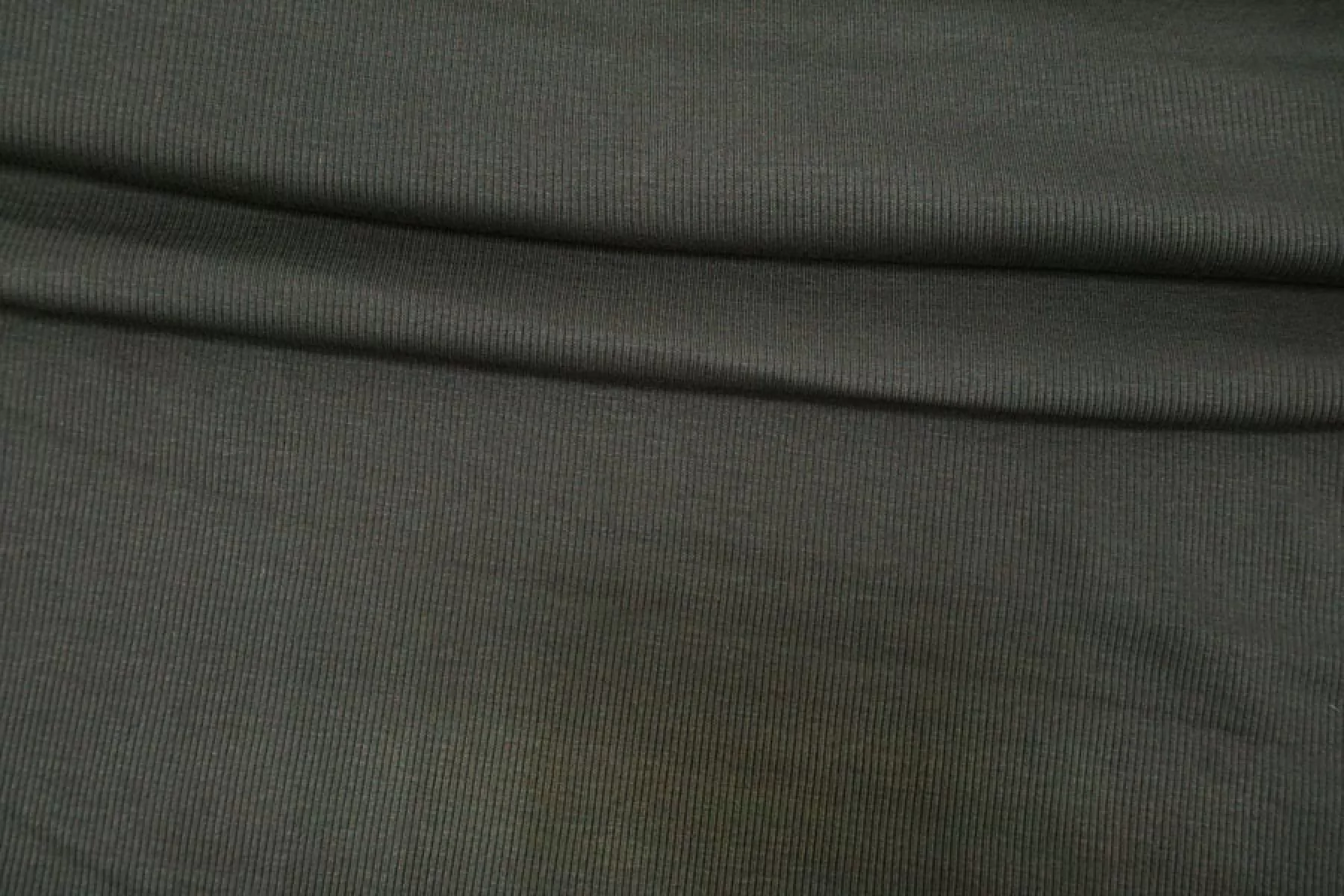 Хлопковый трикотаж в неярком оттенке зелёного хаки, по вязке кашкорсе. Мягкий и приятный, слегка суховатый. Эластичный и пластичный. Тянется за счет плетения. Просвечивает силуэт на просвет. Форму не держит. Сминается, но восстанавливается. Отлично подойдет на майки, топы, водолазки и кофты, свободные платья, а также детские изделия.