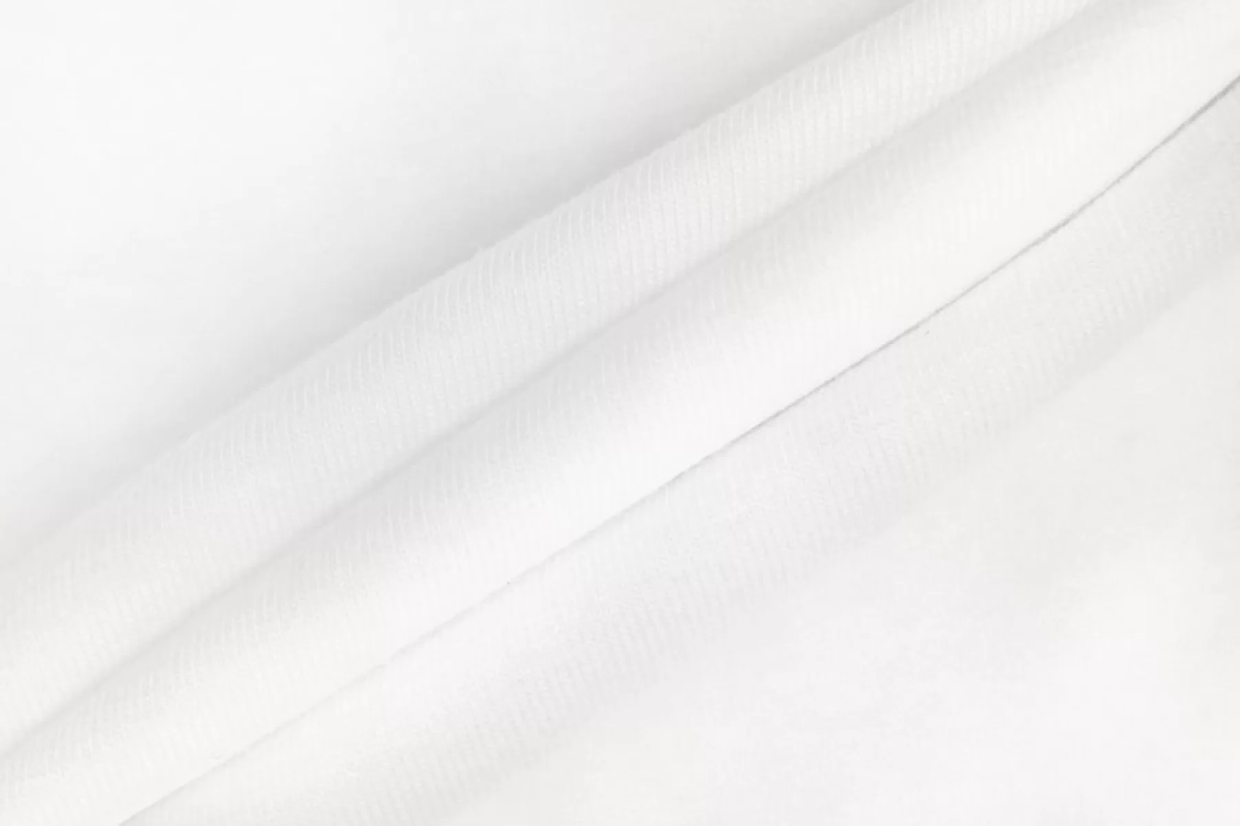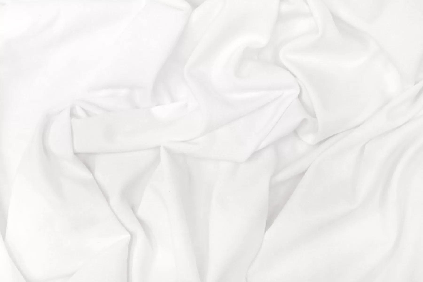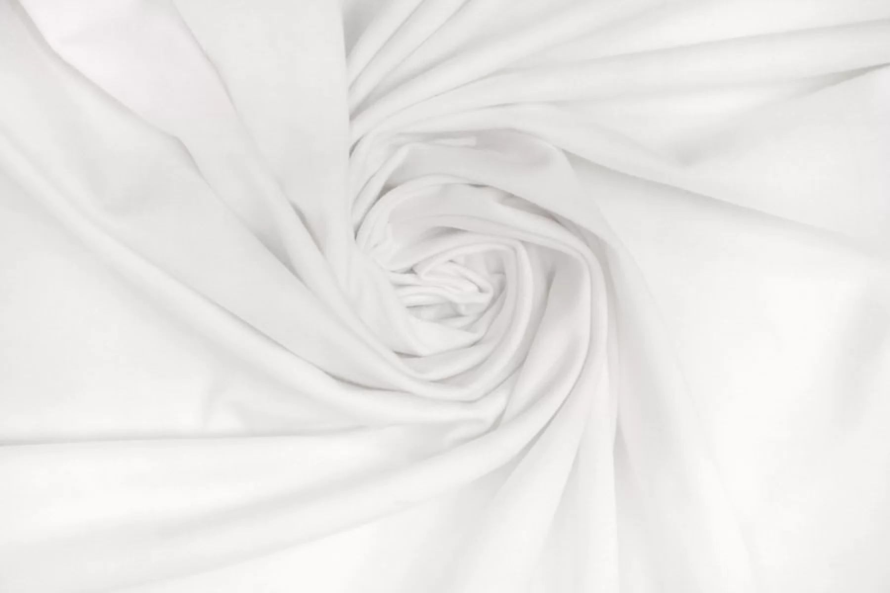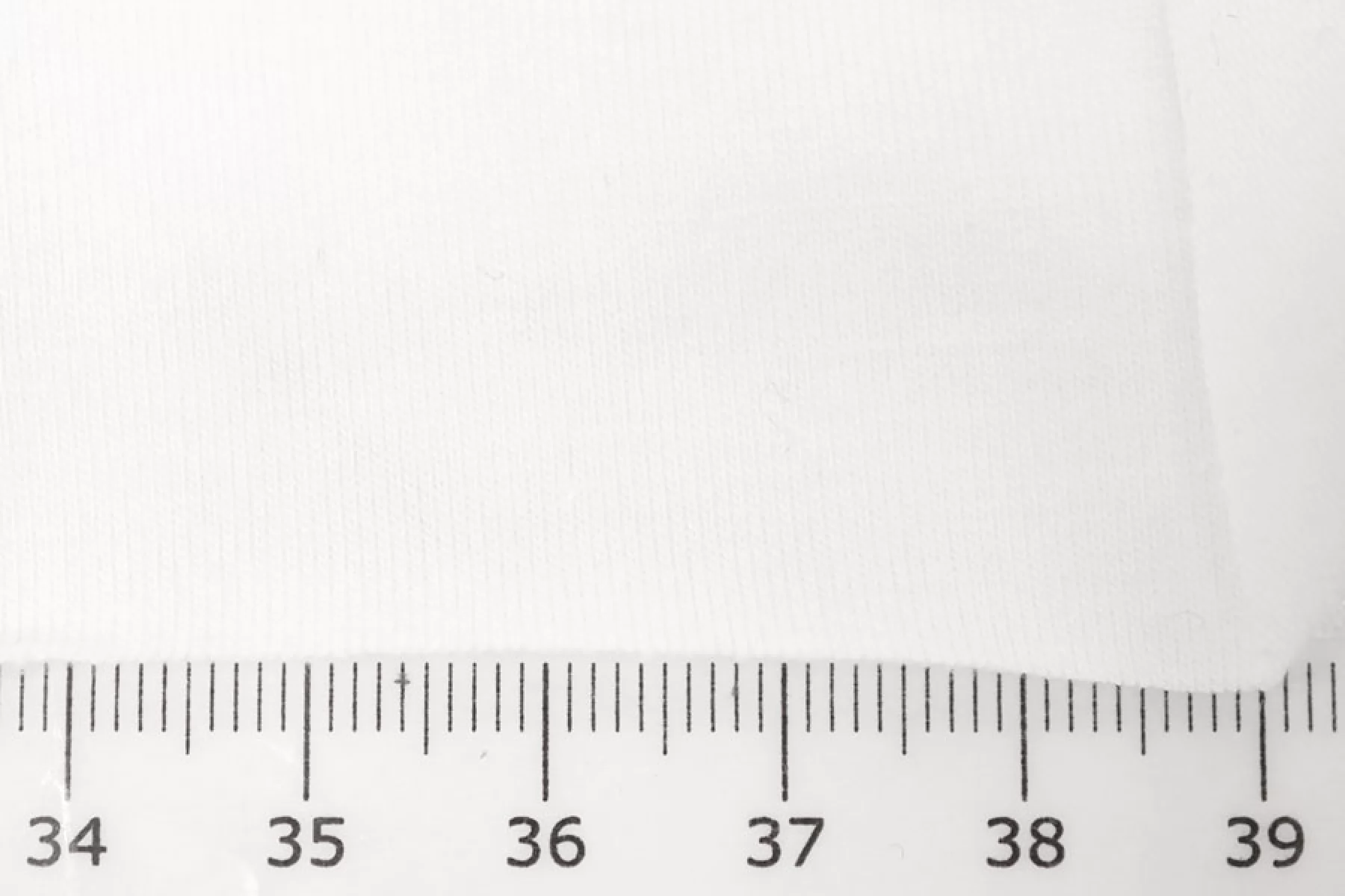 Внимание!! По всему рулону встречаются еле заметные вкрапления нити (темные точки) ! Шикарный хлопковый трикотаж кулирная гладь белого цвета. Тактильно мягкий, пластичный, приятный, достаточно плотный. С легким матовым лоском. Просвечивает силуэт. Не сминается. Хорошо тянется за счет плетения и эластана. Форму держит. Вариант на футболки, майки, туники и не только. Учитывайте возможную усадку.