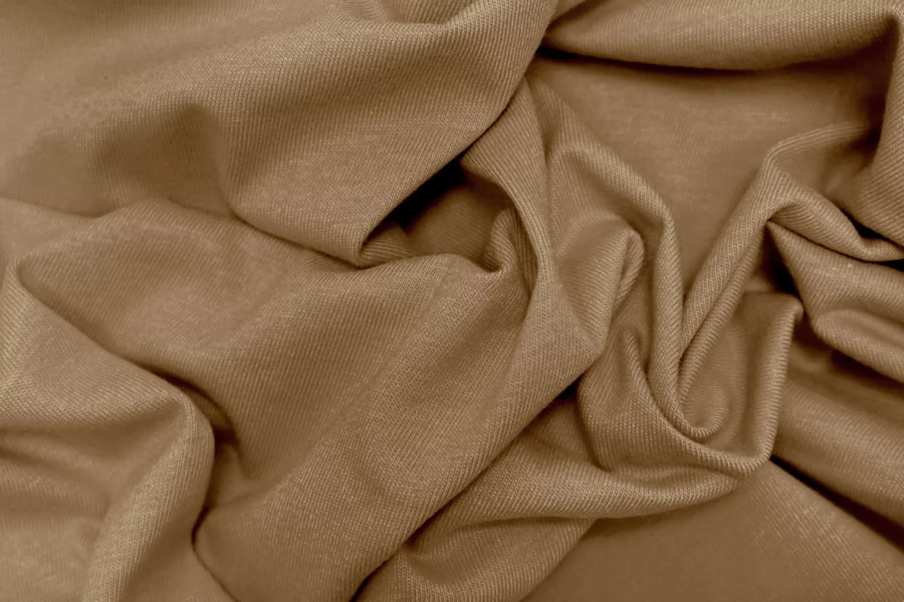 Хлопковый трикотаж, кулирная гладь, в бежево-коричневом цвете (с желтинкой, напоминает кофе с молоком). Тянется за счет плетения, просвечивает средне. Тактильно приятный, мягкий. Пластичный, форму практически не держит. Очень комфортный к телу. Можно использовать для пошива маек, футболок, платьев, туник и другого.