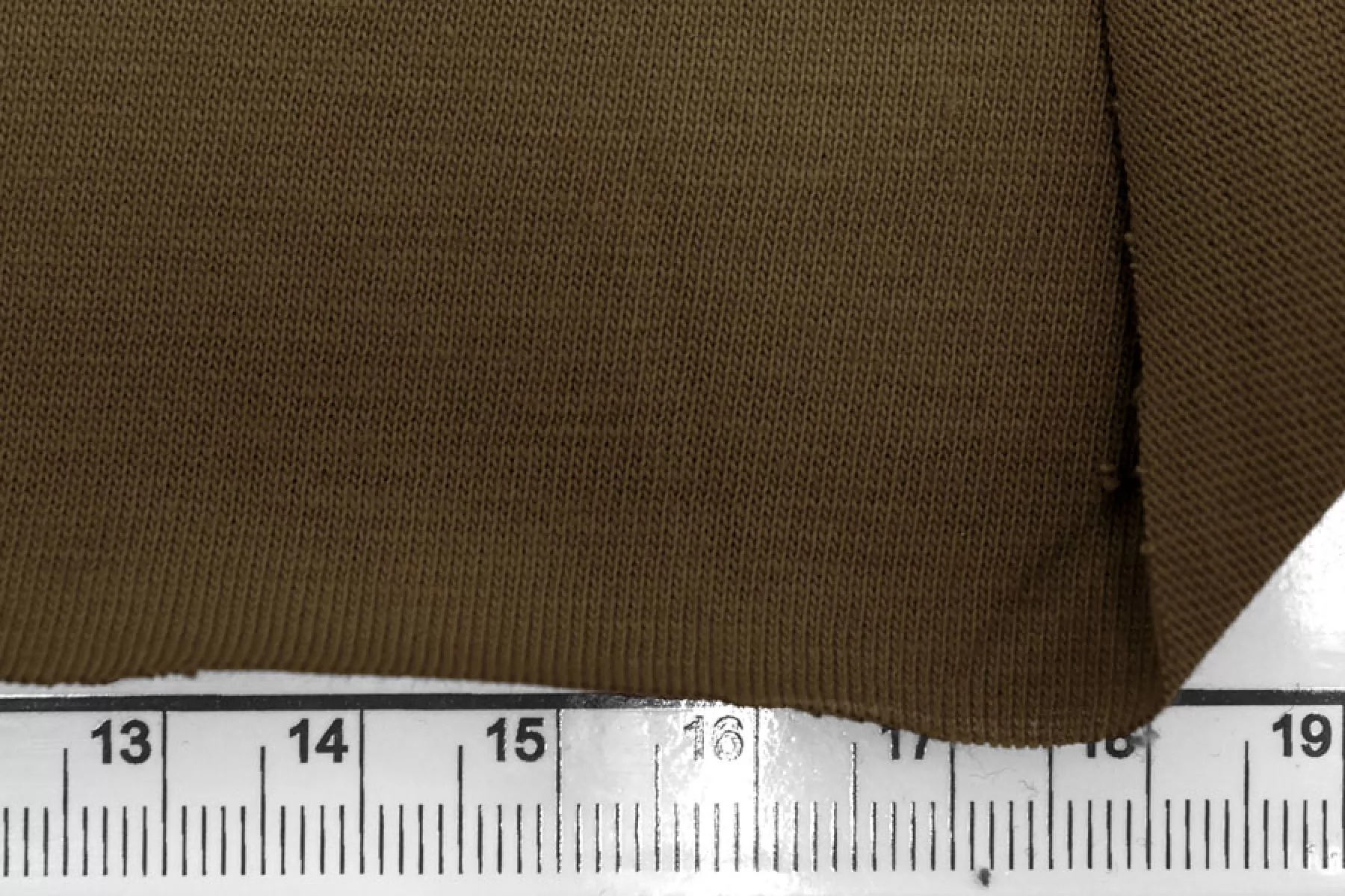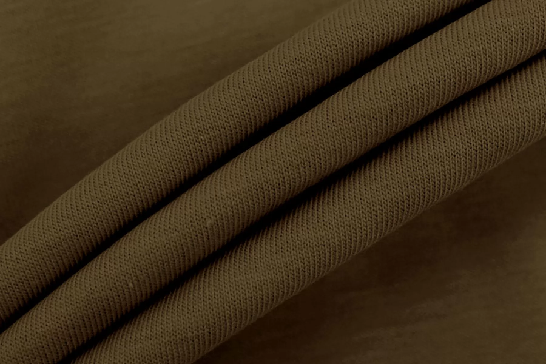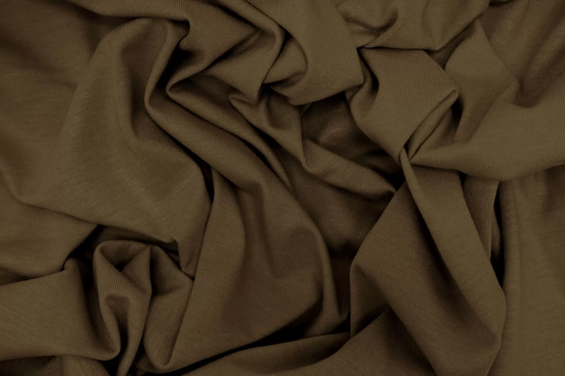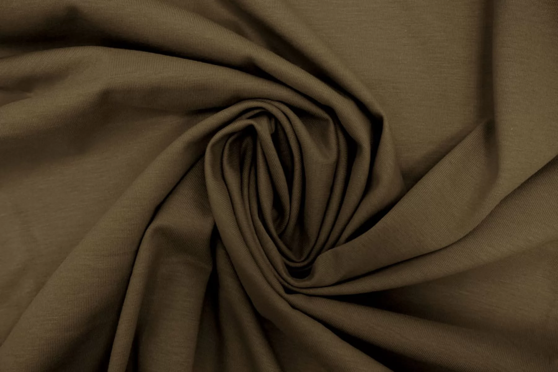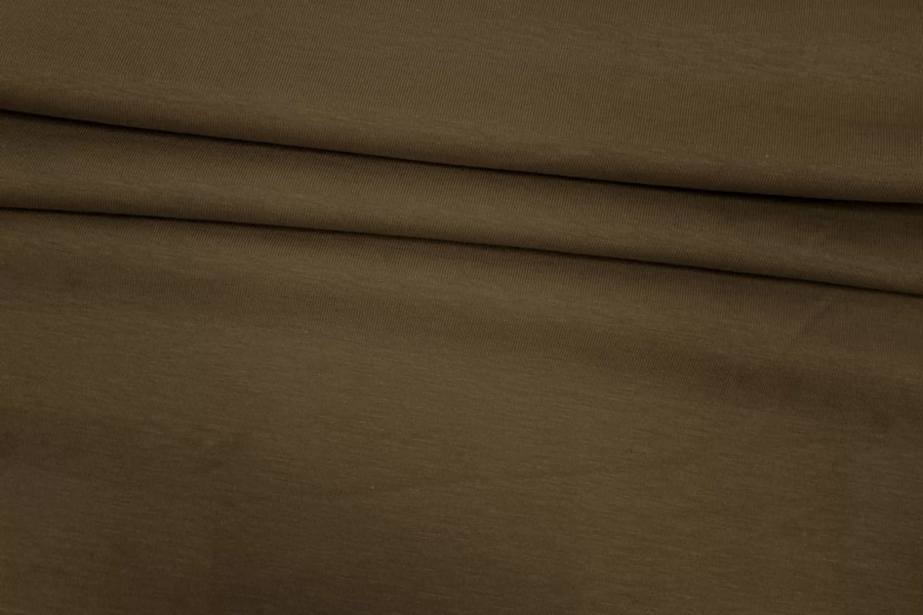 Хлопковый трикотаж, кулирная гладь, в болотном оттенке (зеленовато-коричневый). Хорошо тянется за счет плетения, просвечивает средне. Тактильно очень приятный, гладкий. Пластичный, форму держит совсем немного. Очень комфортный к телу. Можно использовать для пошива маек, футболок, платьев, туник и другого.
