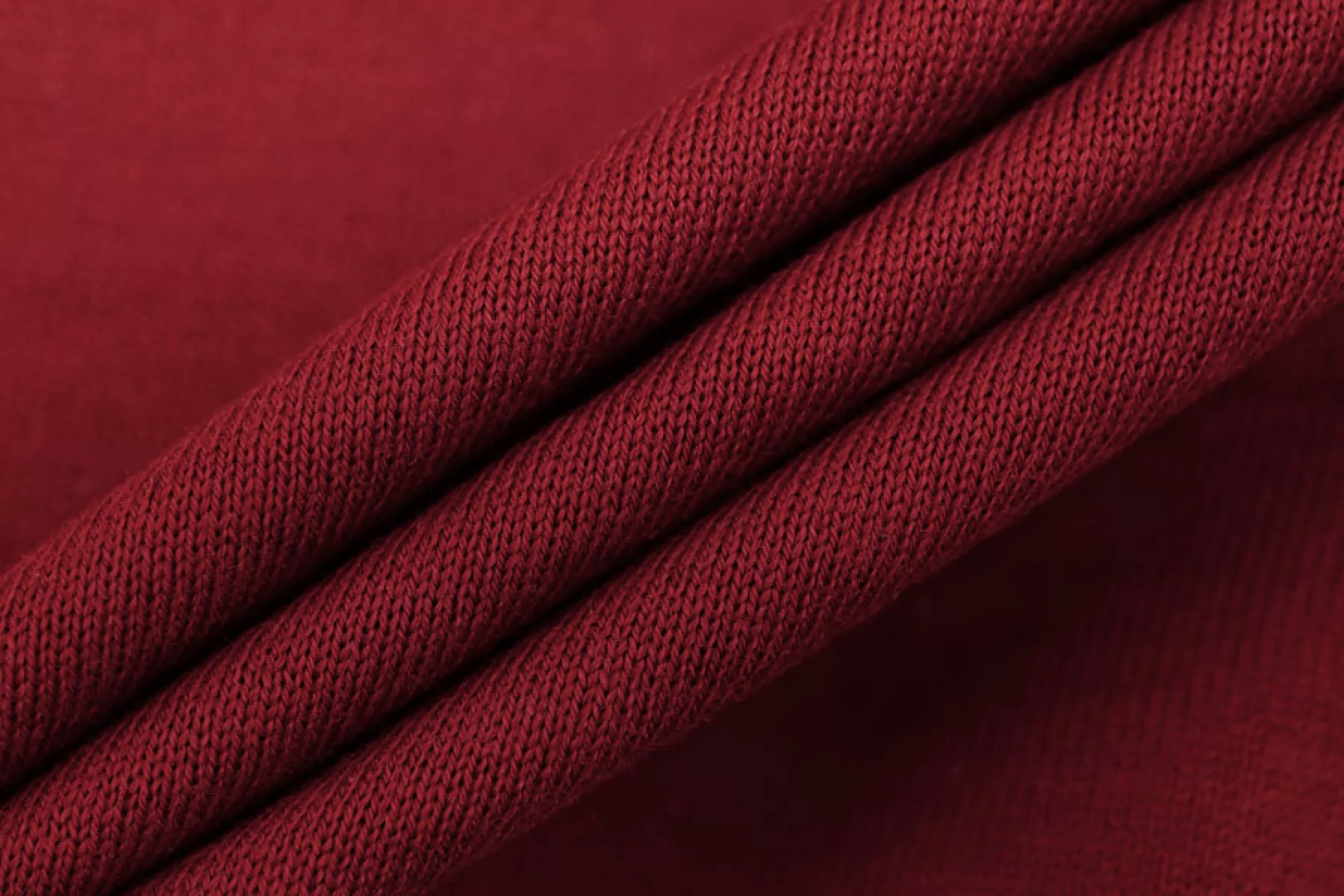 Хлопковый трикотаж, кулирная гладь с небольшой добавкой вискозы, в бордовом оттенке. Тянется за счет плетения, просвечивает средне. Плетение немного разреженное. Тактильно приятный, мягкий. Пластичный, форму практически не держит. Очень комфортный к телу. Можно использовать для пошива маек, футболок, платьев, туник и другого.