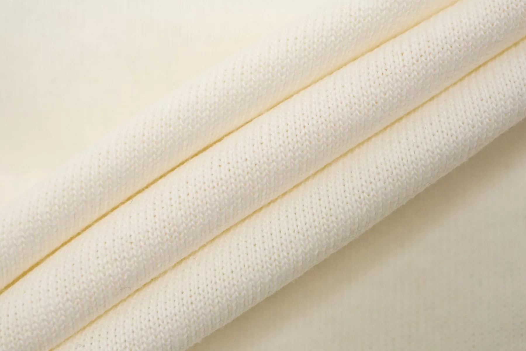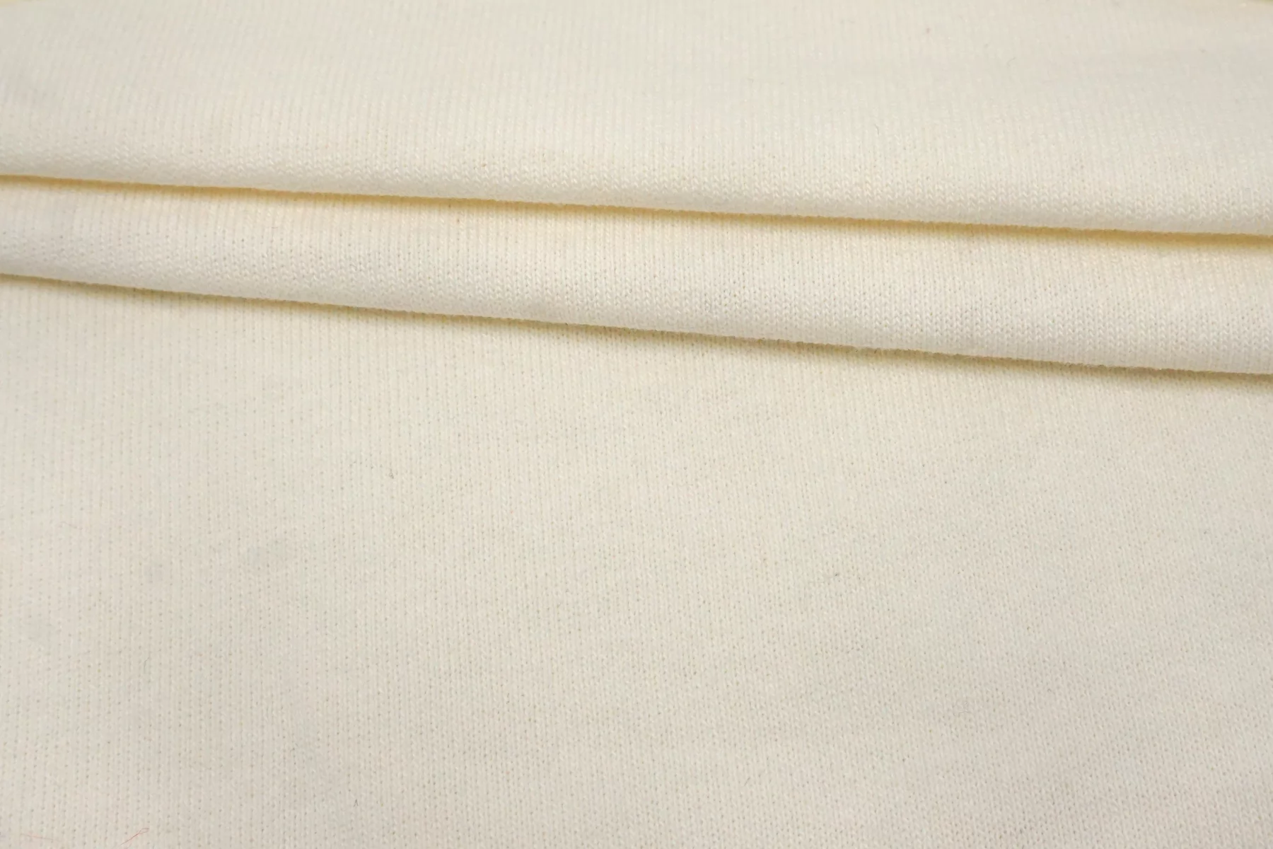 Хлопковый трикотаж кулирная гладь от Bottega Veneta в молочном оттенке. Материал тонкий, но плотный, немного держит форму. Минимально просвечивает в дырочки плетения. Тянется слабо. Шьем плотные футболки, спортивные летние штаны, подойдет и для домашней одежды.