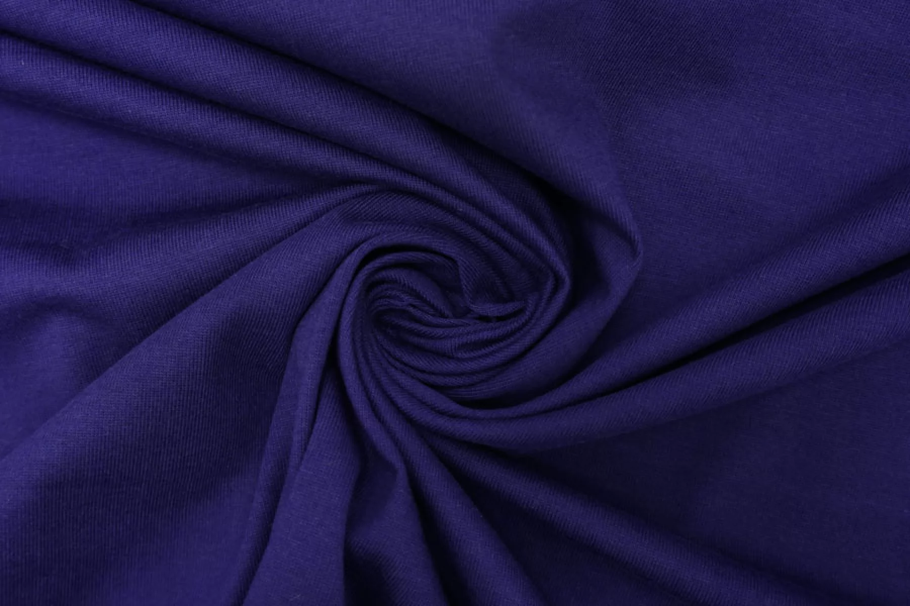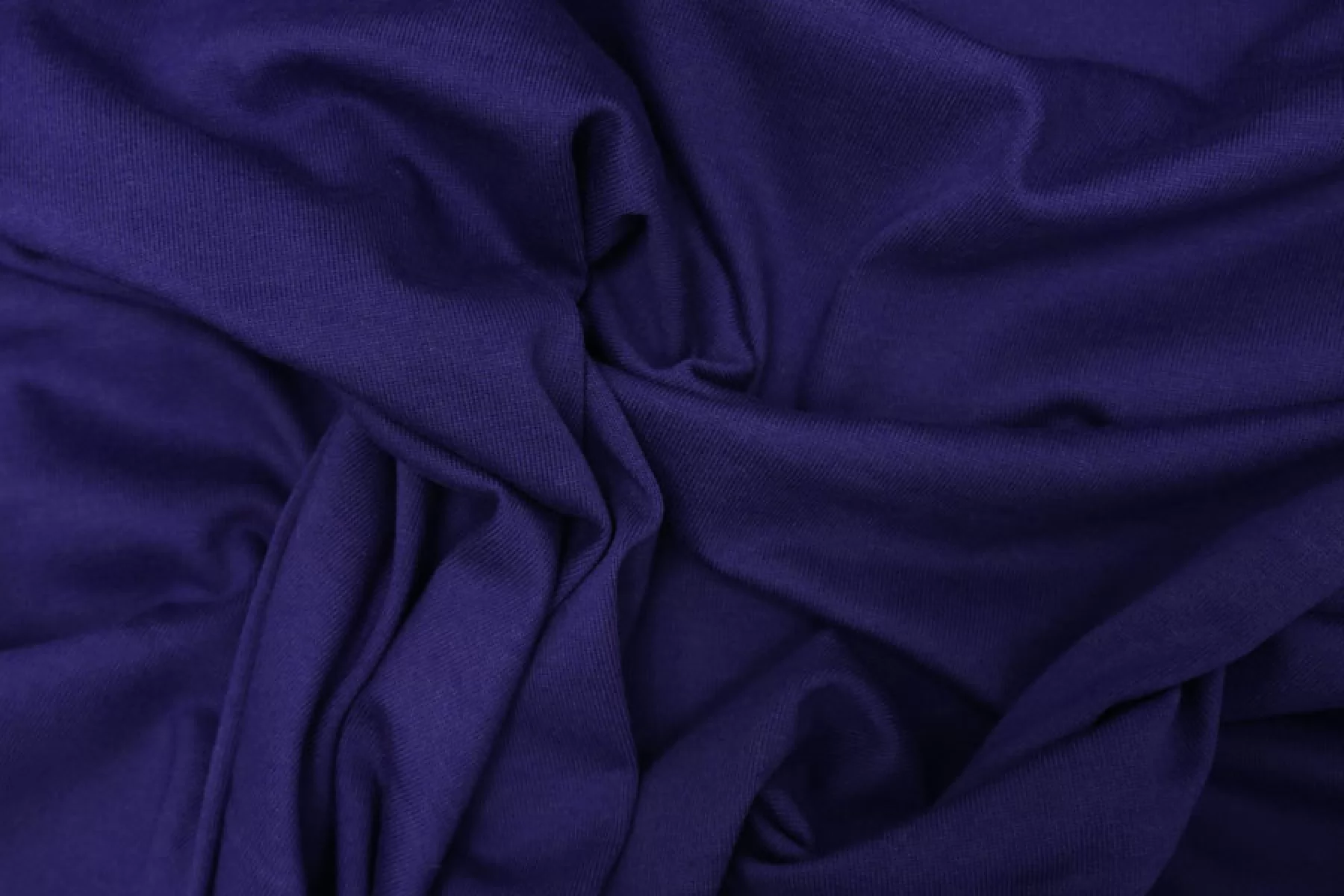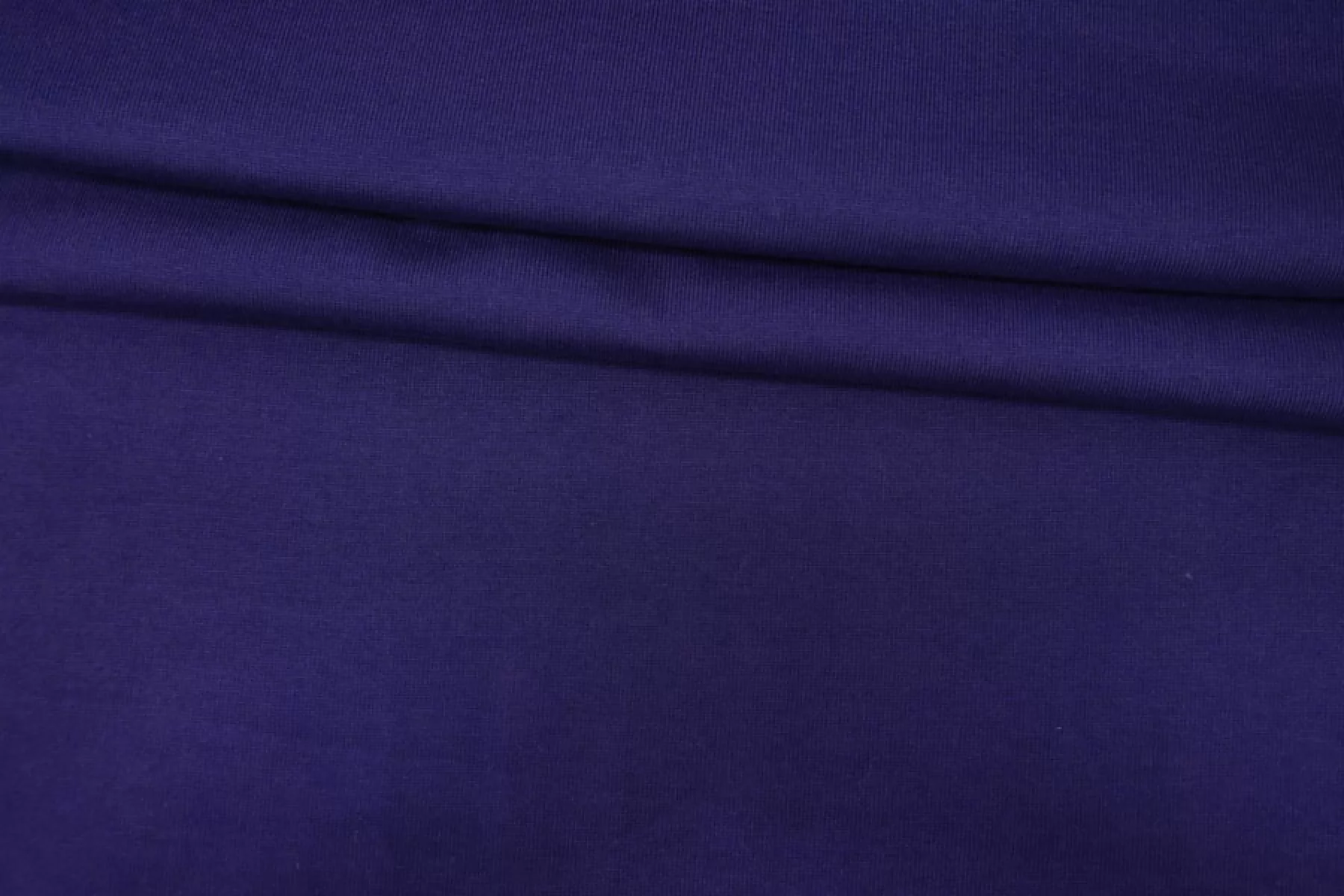 Хлопковый трикотаж - кулирная гладь, насыщенного фиолетового цвета. Хорошо тянется за счет плетения, слегка просвечивает. Тактильно очень приятный, гладкий. Держит форму. Можно использовать для пошива маек, лонгсливов, футболок, платьев, туник и другого.