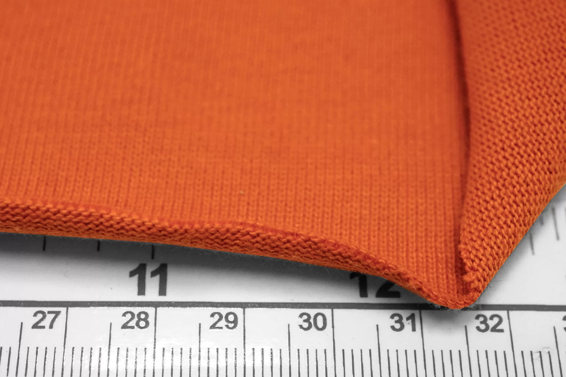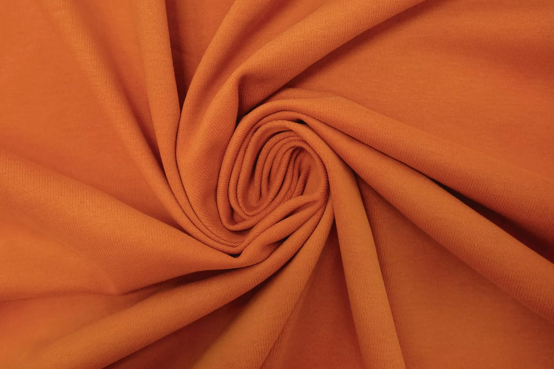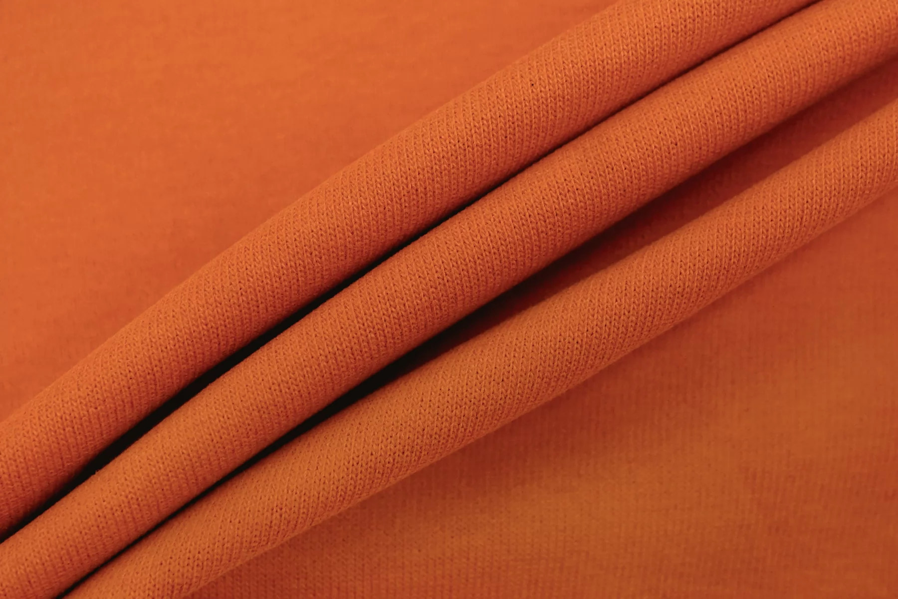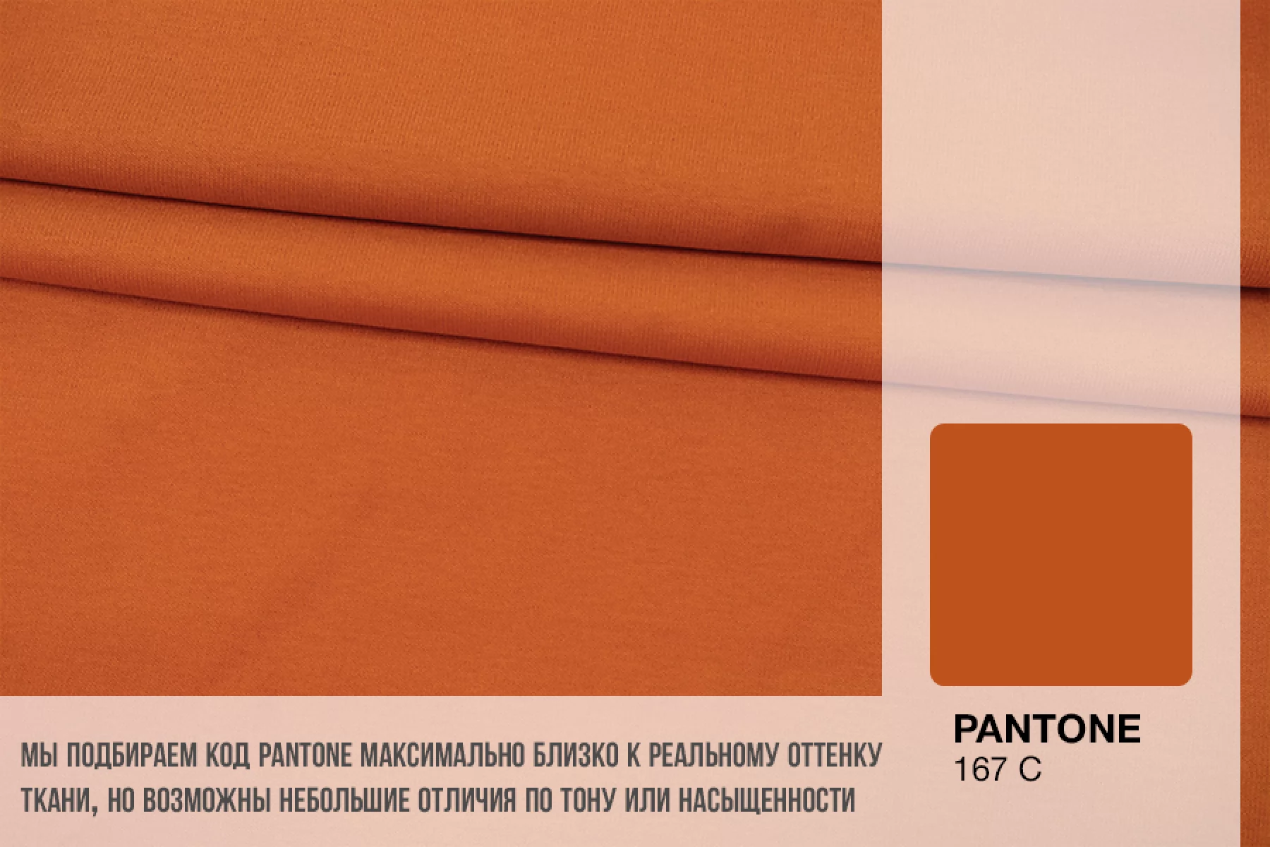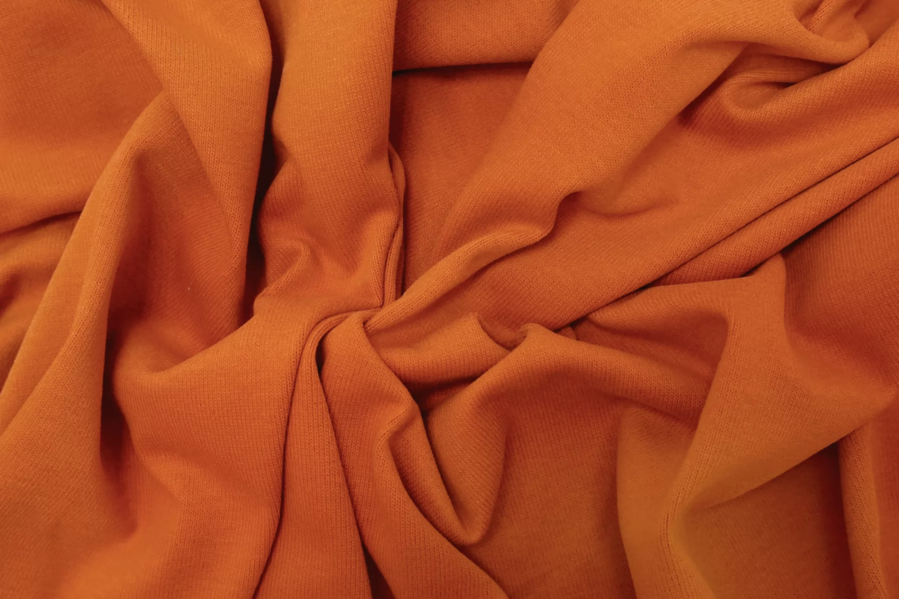Хлопковый трикотаж в красивом оранжевом оттенке. Тактильно приятный, мягкий, будто велюровый. Материал умеренной плотности, немного держит форму. Не просвечивает. Тянется слабо. Шьем плотные футболки, лонги, спортивные летние штаны, подойдет и для домашней одежды.