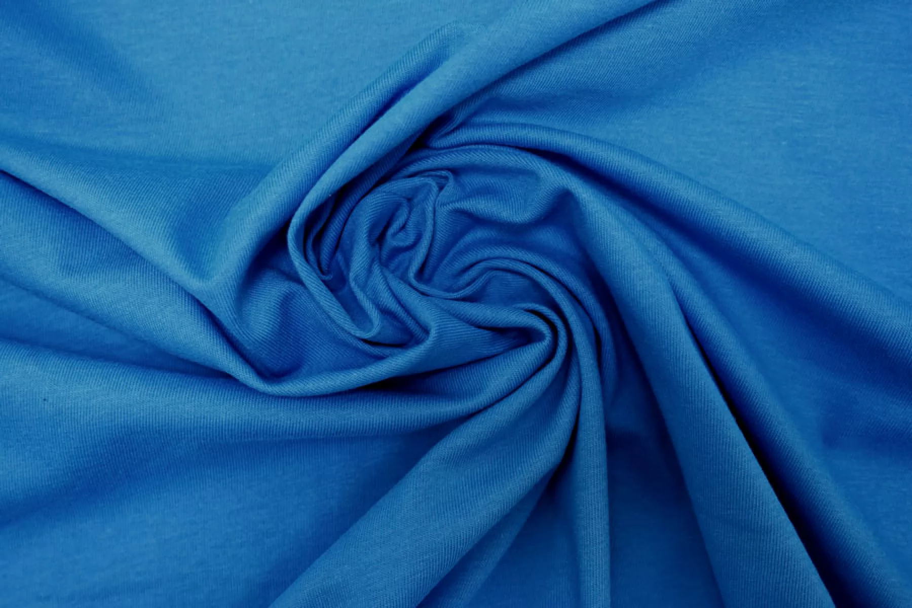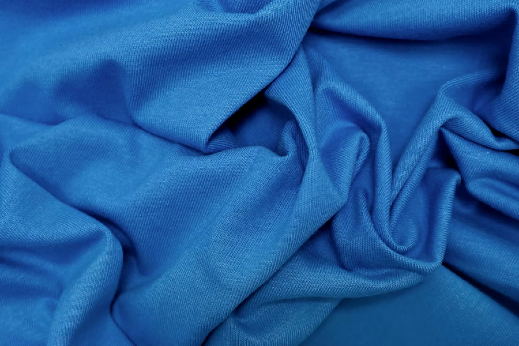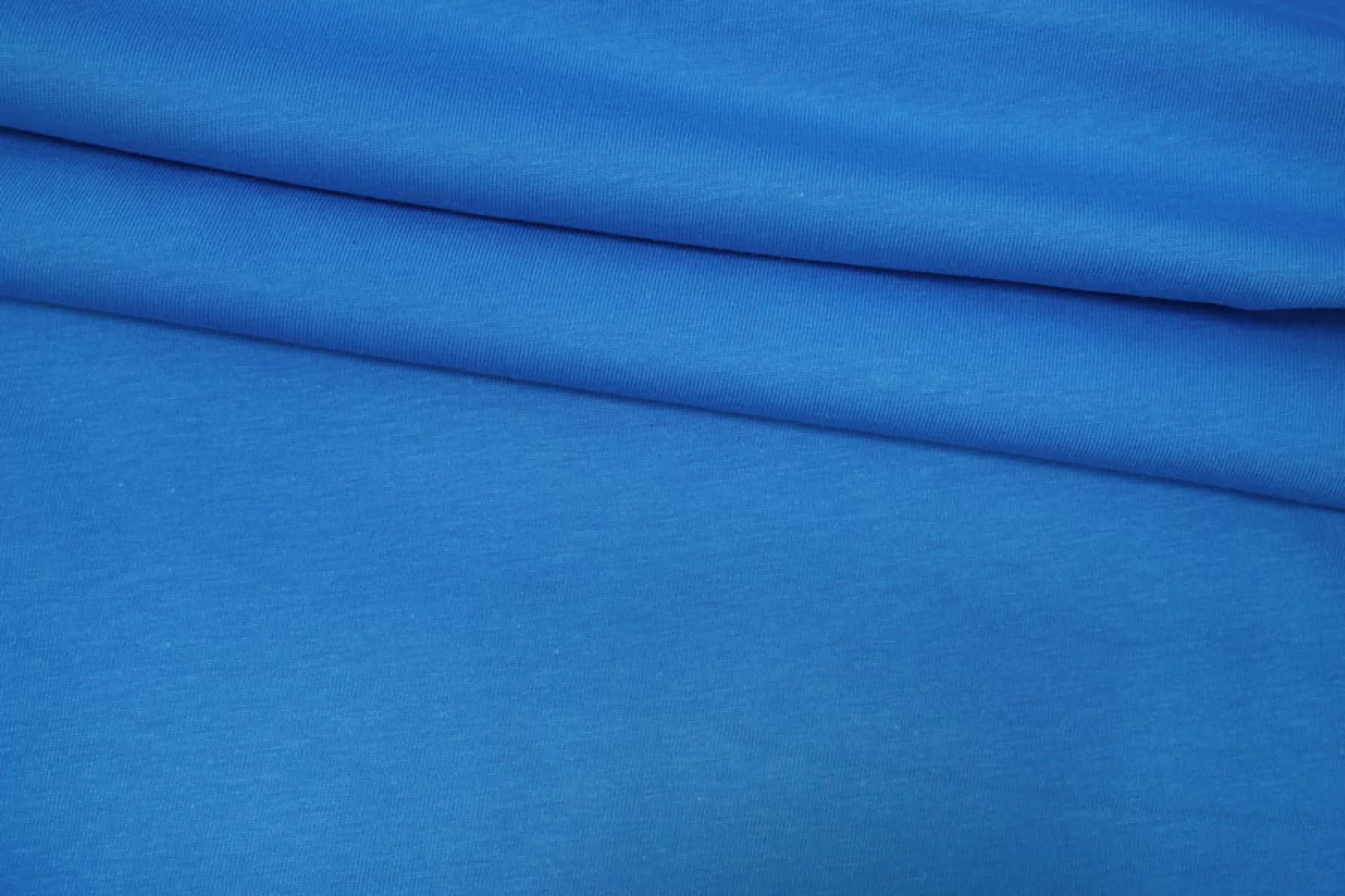 Хлопковый трикотаж, кулирная гладь, в насыщенном, сине-голубом цвете. Тянется, просвечивает немного. Тактильно очень приятный, гладкий. Пластичный, форму практически не держит. Очень комфортный к телу. Можно использовать для пошива маек, футболок, платьев, туник и другого.