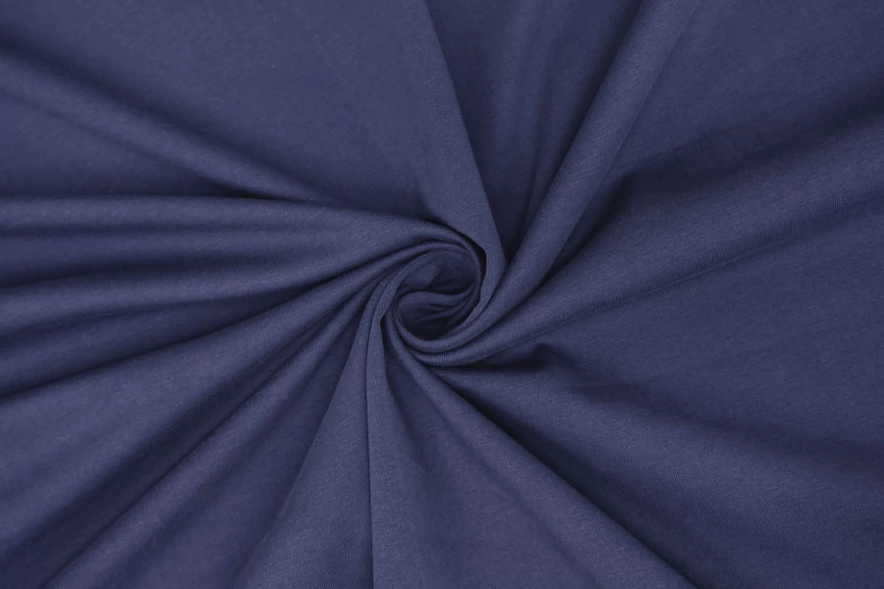 Хлопковый плотный трикотаж, кулирная гладь, синего цвета. Материал тактильно приятный и мягкий. Немного тянется за счет плетения. Не просвечивает. Отлично драпируется и хорошо держит форму. Шьем майки, футболки, платья и не только.