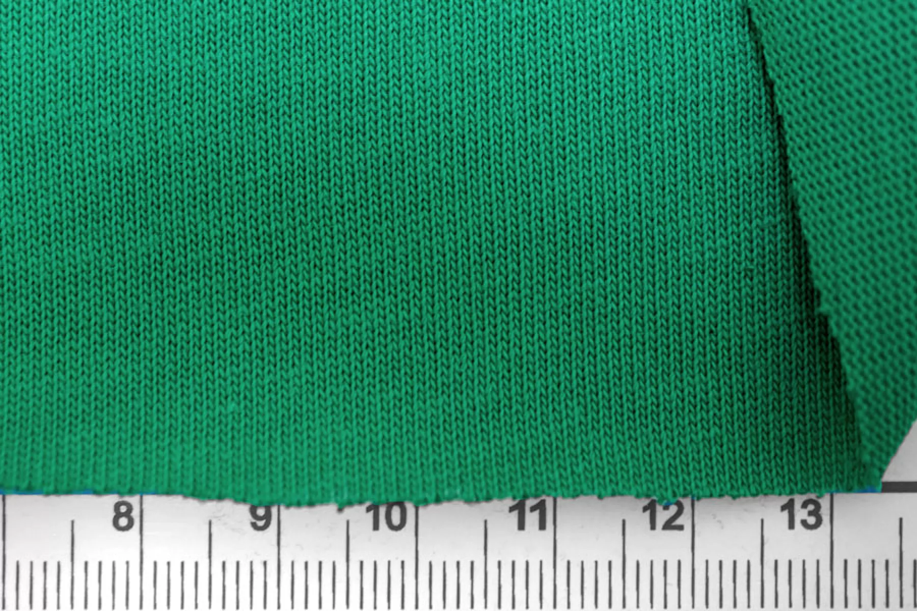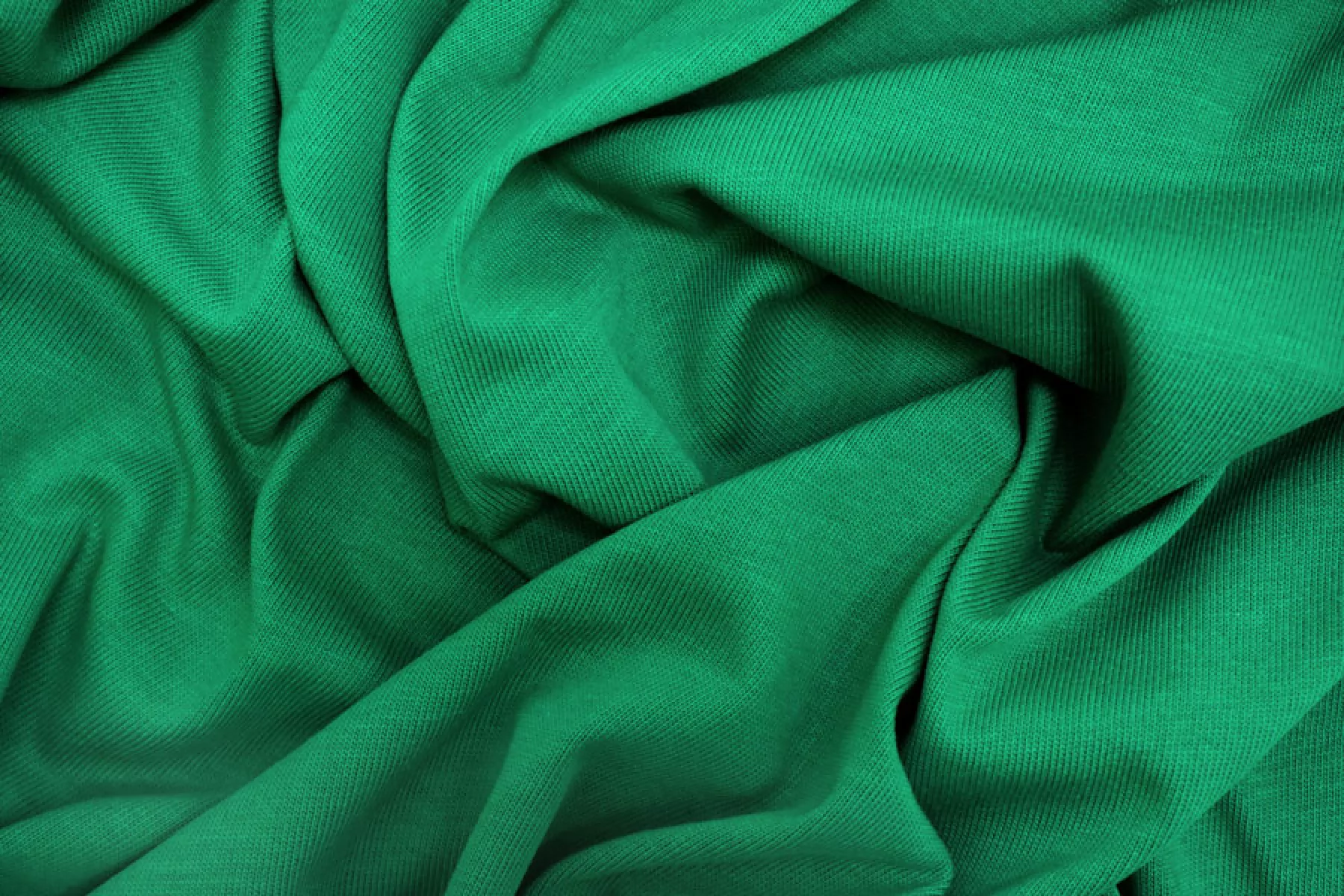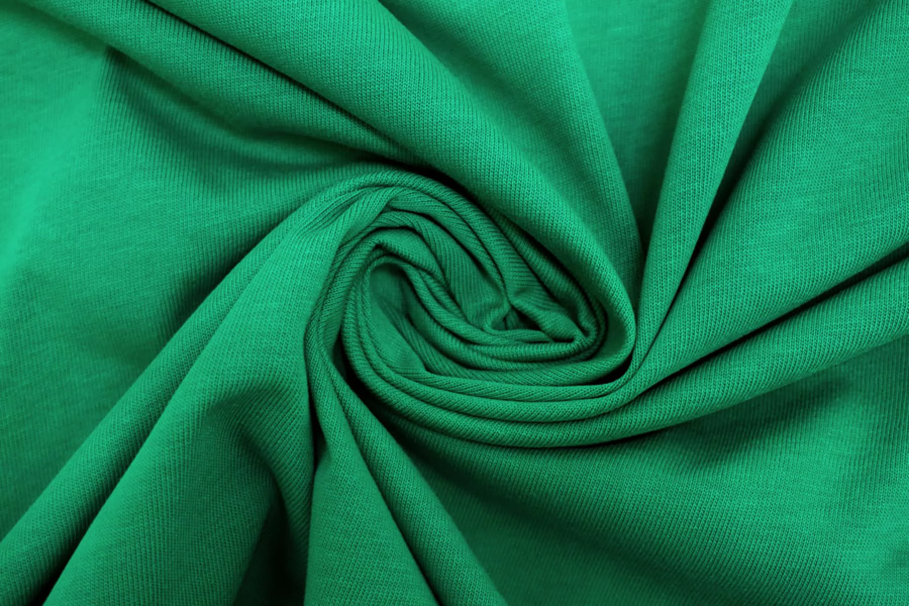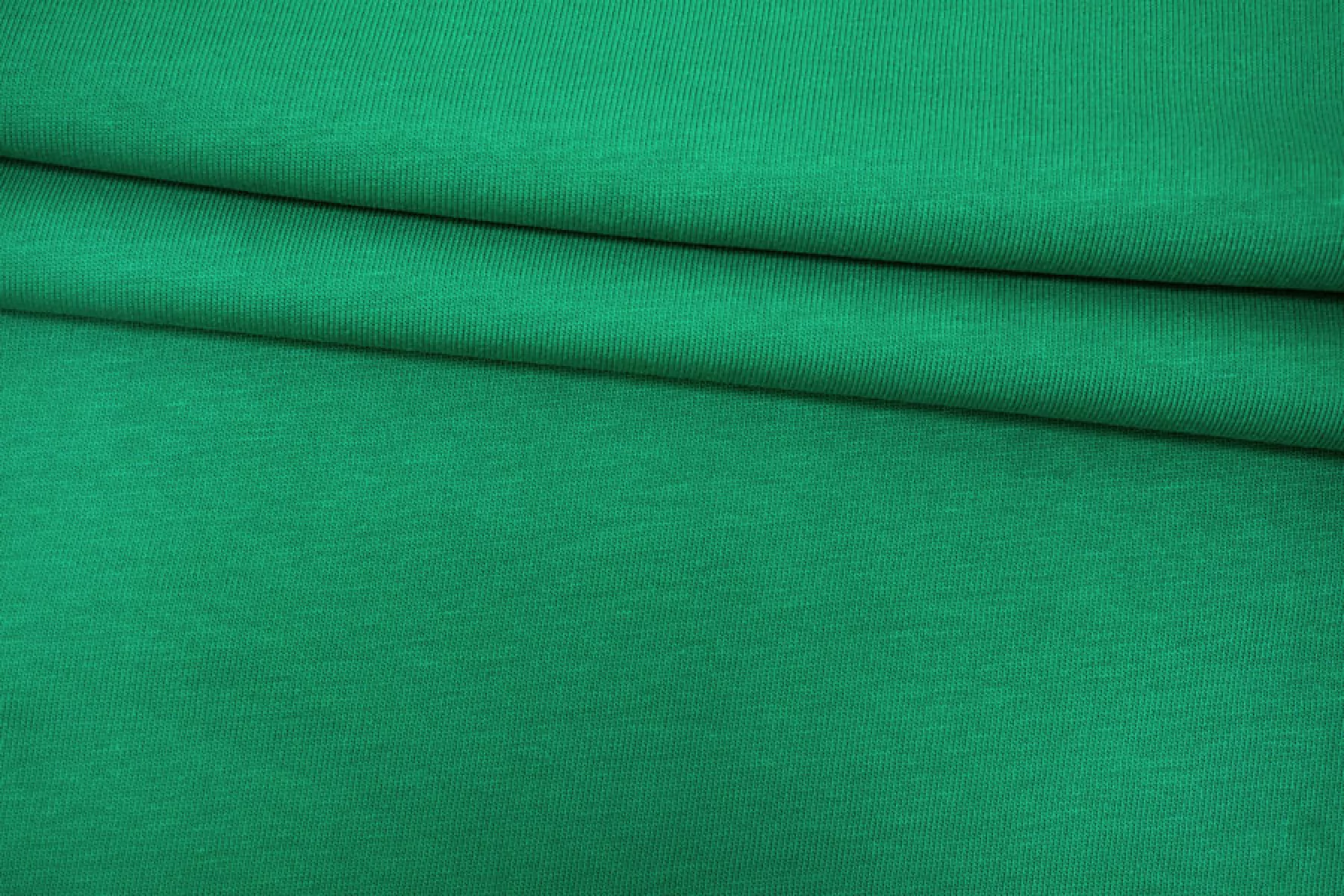 Хлопковый трикотаж, кулирная гладь в красивом светлом изумрудно-зелёном цвете. Тянется за счет плетения, просвечивает слабо. Тактильно слегка суховат. Пластичный, форму немного держит. Можно использовать для пошива маек, футболок, платьев, туник и другого.