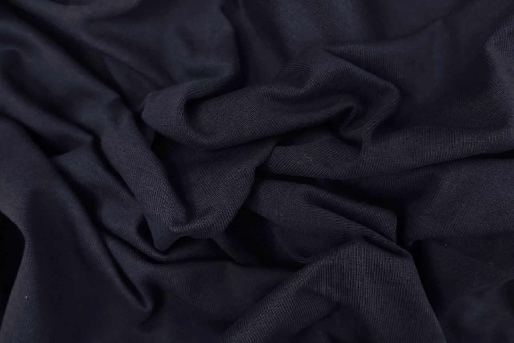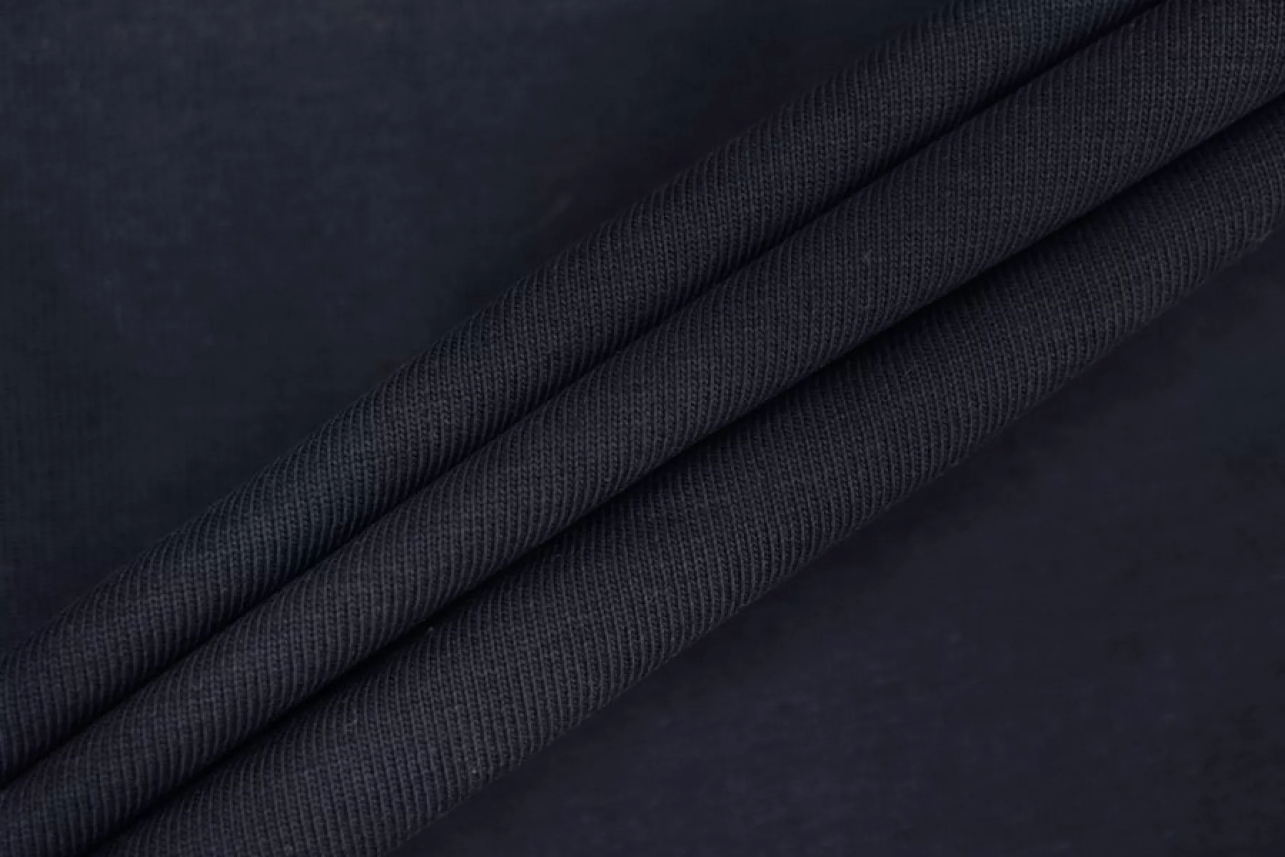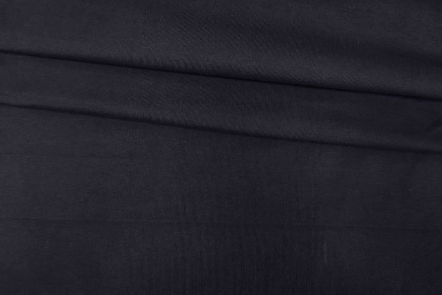 Хлопковый трикотаж кулирная гладь в темно-синем цвете. Материал тонкий, но довольно плотный, держит форму. Не просвечивает. Тянется слабо. Шьем плотные футболки, спортивные летние штаны, подойдет и для домашней одежды.