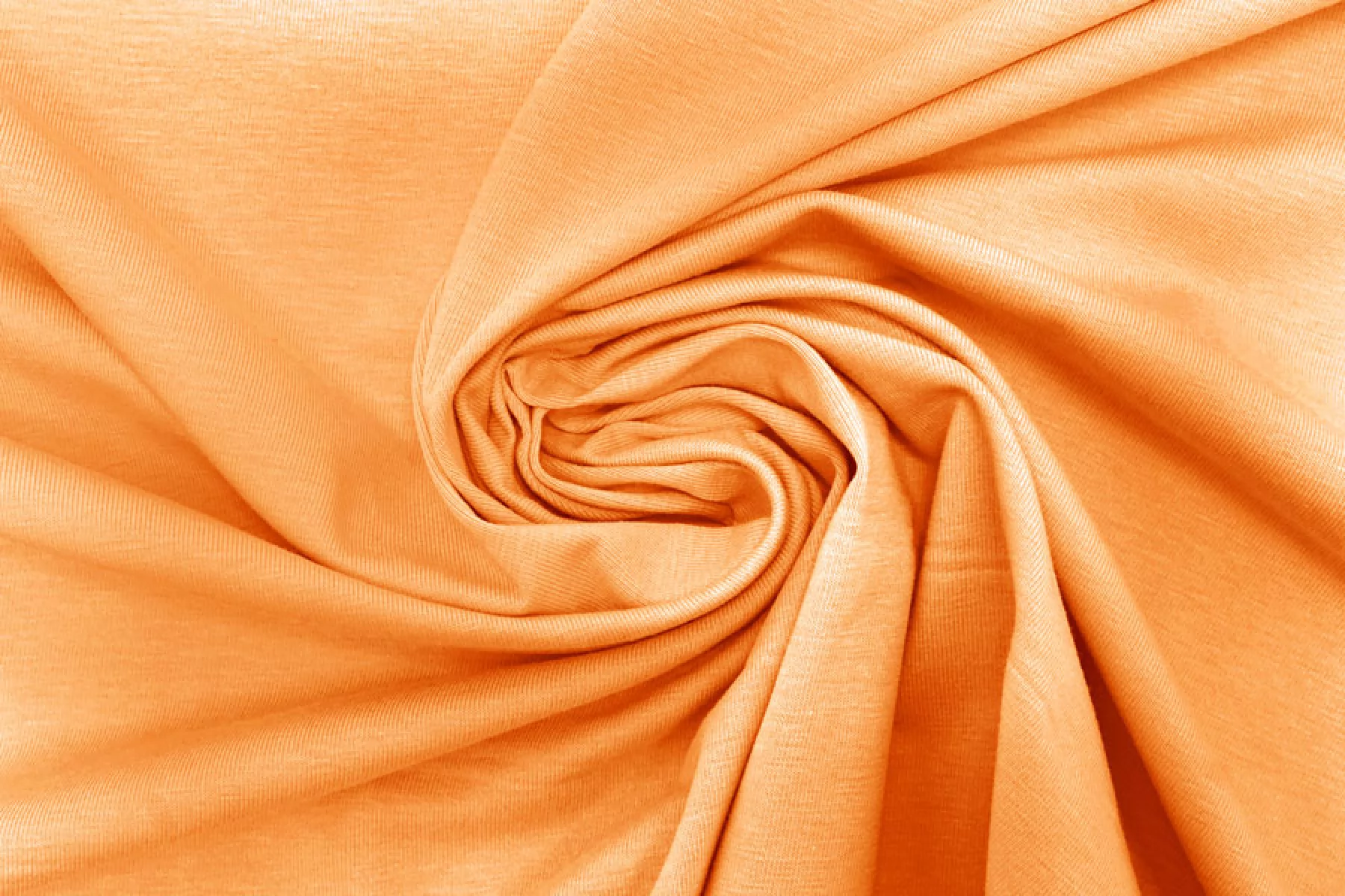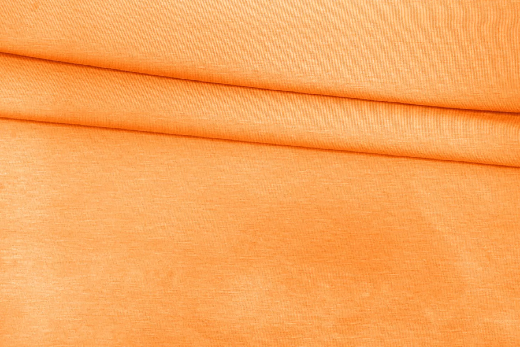 Хлопковый трикотаж - кулирная гладь, в приятном, разбелённо-оранжевом цвете. Эластичный, тонкий, просвечивает. Тактильно очень приятный, гладкий. Форму не держит, очень пластичный. Можно использовать для пошива маек, лонгсливов, футболок, платьев, туник и другого.