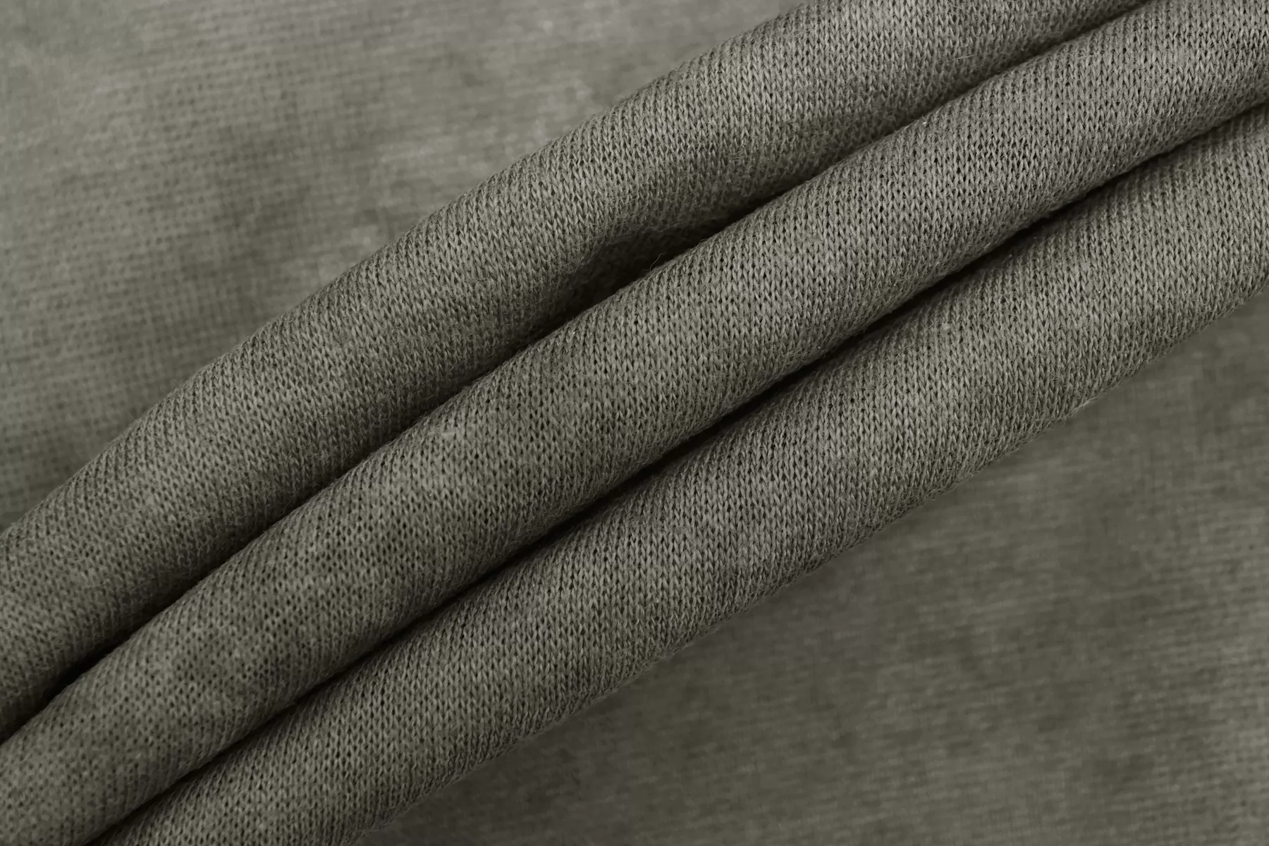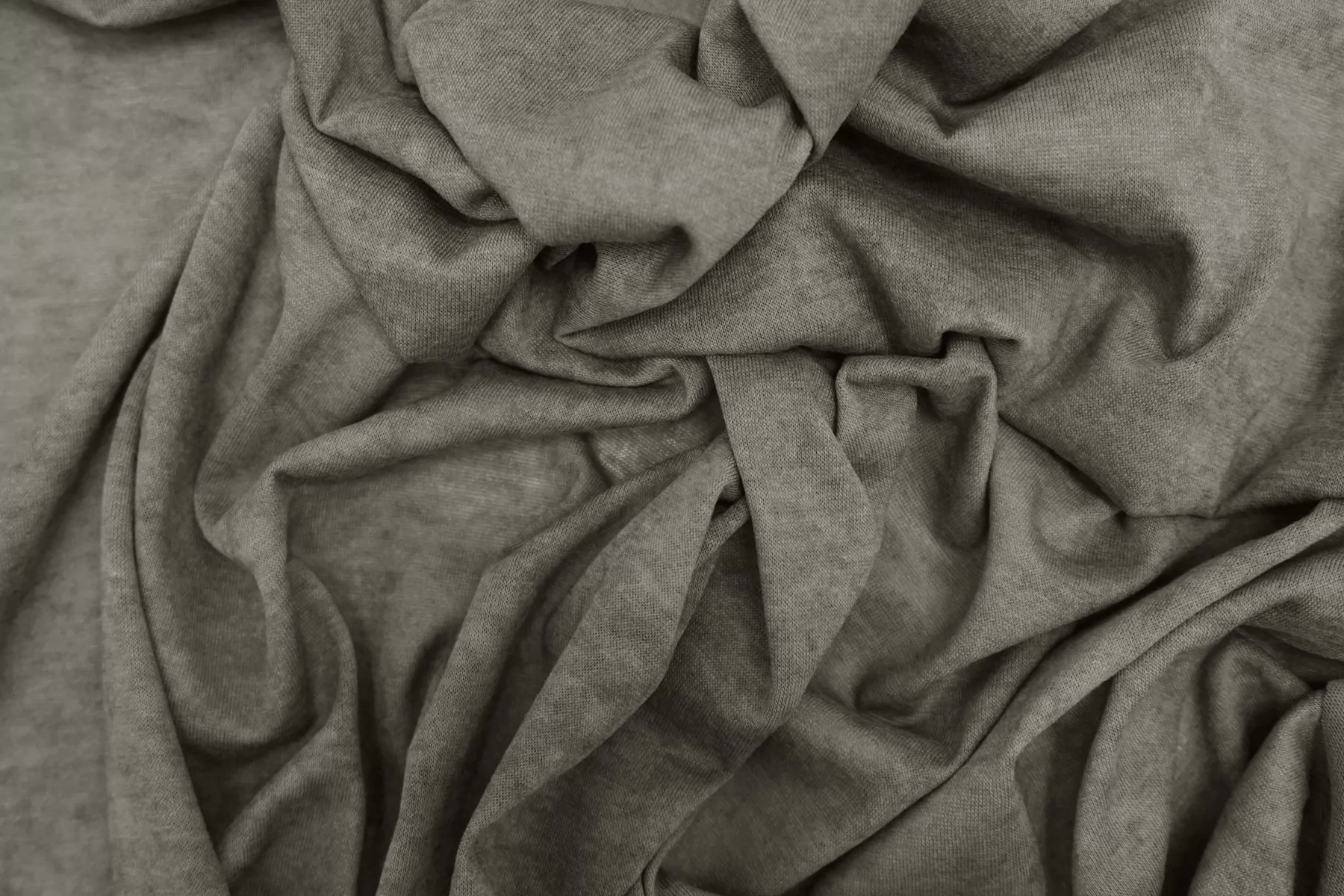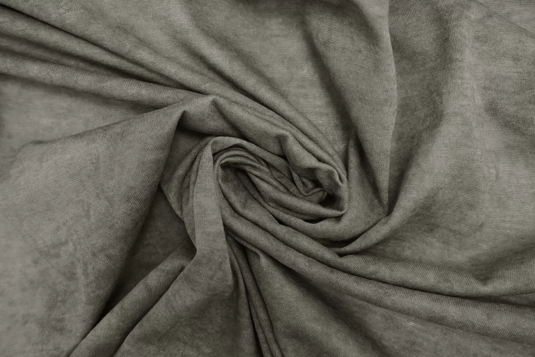 Хлопковый трикотаж - кулирная гладь, с принтом тай-дай, оттенок серый хаки. Тянется, тонкий, просвечивает. Тактильно очень приятный, гладкий. Форму не держит, очень пластичный. Можно использовать для пошива маек, лонгсливов, футболок, платьев, туник и другого.