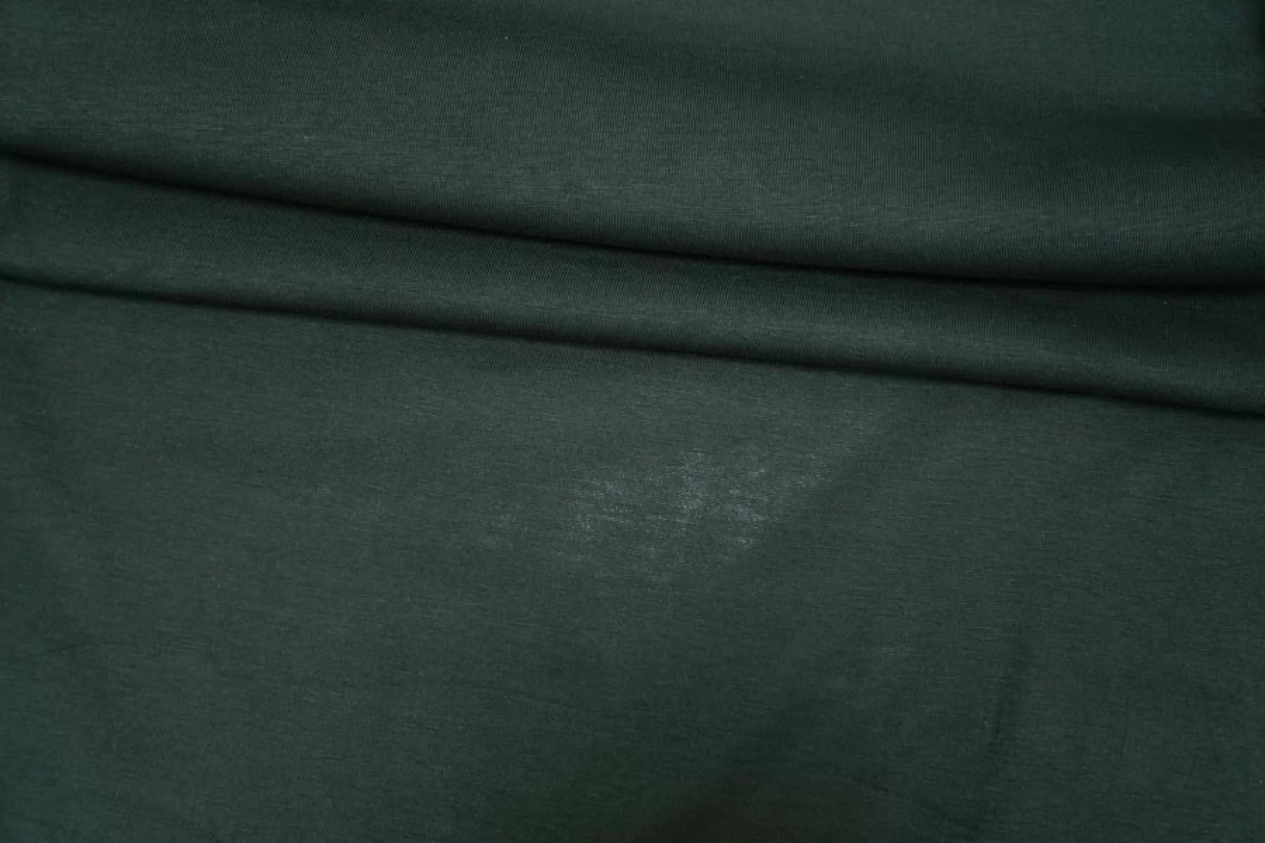 Хлопковый трикотаж, кулирная гладь, в тёмном, ненасыщенном зелёном цвете. Довольно тонкий. Тянется за счет плетения, просвечивает. Тактильно очень приятный, гладкий. Пластичный, форму не держит. Очень комфортный к телу. Можно использовать для пошива маек, футболок, платьев, туник и другого.