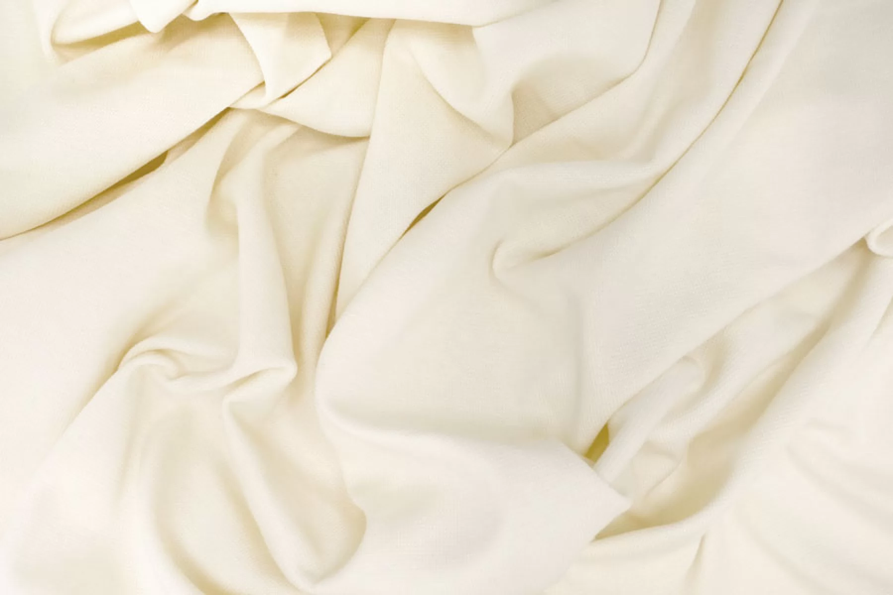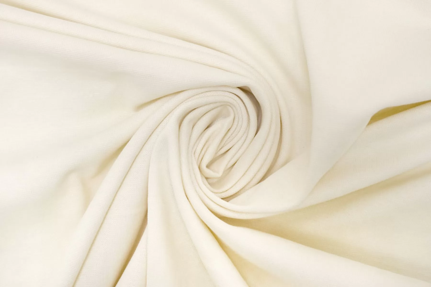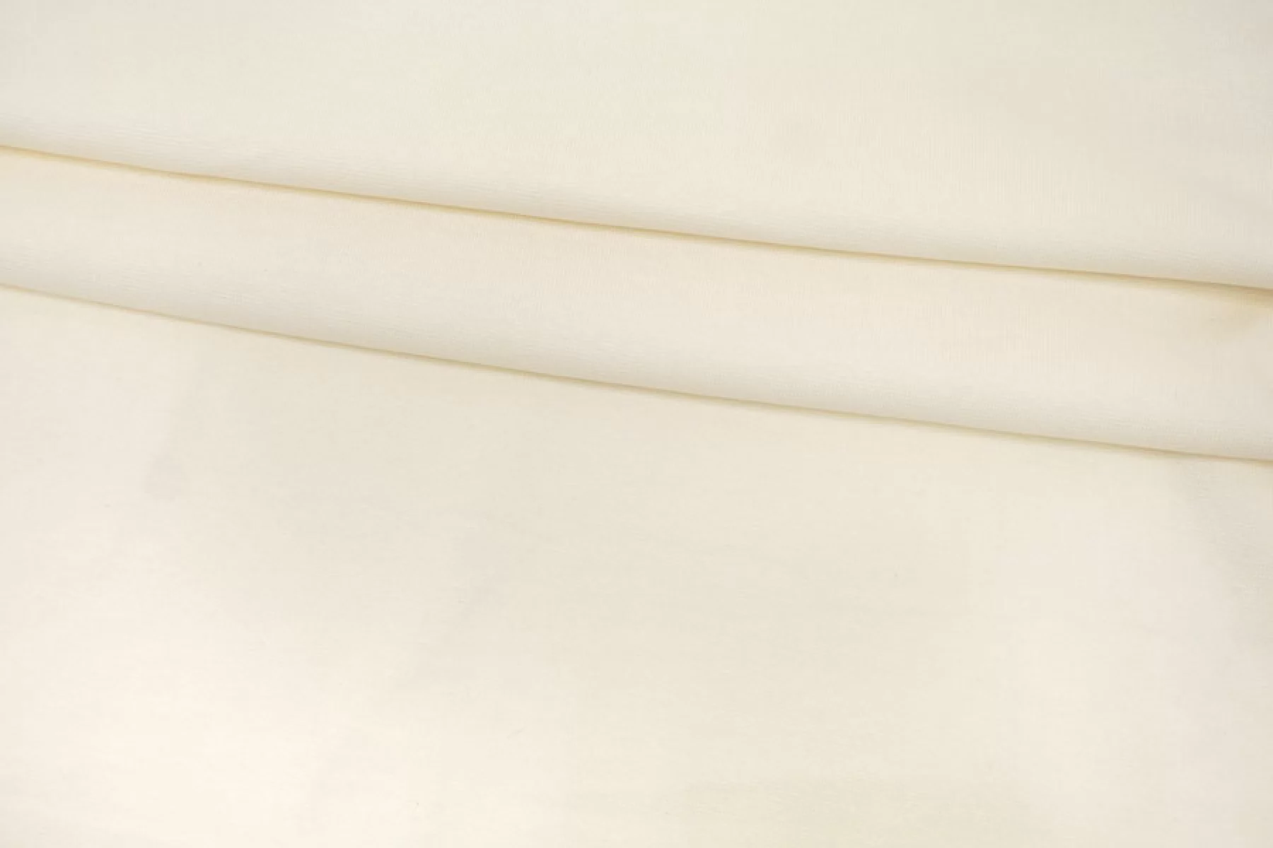 Итальянский хлопковый трикотаж бело-молочного цвета, по вязке ближе к рибане. Материал пластичный, мягкий, гладкий. Плотный, но тонкий. Немного просвечивает. Практически не мнется. Отлично тянется. Подойдет для пошива майки, футболки, топа, а также манжетов, подвязов или воротников.